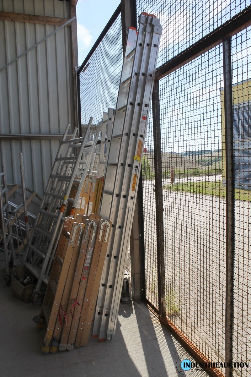 Alu-Schiebeleiter 3-teilig, 3x10 Tritte, bis Leiterlänge 7 m, Bj. 20, 3 Holzklappleitern je 4 Tritte
