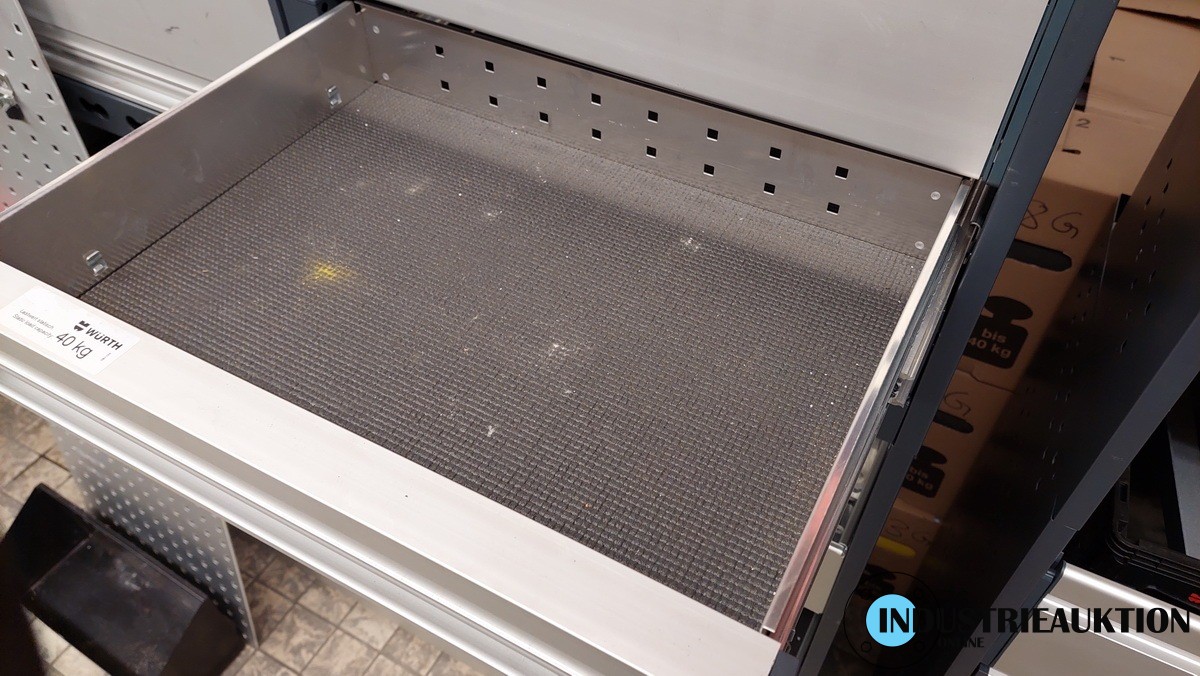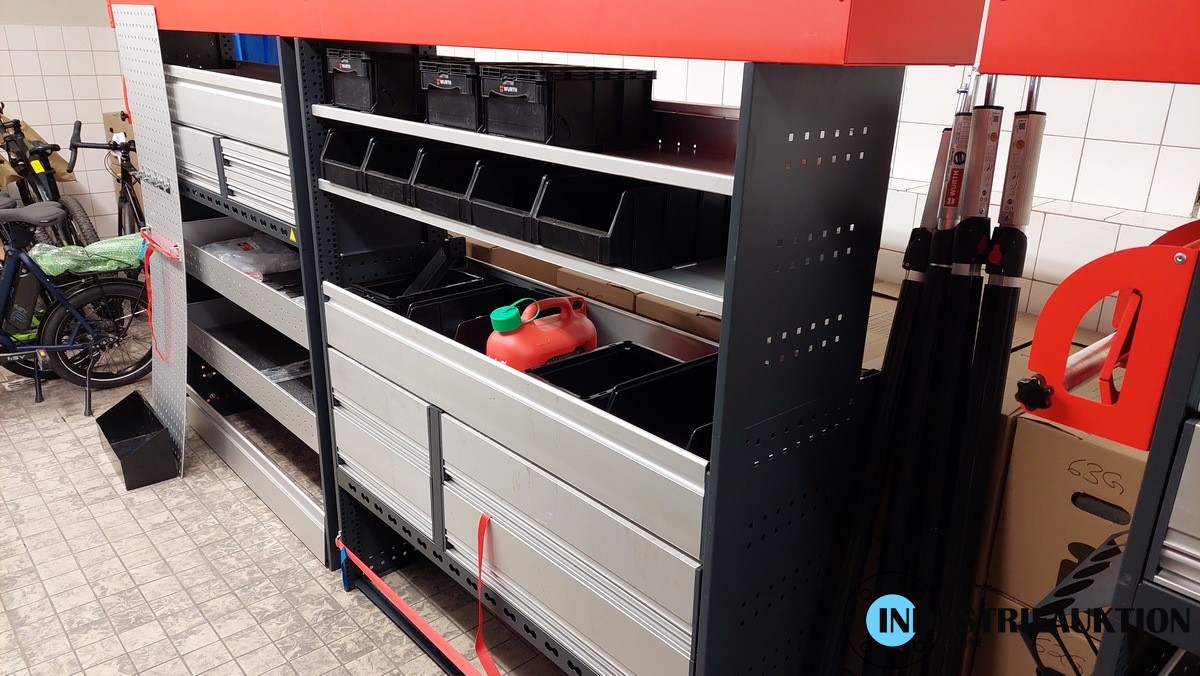 Fahrzeugregale WÜRTH, 2 St., aus Sprinter lang/hoch, 2 Modulblöcke mit Schubladen, jeweils B=ca. 140cm, H=166cm, 2x Dosenhalter, Papierabroller, Rasterwand, Langgutwanne, Wasserkanister mit Halter, Stapelkästen, 4 WÜRTH-Spannstangen, Montagematerial, neuwertig, aus 2024, NP ca. 3.600€