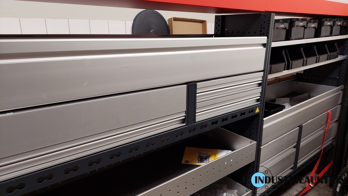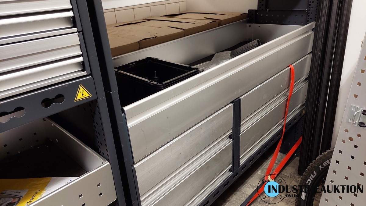 Fahrzeugregale WÜRTH, 2 St., aus Sprinter lang/hoch, 2 Modulblöcke mit Schubladen, jeweils B=ca. 140cm, H=166cm, 2x Dosenhalter, Papierabroller, Rasterwand, Langgutwanne, Wasserkanister mit Halter, Stapelkästen, 4 WÜRTH-Spannstangen, Montagematerial, neuwertig, aus 2024, NP ca. 3.600€