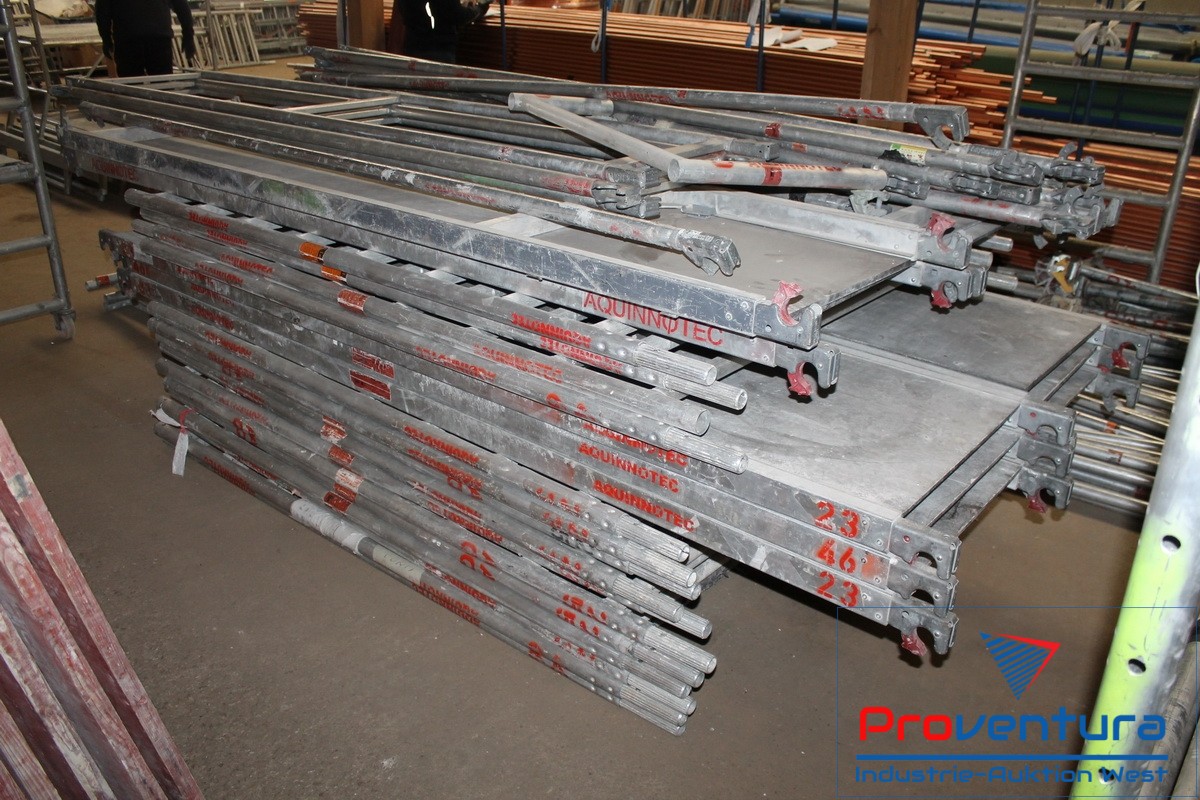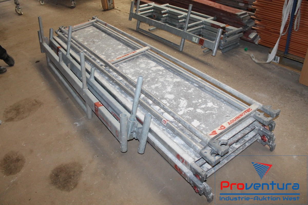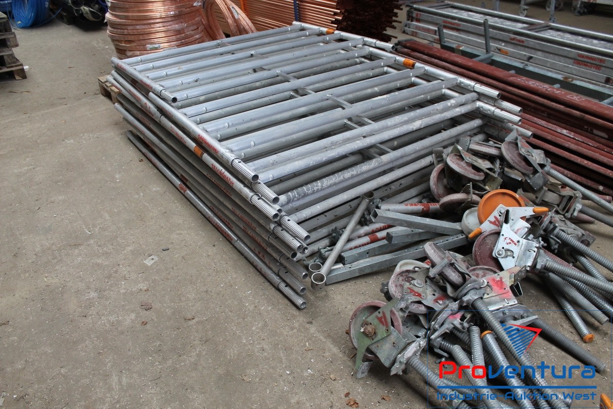 Gerüst LAYHER Uni Breit, mit 2x Fahrbalken verstellbar, insgesamt 8 Rollen, 23x Rahmen 150/8, 12x 150/4, 16 Streben diagonal 3.35, 3x Rückenlehne 285 cm, 14 Brücken 285 cm, 22 Geländer 285 cm, 1x Basisrohr