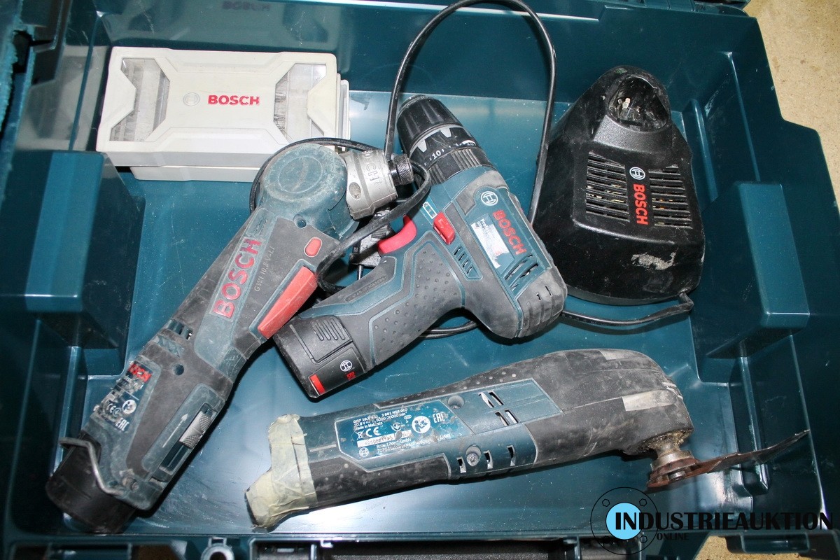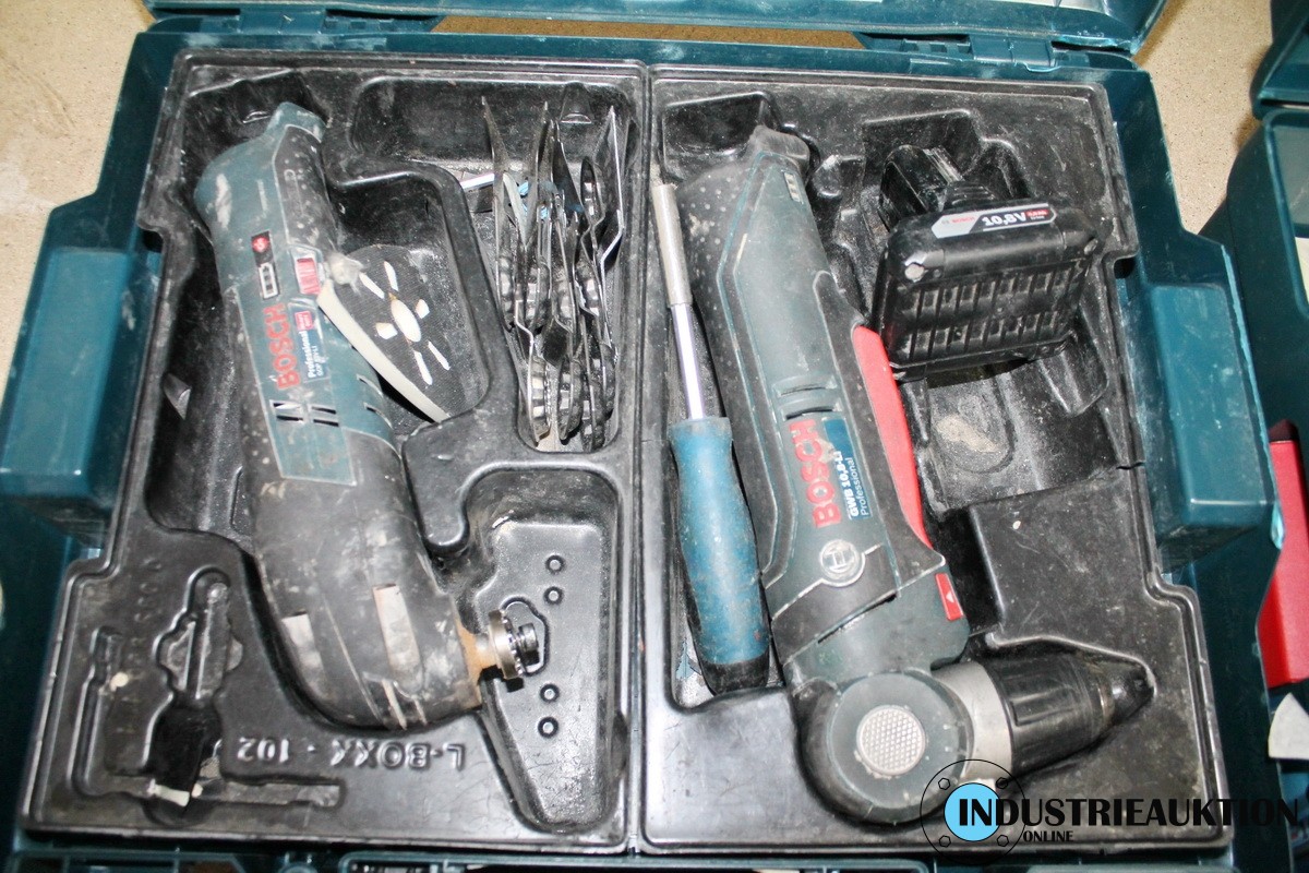 Koffer mit Multitool BOSCH GOP 10.8, Akkuschrauber sowie Winkelschrauber GWI 10.8, 2 Akkus, Ladgerät sowie Akku-Multitool, weiterer Akku-Winkelschrauber