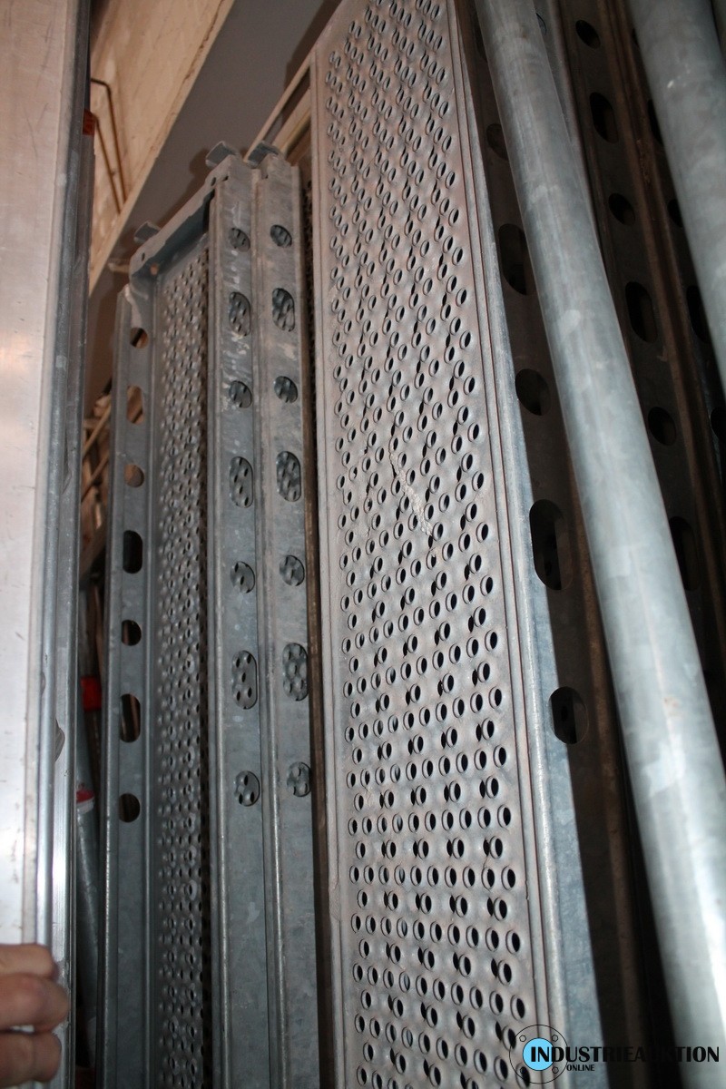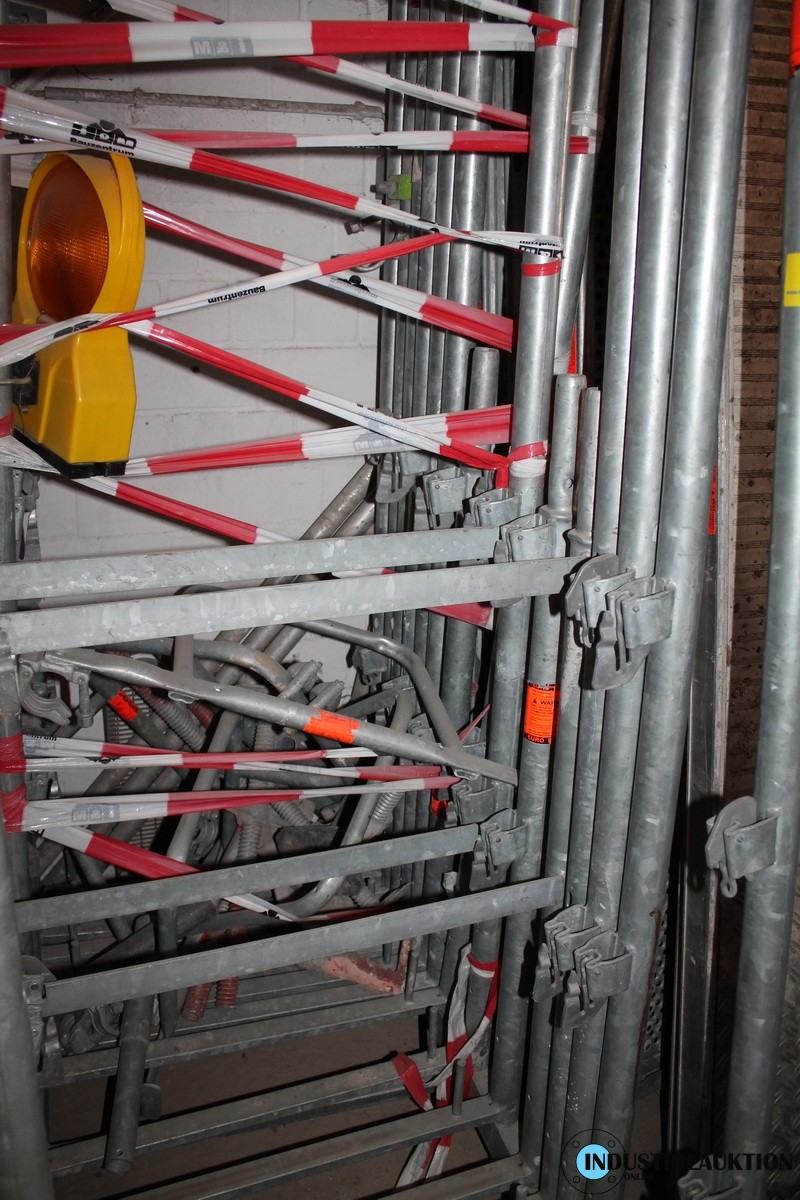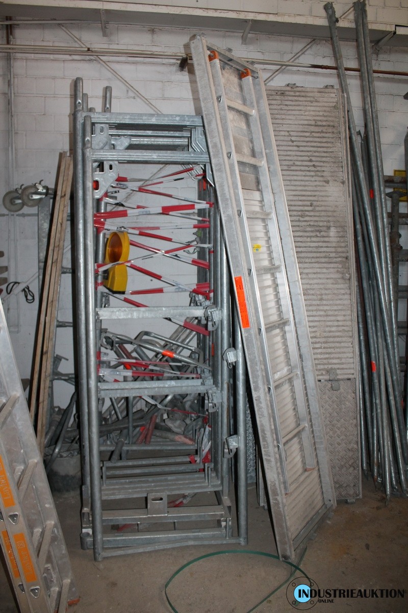 Layher Blitzgerüst Stahl. Verzinkt, 12 senkrechte 75x200 cm, 3 St. 75x100 cm, Querverstrebung, ca. 12 Stahlböden 300x250 cm, 3 St. Aluminiumbrücken mit Durchstieg