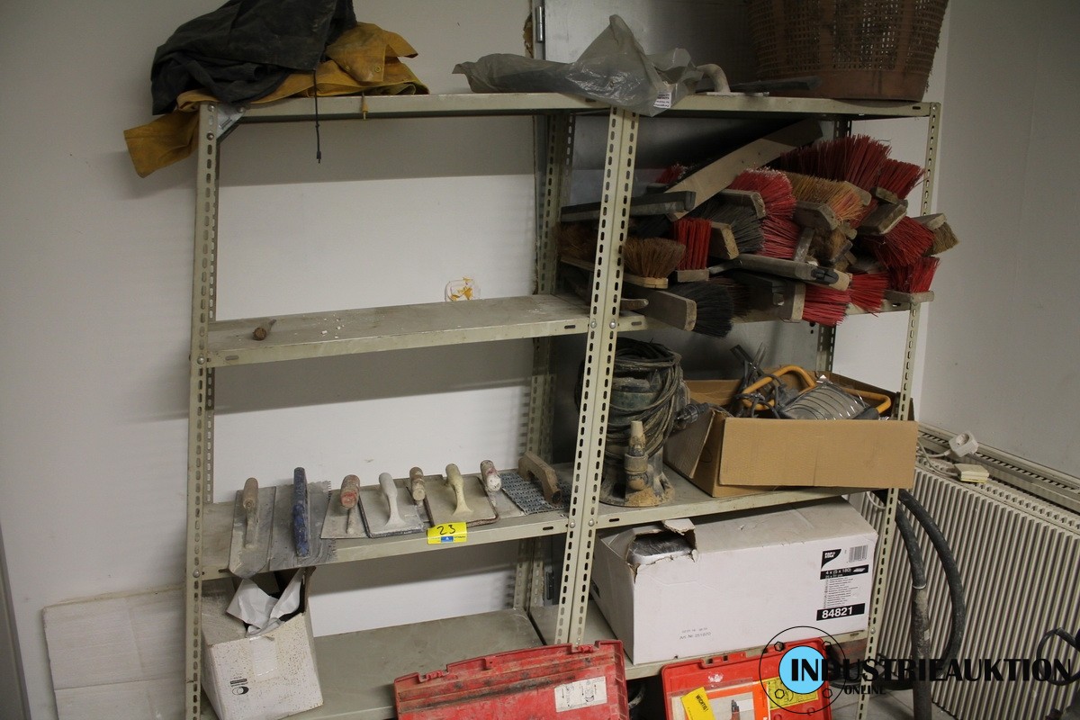 Metallregal, 2 St., verbogen, Inhalt: diverse Besen, Kleinteile, Tauchpumpe, Baustellenstrahler, Betonrüttler defekt