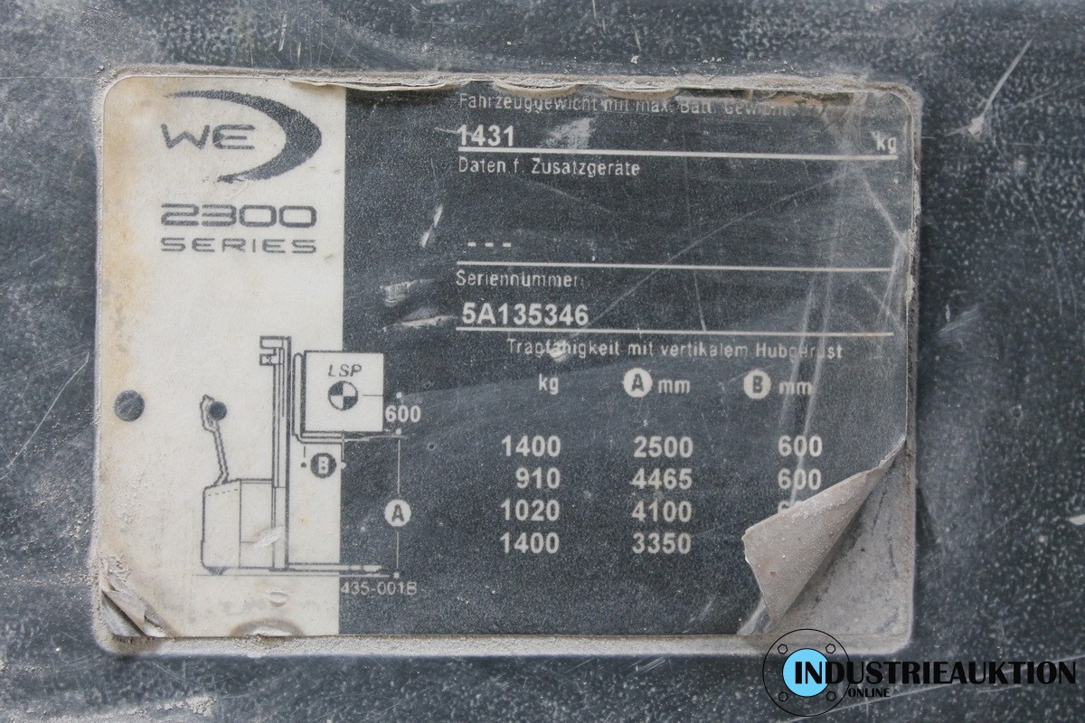 Mitfahrstapler CROWN WE 2300, S/N 5A135346, Batterie leer, B/h nicht bekannt, Triplexmast, Tragkraft 1.4 t