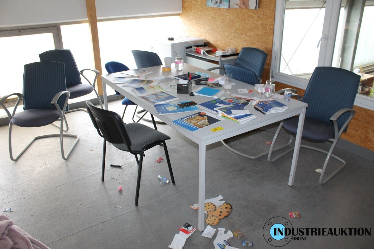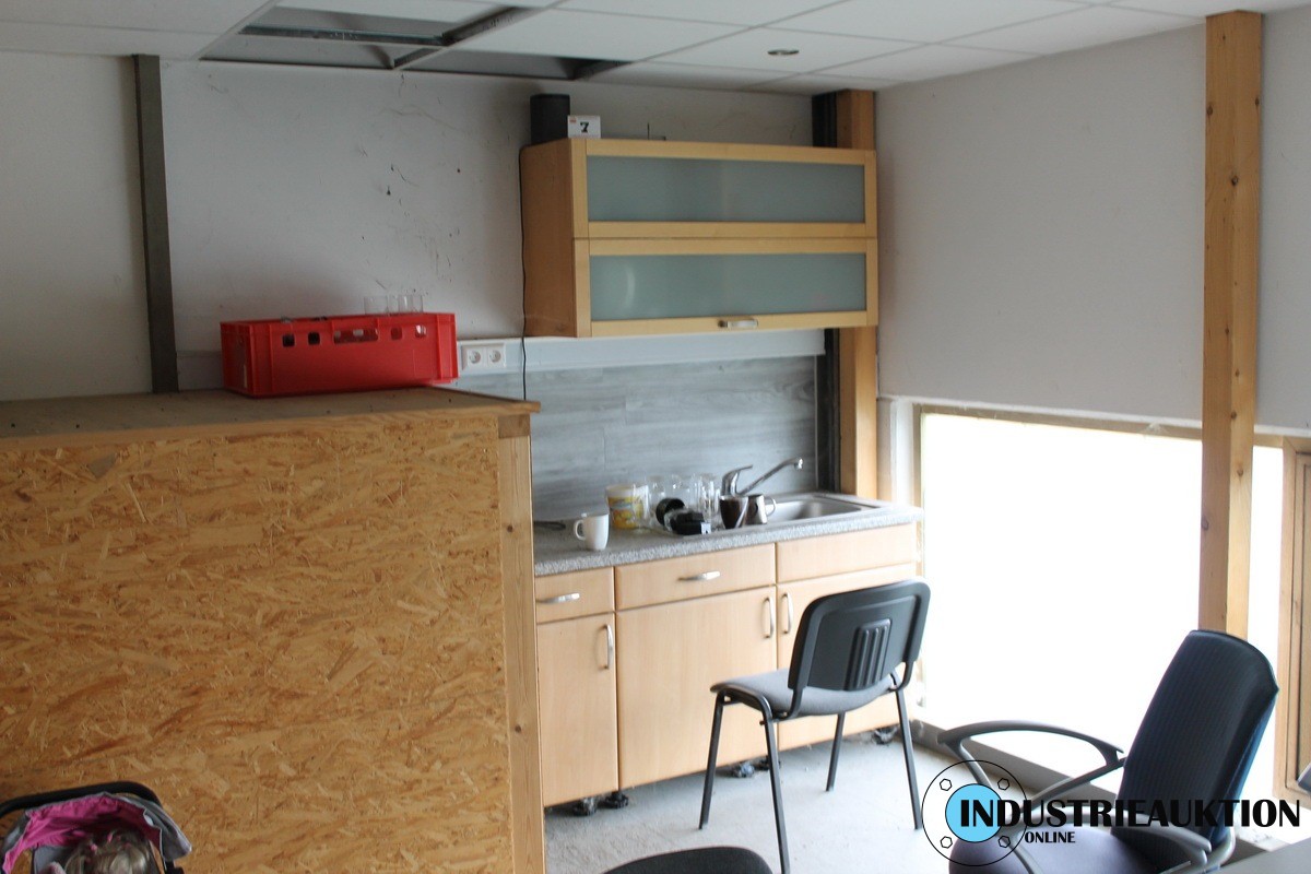 Mobiliar Aufenthaltsraum, Tisch, 8 Stühle, Haushaltskühlschrank, Küchenschränke