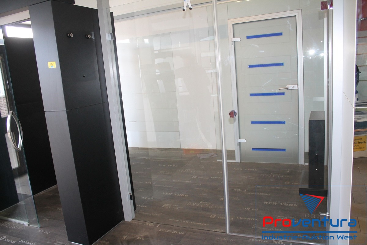 | Musterstand DORMA, mit Schiebetür, Öffnung ca. H-202cm, B-132 cm, Türelement ca. 75 cm, Festelement ca. 60 cm, Duschabtrennung, B-ca. 180cm, H- ca. 201 cm, Türbreite ca. 80 cm, Glastür 83x197 cm |