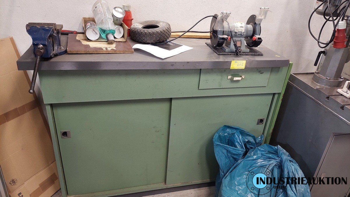 Schleifbock, Schraubstock, auf Holzschrank