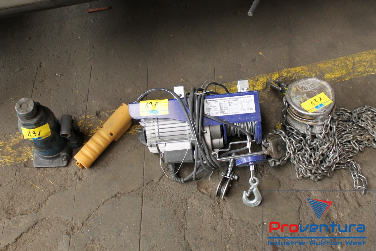 Seilhebezug PROMAT, Bj. 18, el., Tragkraft 400/200 kg, Hubhöhe 6/12 m, Geschwindigkeit 4/8 m/min, Handkettenzug YALE, hydraulischer Wagenheber