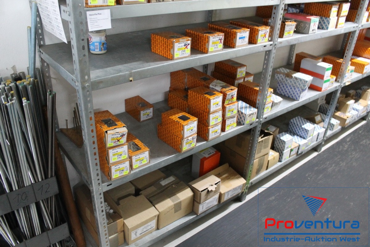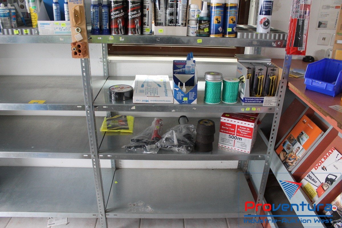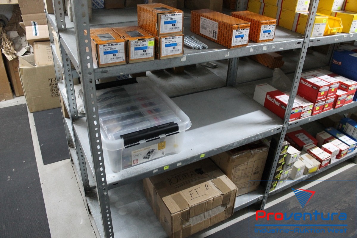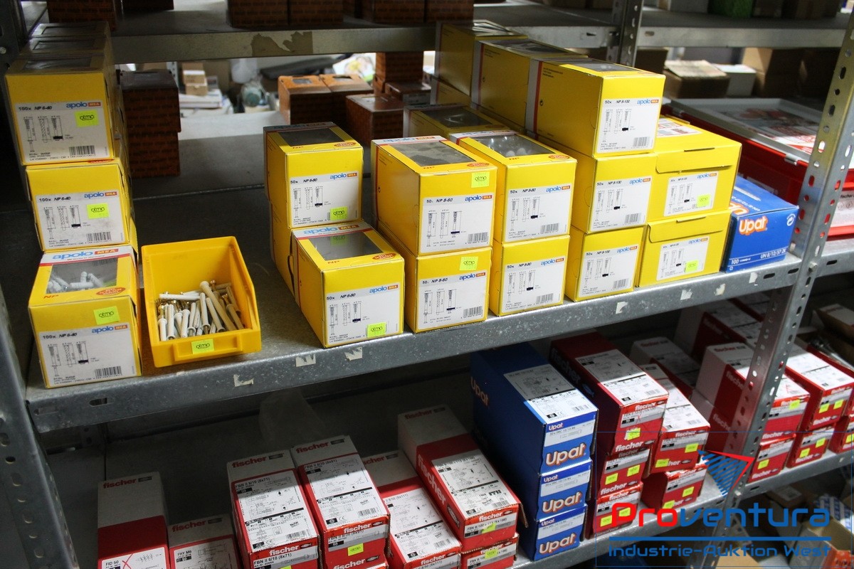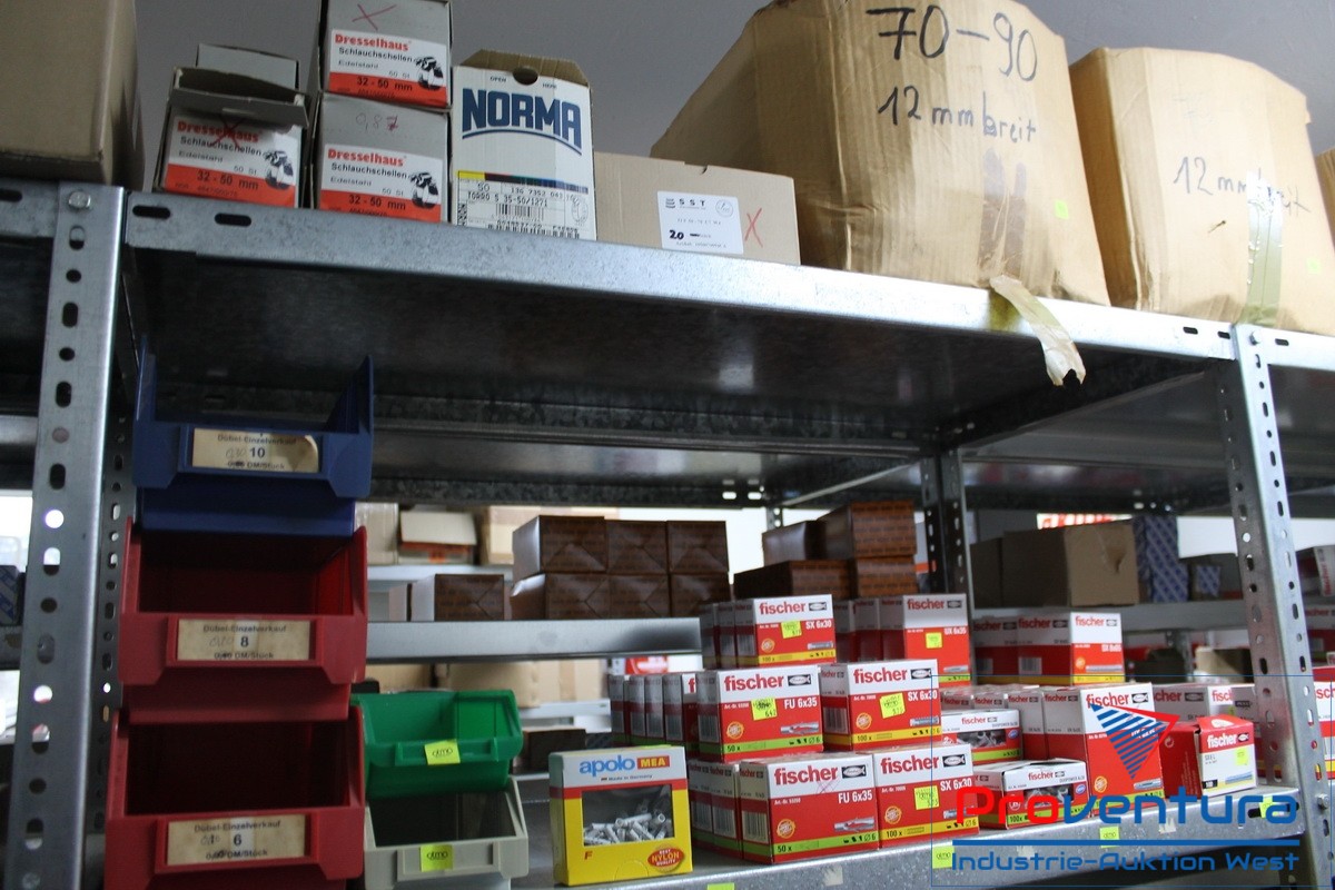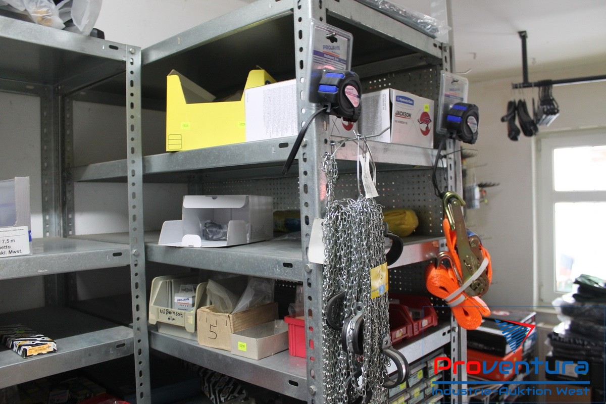 Warenbestände, lagernd in 49 Regalen, Schweißdraht, Bohrer, Sägeblätter, Werkzeug, Wasserwagen, Ketten, Spanngurte, Drahtbürsten, Stecknüsse, Feilen, Imbusschlüssel, Meißel, Metallwinkel, div. Lochwinkel, Winkelverbinder, Muttern, Sicherungsmuttern, Gewindestangen, Blechschrauben, Unterlegscheiben, Federringe, Schrauben, teilw, Edelstahl, Dübel FISCHER und UPAT, Nägel, Trennscheiben, Schleifbänder, Handschuhe in div. Ausführungen und Größen, Kabelbinder, Gehörschutz, Schellen, 120 l Frostschutzmittel, Einschlagmuttern, Bauschaum, Lecksuchspray, Pistolenschaum, Schmiermittel, Markierungsspray, Schraubensicherung, Bohr- und Schneidöl, Silikon, Kriechöl, Bremsenreiniger, Maurerschnur, teilw. in Sortimentskästen, Toilettenpapier, Werbemittel, Umfang siehe Fotos und Video, die als PDF hinterlegte Inventurliste zeigt nur die Art der Artikel, Vollständigkeit kann nicht gewährleistet werden. Kunde muss pünktlich zur Abholung erscheinen um das Regal auszuräumen.