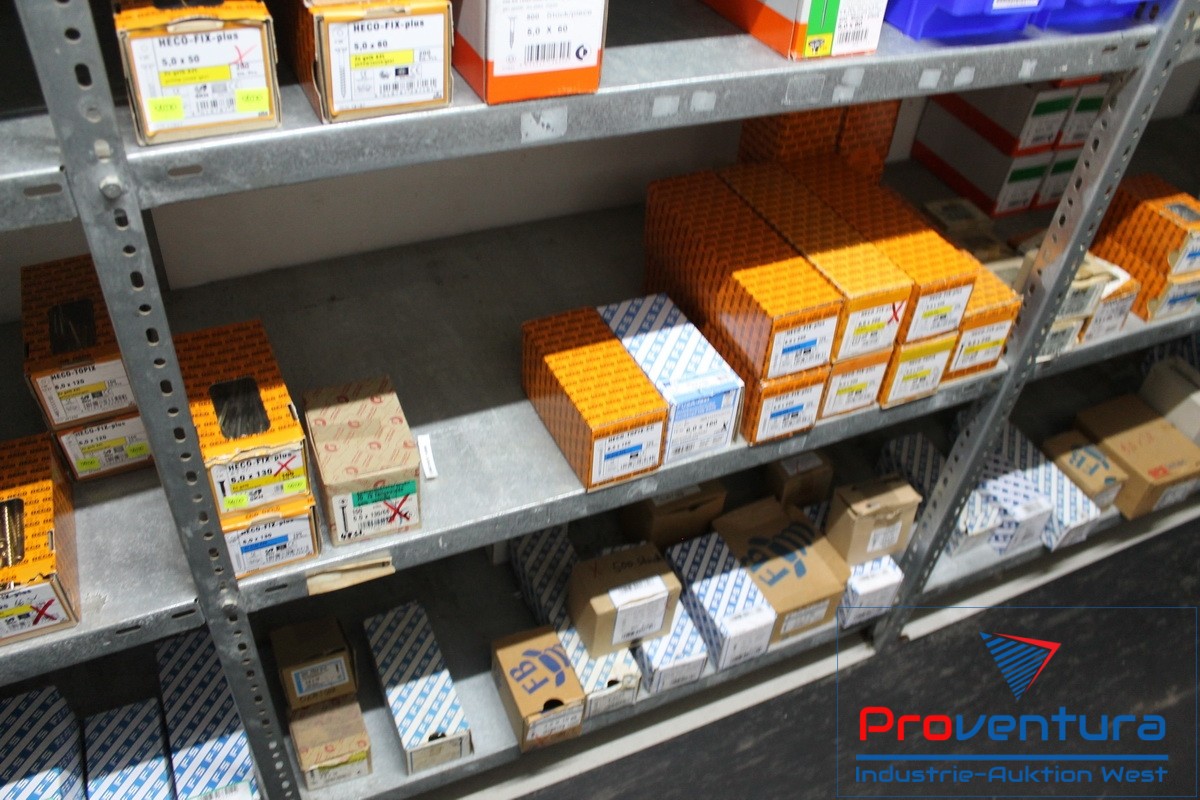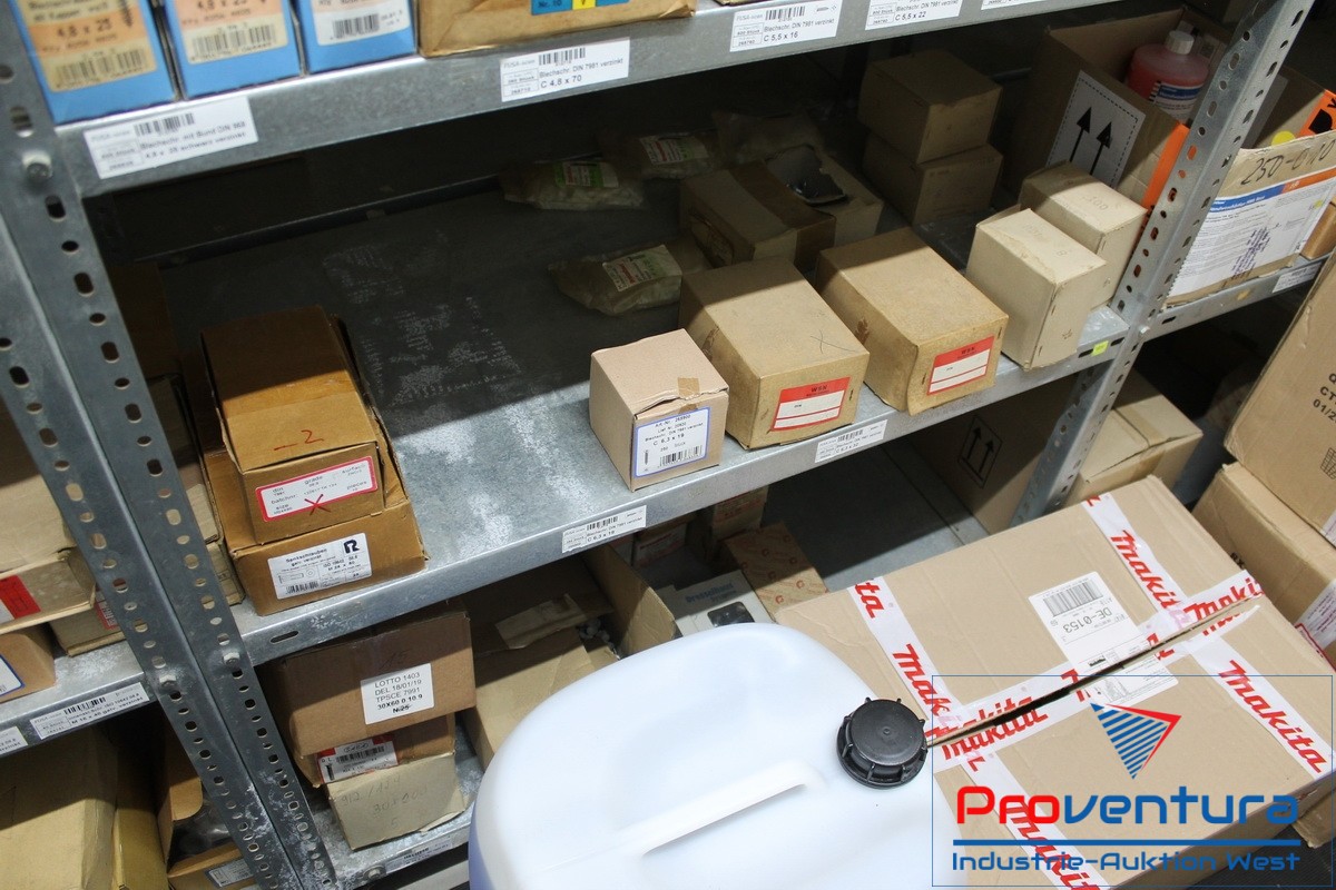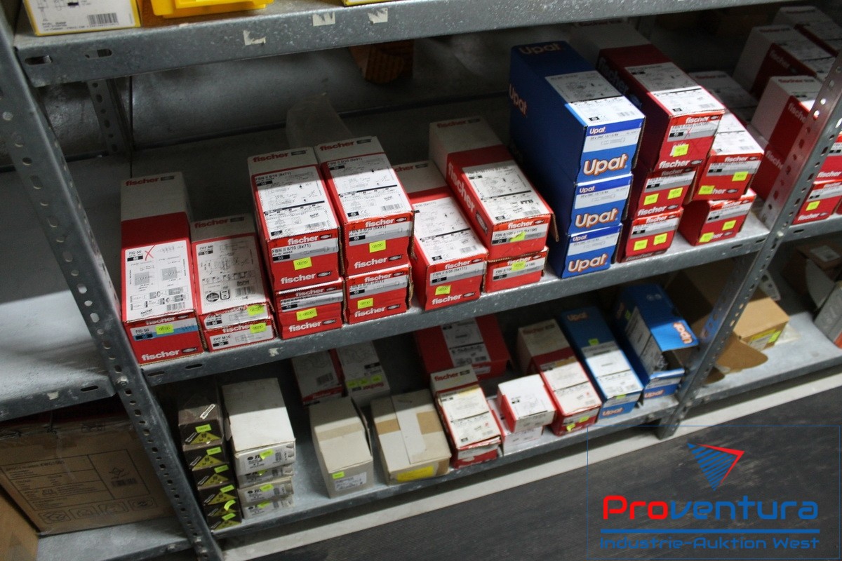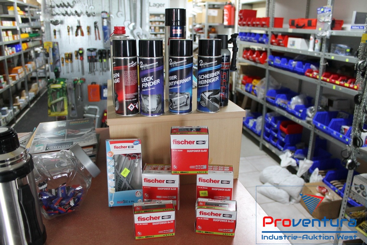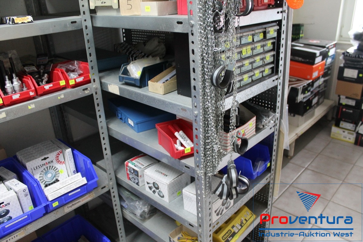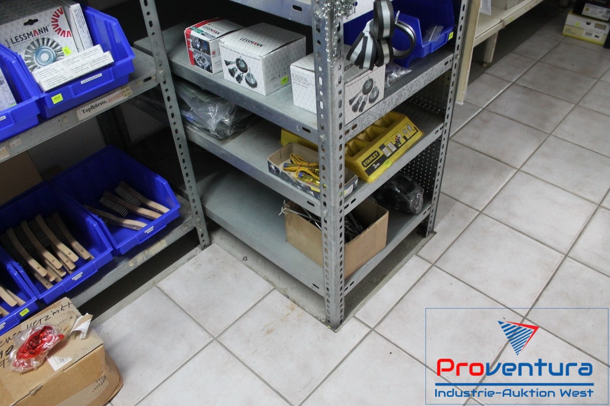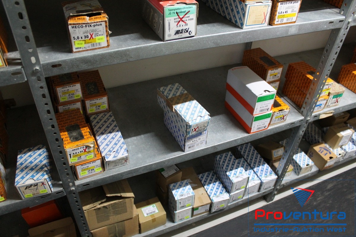 Warenbestände, lagernd in 49 Regalen, Schweißdraht, Bohrer, Sägeblätter, Werkzeug, Wasserwagen, Ketten, Spanngurte, Drahtbürsten, Stecknüsse, Feilen, Imbusschlüssel, Meißel, Metallwinkel, div. Lochwinkel, Winkelverbinder, Muttern, Sicherungsmuttern, Gewindestangen, Blechschrauben, Unterlegscheiben, Federringe, Schrauben, teilw, Edelstahl, Dübel FISCHER und UPAT, Nägel, Trennscheiben, Schleifbänder, Handschuhe in div. Ausführungen und Größen, Kabelbinder, Gehörschutz, Schellen, 120 l Frostschutzmittel, Einschlagmuttern, Bauschaum, Lecksuchspray, Pistolenschaum, Schmiermittel, Markierungsspray, Schraubensicherung, Bohr- und Schneidöl, Silikon, Kriechöl, Bremsenreiniger, Maurerschnur, teilw. in Sortimentskästen, Toilettenpapier, Werbemittel, Umfang siehe Fotos und Video, die als PDF hinterlegte Inventurliste zeigt nur die Art der Artikel, Vollständigkeit kann nicht gewährleistet werden. Kunde muss pünktlich zur Abholung erscheinen um das Regal auszuräumen.