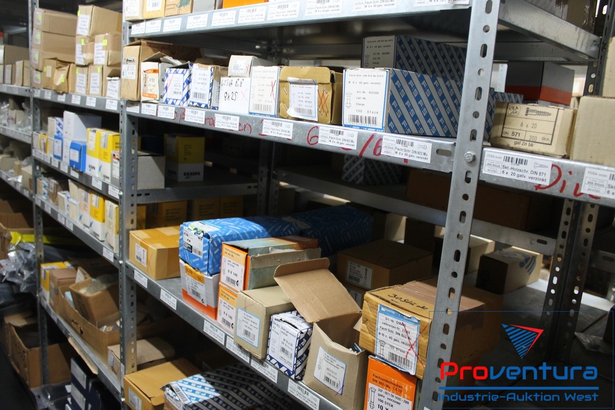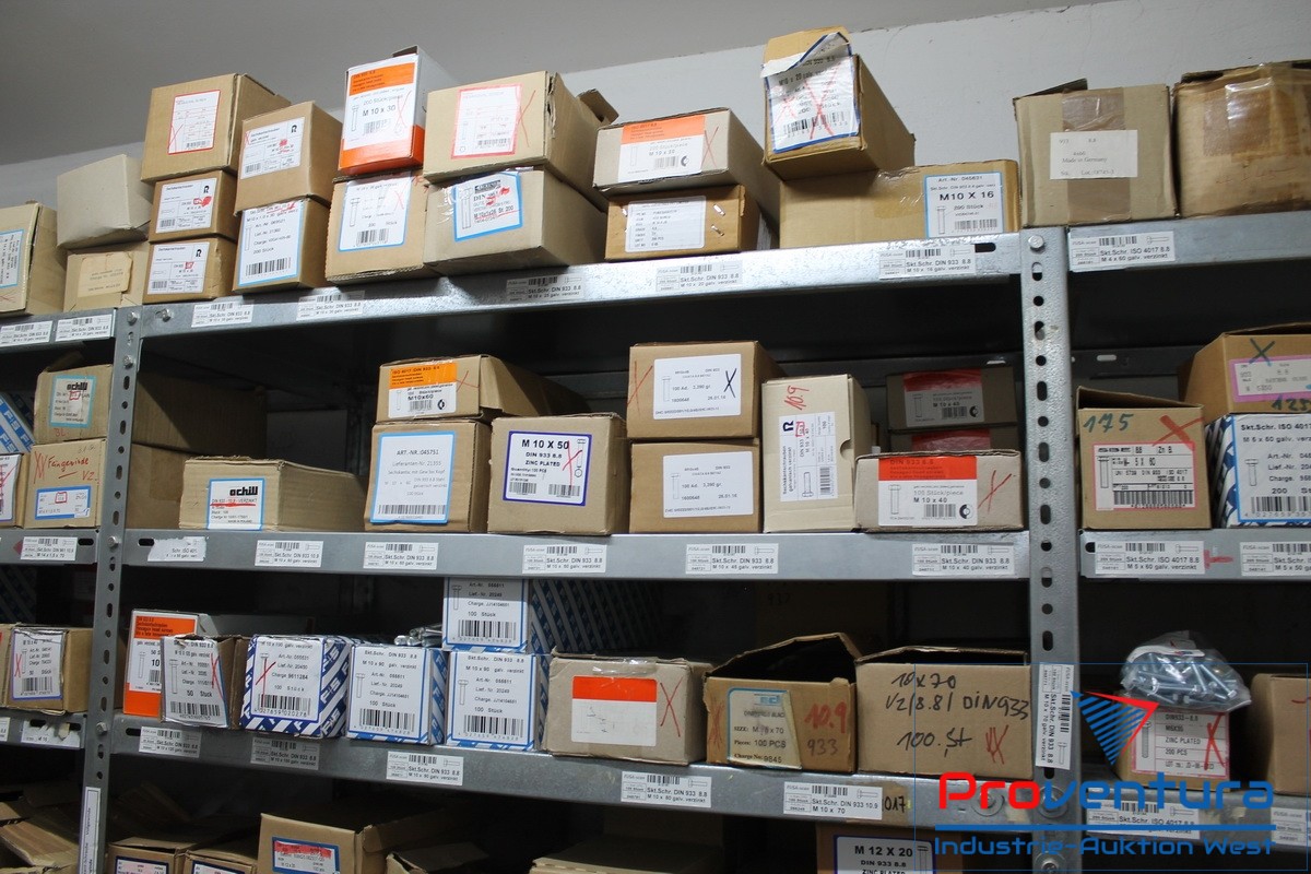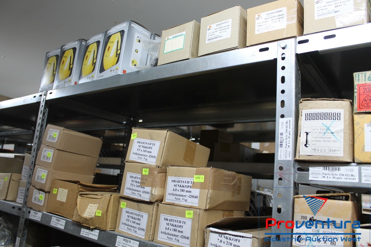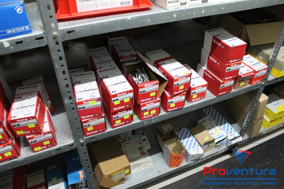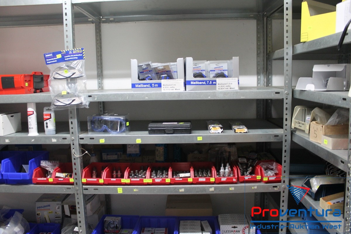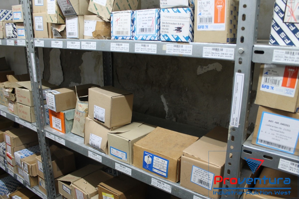 Warenbestände, lagernd in 49 Regalen, Schweißdraht, Bohrer, Sägeblätter, Werkzeug, Wasserwagen, Ketten, Spanngurte, Drahtbürsten, Stecknüsse, Feilen, Imbusschlüssel, Meißel, Metallwinkel, div. Lochwinkel, Winkelverbinder, Muttern, Sicherungsmuttern, Gewindestangen, Blechschrauben, Unterlegscheiben, Federringe, Schrauben, teilw, Edelstahl, Dübel FISCHER und UPAT, Nägel, Trennscheiben, Schleifbänder, Handschuhe in div. Ausführungen und Größen, Kabelbinder, Gehörschutz, Schellen, 120 l Frostschutzmittel, Einschlagmuttern, Bauschaum, Lecksuchspray, Pistolenschaum, Schmiermittel, Markierungsspray, Schraubensicherung, Bohr- und Schneidöl, Silikon, Kriechöl, Bremsenreiniger, Maurerschnur, teilw. in Sortimentskästen, Toilettenpapier, Werbemittel, Umfang siehe Fotos und Video, die als PDF hinterlegte Inventurliste zeigt nur die Art der Artikel, Vollständigkeit kann nicht gewährleistet werden. Kunde muss pünktlich zur Abholung erscheinen um das Regal auszuräumen.