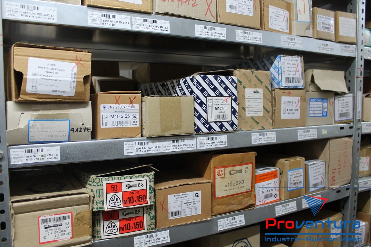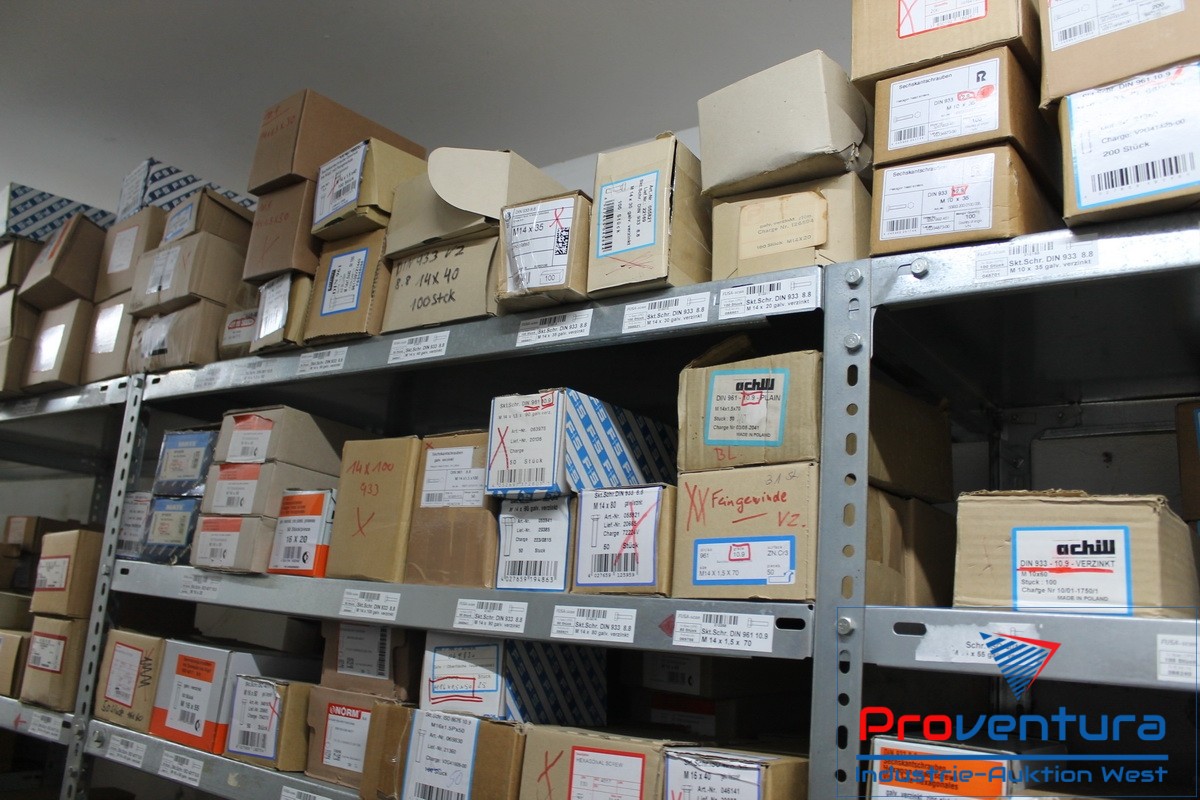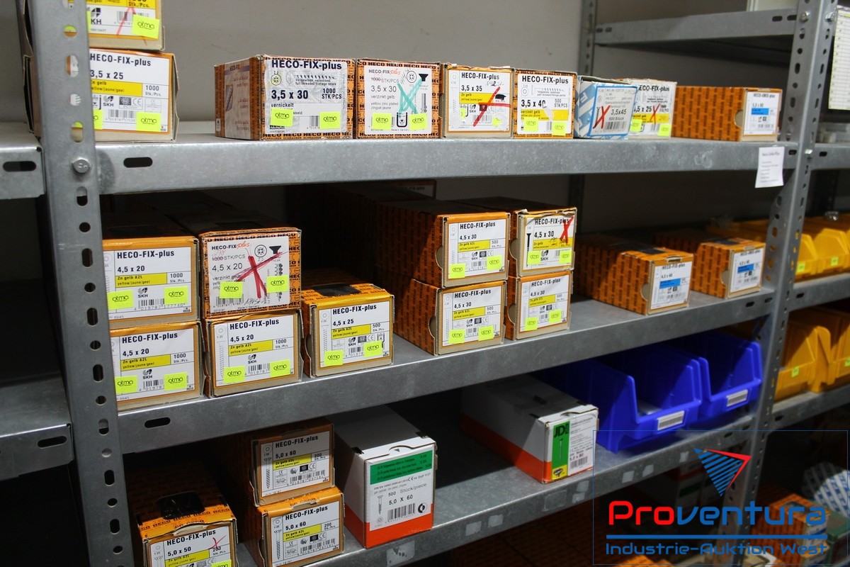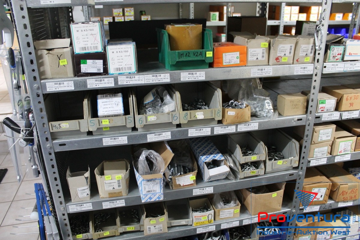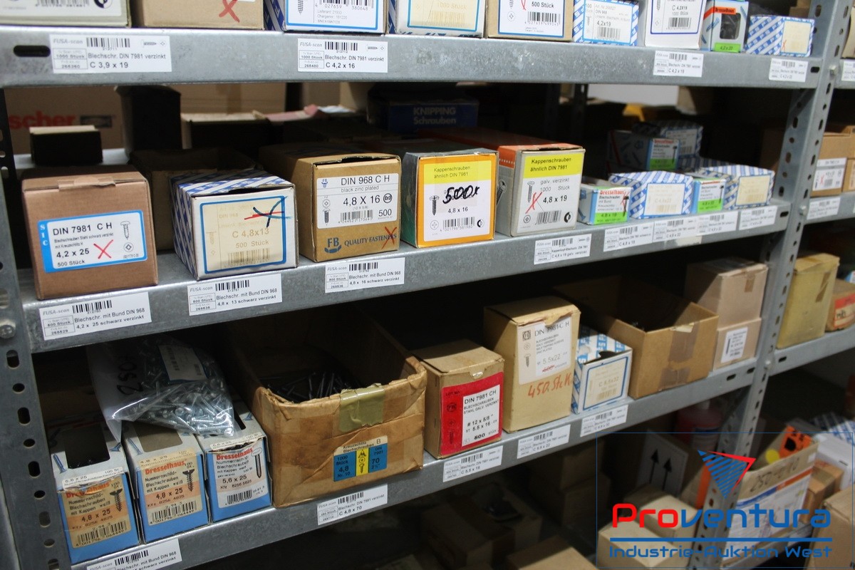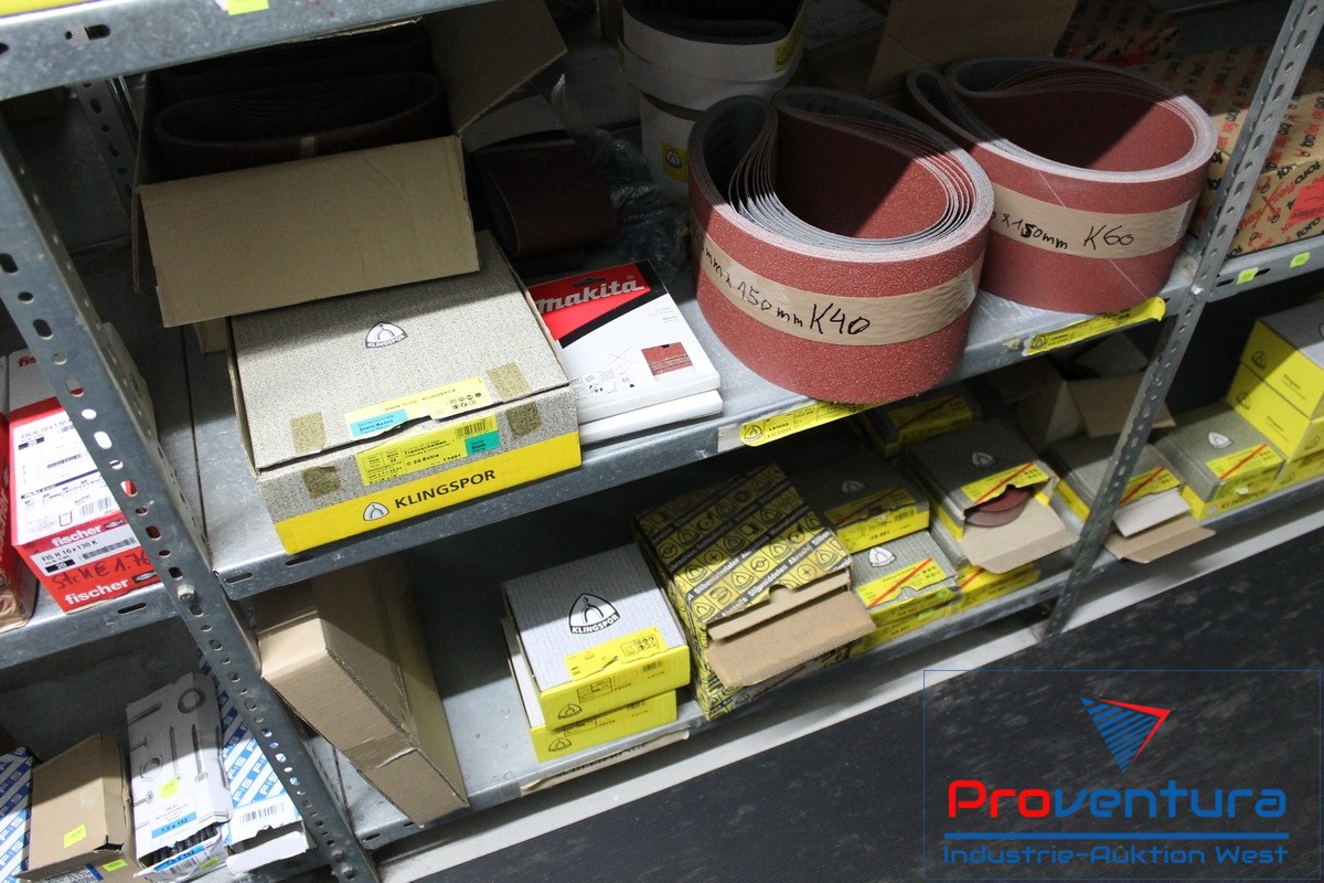 Warenbestände, lagernd in 49 Regalen, Schweißdraht, Bohrer, Sägeblätter, Werkzeug, Wasserwagen, Ketten, Spanngurte, Drahtbürsten, Stecknüsse, Feilen, Imbusschlüssel, Meißel, Metallwinkel, div. Lochwinkel, Winkelverbinder, Muttern, Sicherungsmuttern, Gewindestangen, Blechschrauben, Unterlegscheiben, Federringe, Schrauben, teilw, Edelstahl, Dübel FISCHER und UPAT, Nägel, Trennscheiben, Schleifbänder, Handschuhe in div. Ausführungen und Größen, Kabelbinder, Gehörschutz, Schellen, 120 l Frostschutzmittel, Einschlagmuttern, Bauschaum, Lecksuchspray, Pistolenschaum, Schmiermittel, Markierungsspray, Schraubensicherung, Bohr- und Schneidöl, Silikon, Kriechöl, Bremsenreiniger, Maurerschnur, teilw. in Sortimentskästen, Toilettenpapier, Werbemittel, Umfang siehe Fotos und Video, die als PDF hinterlegte Inventurliste zeigt nur die Art der Artikel, Vollständigkeit kann nicht gewährleistet werden. Kunde muss pünktlich zur Abholung erscheinen um das Regal auszuräumen.