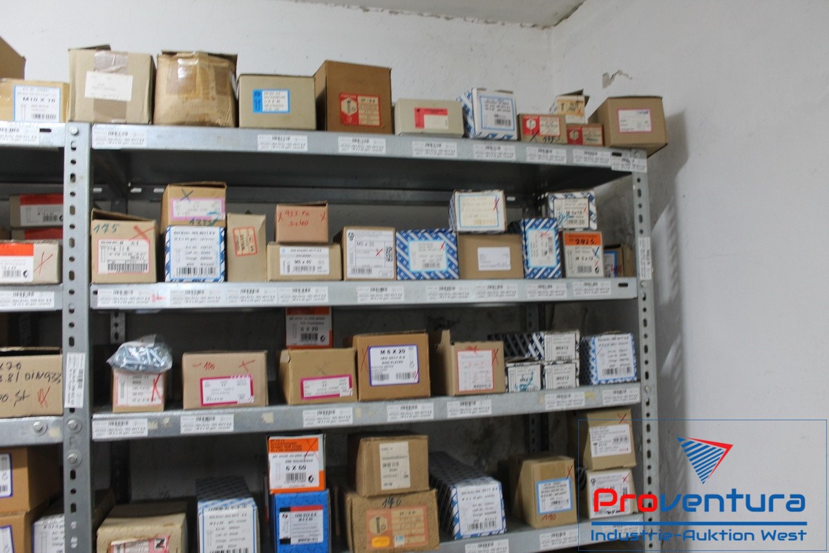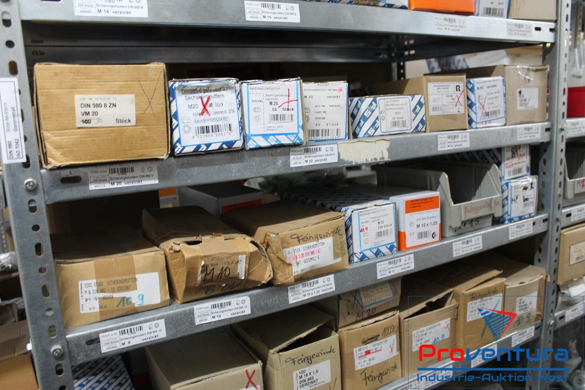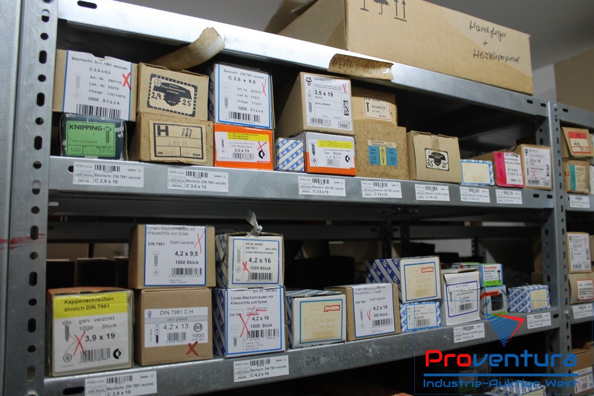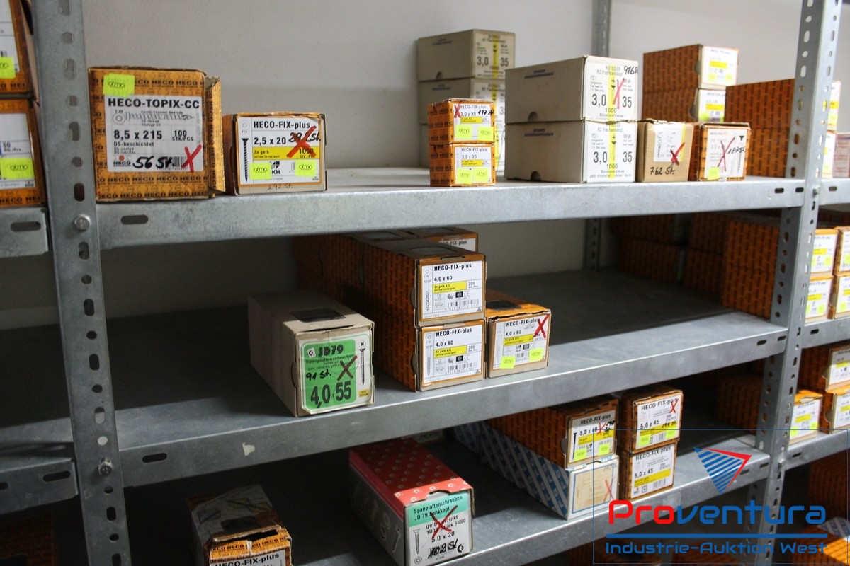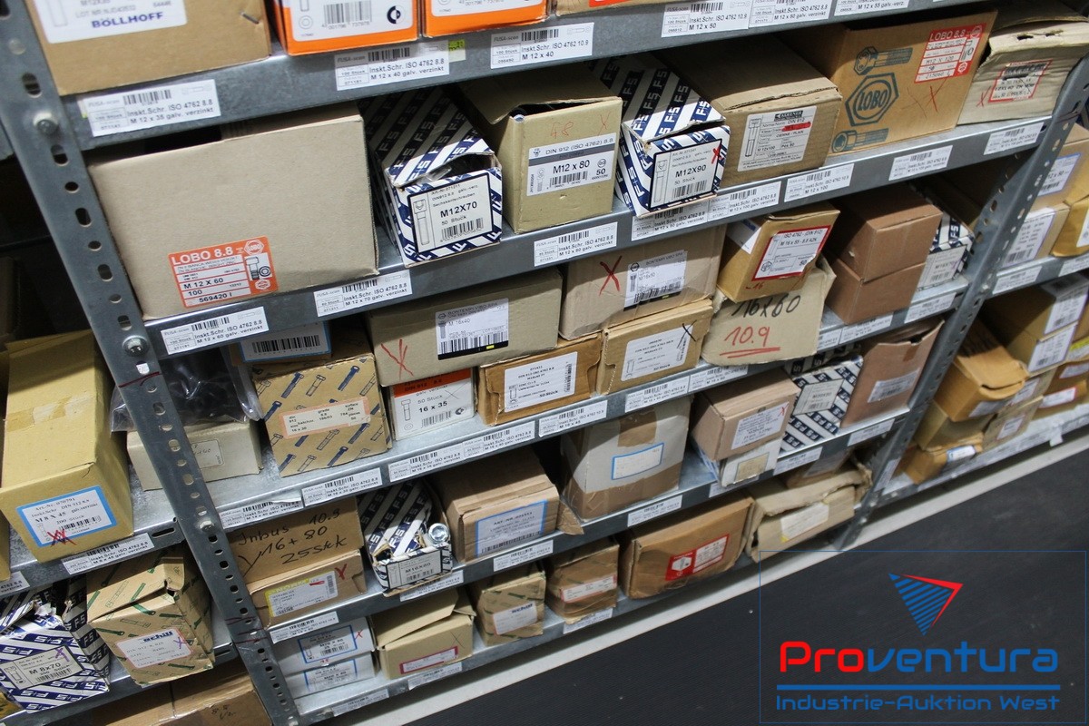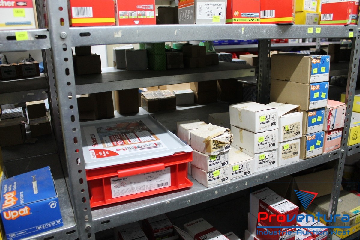 Warenbestände, lagernd in 49 Regalen, Schweißdraht, Bohrer, Sägeblätter, Werkzeug, Wasserwagen, Ketten, Spanngurte, Drahtbürsten, Stecknüsse, Feilen, Imbusschlüssel, Meißel, Metallwinkel, div. Lochwinkel, Winkelverbinder, Muttern, Sicherungsmuttern, Gewindestangen, Blechschrauben, Unterlegscheiben, Federringe, Schrauben, teilw, Edelstahl, Dübel FISCHER und UPAT, Nägel, Trennscheiben, Schleifbänder, Handschuhe in div. Ausführungen und Größen, Kabelbinder, Gehörschutz, Schellen, 120 l Frostschutzmittel, Einschlagmuttern, Bauschaum, Lecksuchspray, Pistolenschaum, Schmiermittel, Markierungsspray, Schraubensicherung, Bohr- und Schneidöl, Silikon, Kriechöl, Bremsenreiniger, Maurerschnur, teilw. in Sortimentskästen, Toilettenpapier, Werbemittel, Umfang siehe Fotos und Video, die als PDF hinterlegte Inventurliste zeigt nur die Art der Artikel, Vollständigkeit kann nicht gewährleistet werden. Kunde muss pünktlich zur Abholung erscheinen um das Regal auszuräumen.