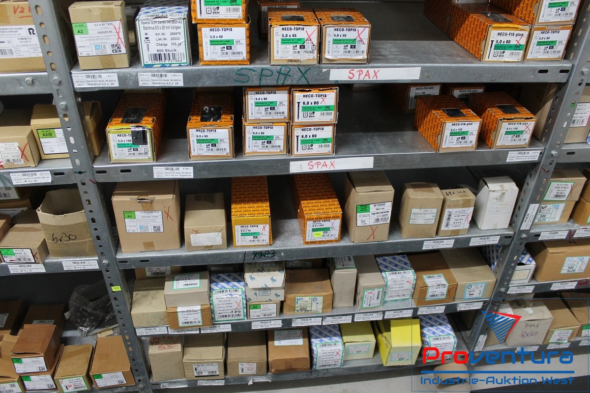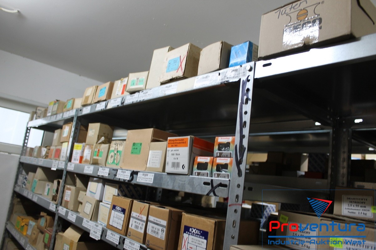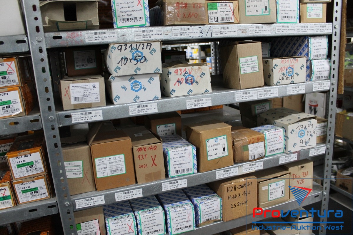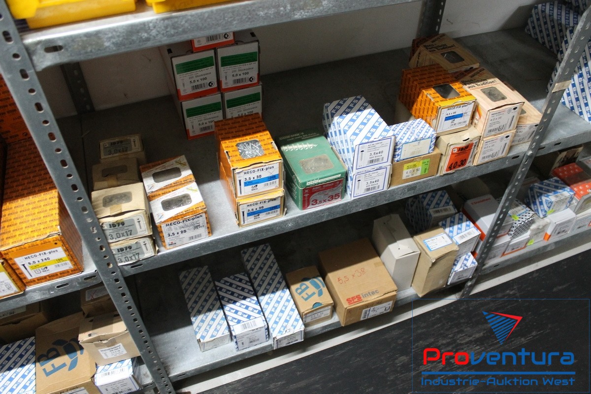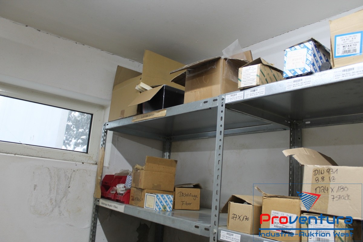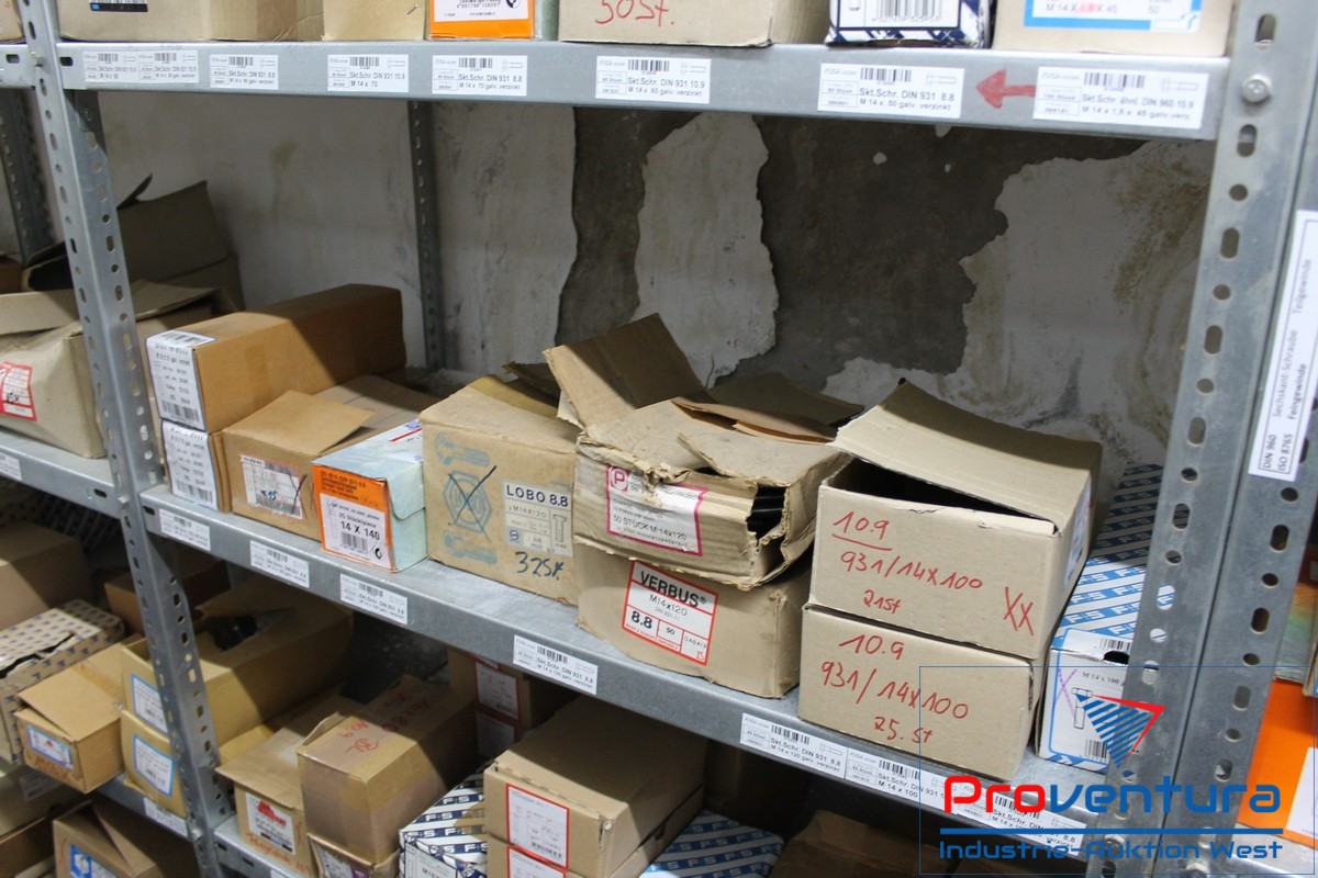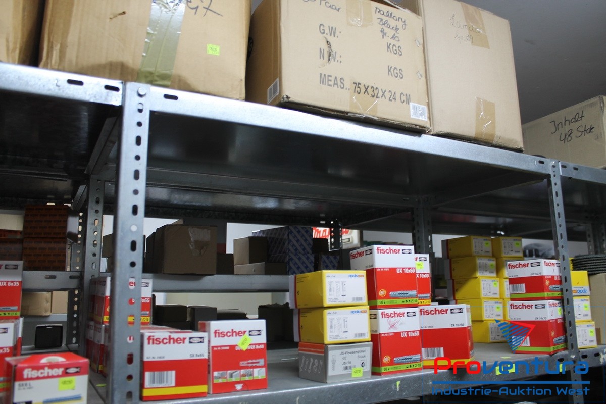 Warenbestände, lagernd in 49 Regalen, Schweißdraht, Bohrer, Sägeblätter, Werkzeug, Wasserwagen, Ketten, Spanngurte, Drahtbürsten, Stecknüsse, Feilen, Imbusschlüssel, Meißel, Metallwinkel, div. Lochwinkel, Winkelverbinder, Muttern, Sicherungsmuttern, Gewindestangen, Blechschrauben, Unterlegscheiben, Federringe, Schrauben, teilw, Edelstahl, Dübel FISCHER und UPAT, Nägel, Trennscheiben, Schleifbänder, Handschuhe in div. Ausführungen und Größen, Kabelbinder, Gehörschutz, Schellen, 120 l Frostschutzmittel, Einschlagmuttern, Bauschaum, Lecksuchspray, Pistolenschaum, Schmiermittel, Markierungsspray, Schraubensicherung, Bohr- und Schneidöl, Silikon, Kriechöl, Bremsenreiniger, Maurerschnur, teilw. in Sortimentskästen, Toilettenpapier, Werbemittel, Umfang siehe Fotos und Video, die als PDF hinterlegte Inventurliste zeigt nur die Art der Artikel, Vollständigkeit kann nicht gewährleistet werden. Kunde muss pünktlich zur Abholung erscheinen um das Regal auszuräumen.