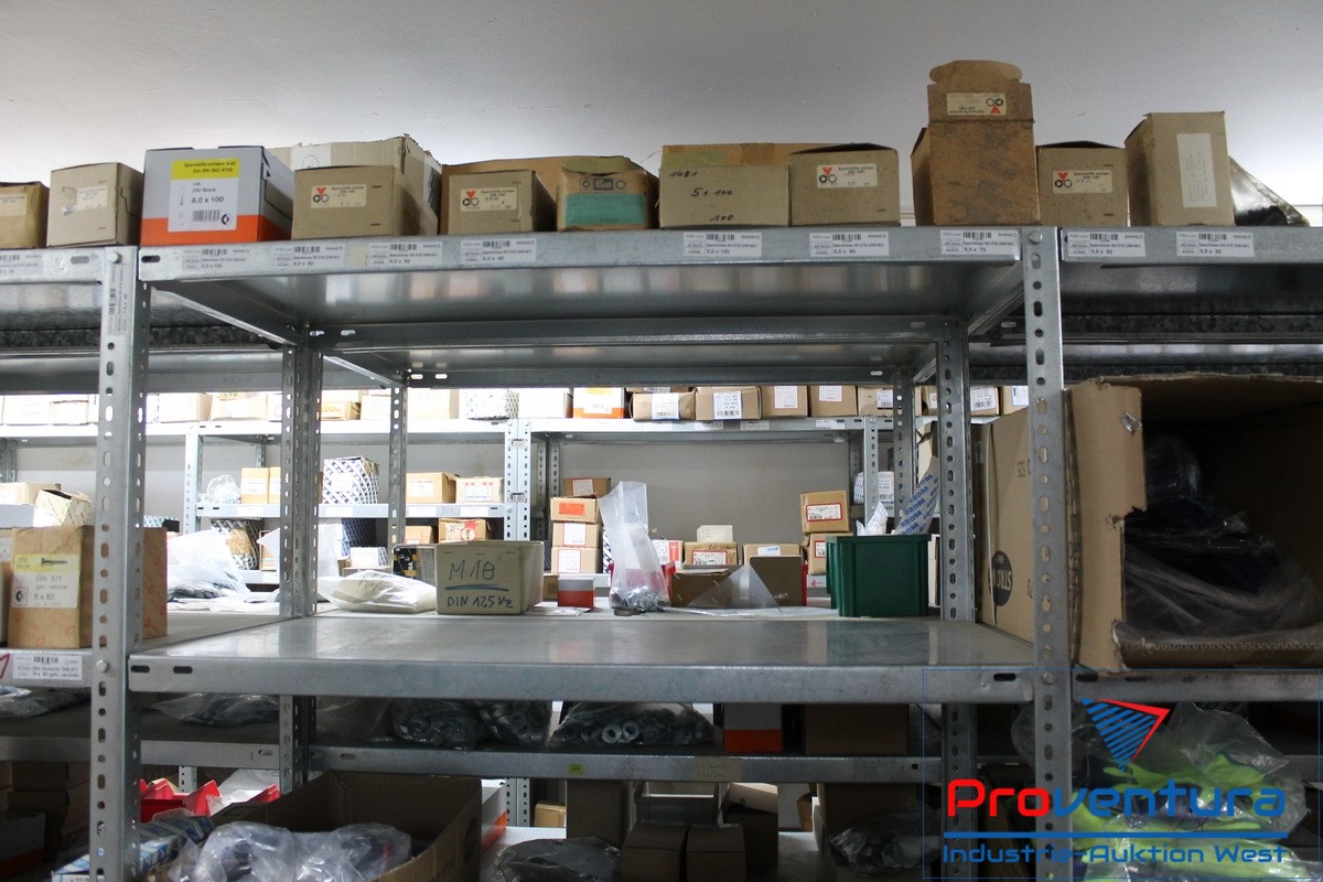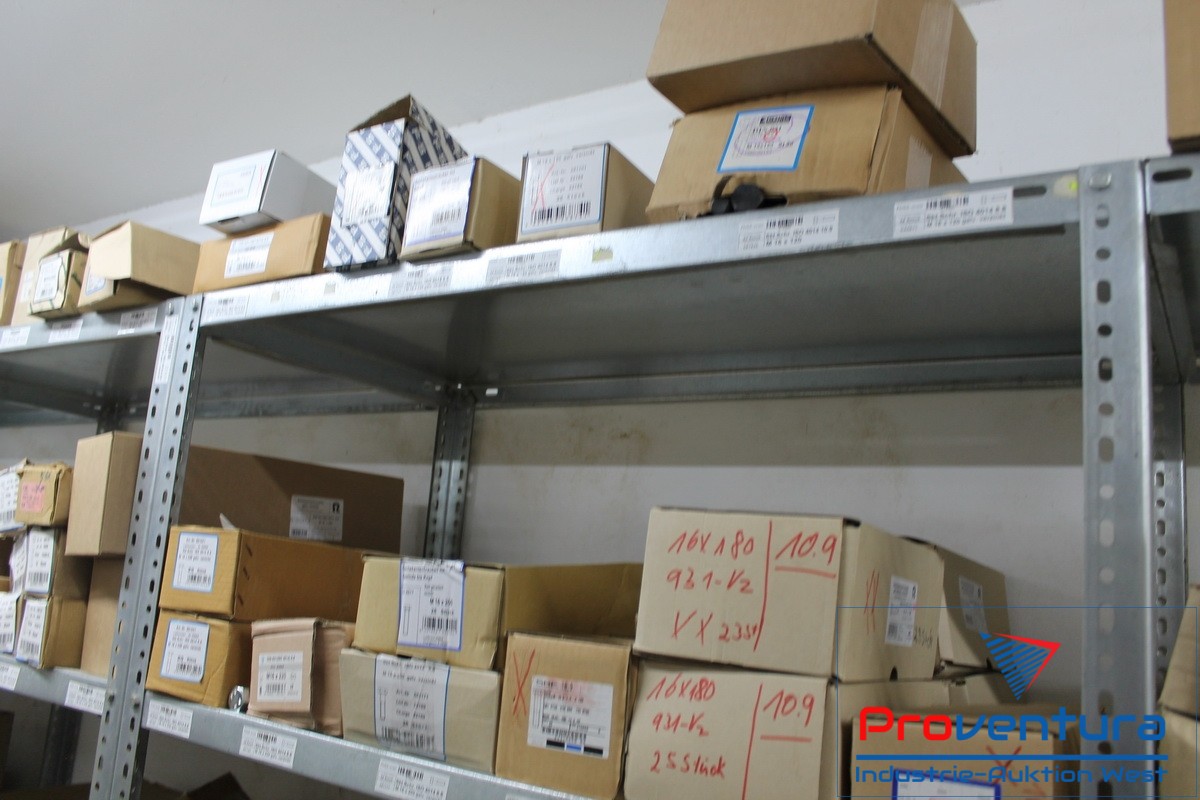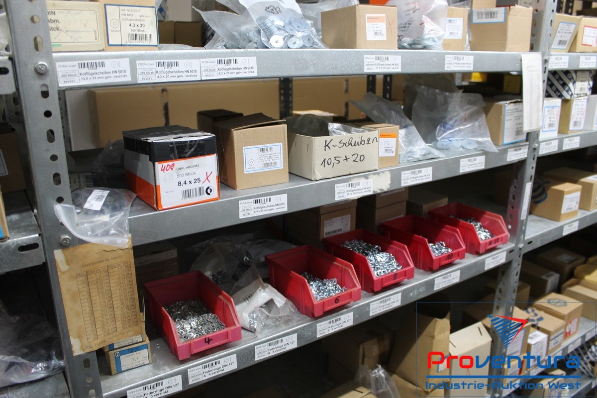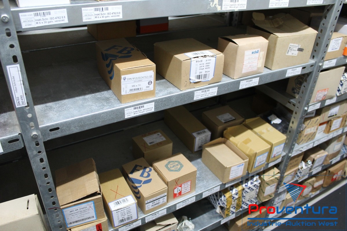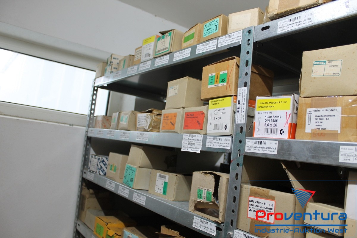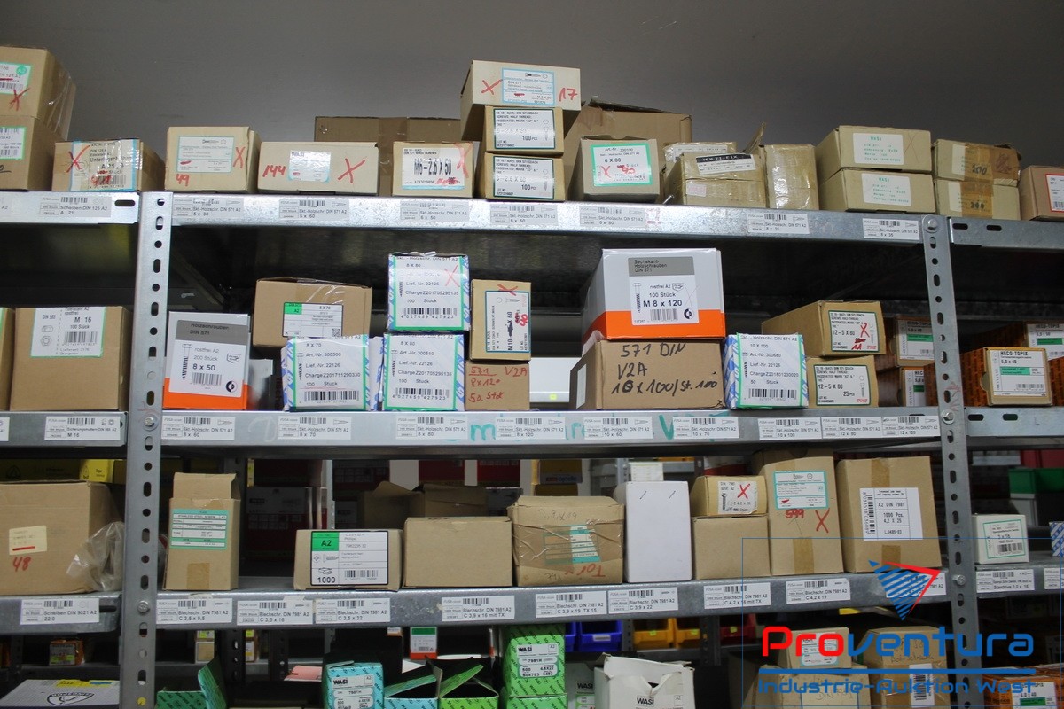 Warenbestände, lagernd in 49 Regalen, Schweißdraht, Bohrer, Sägeblätter, Werkzeug, Wasserwagen, Ketten, Spanngurte, Drahtbürsten, Stecknüsse, Feilen, Imbusschlüssel, Meißel, Metallwinkel, div. Lochwinkel, Winkelverbinder, Muttern, Sicherungsmuttern, Gewindestangen, Blechschrauben, Unterlegscheiben, Federringe, Schrauben, teilw, Edelstahl, Dübel FISCHER und UPAT, Nägel, Trennscheiben, Schleifbänder, Handschuhe in div. Ausführungen und Größen, Kabelbinder, Gehörschutz, Schellen, 120 l Frostschutzmittel, Einschlagmuttern, Bauschaum, Lecksuchspray, Pistolenschaum, Schmiermittel, Markierungsspray, Schraubensicherung, Bohr- und Schneidöl, Silikon, Kriechöl, Bremsenreiniger, Maurerschnur, teilw. in Sortimentskästen, Toilettenpapier, Werbemittel, Umfang siehe Fotos und Video, die als PDF hinterlegte Inventurliste zeigt nur die Art der Artikel, Vollständigkeit kann nicht gewährleistet werden. Kunde muss pünktlich zur Abholung erscheinen um das Regal auszuräumen.