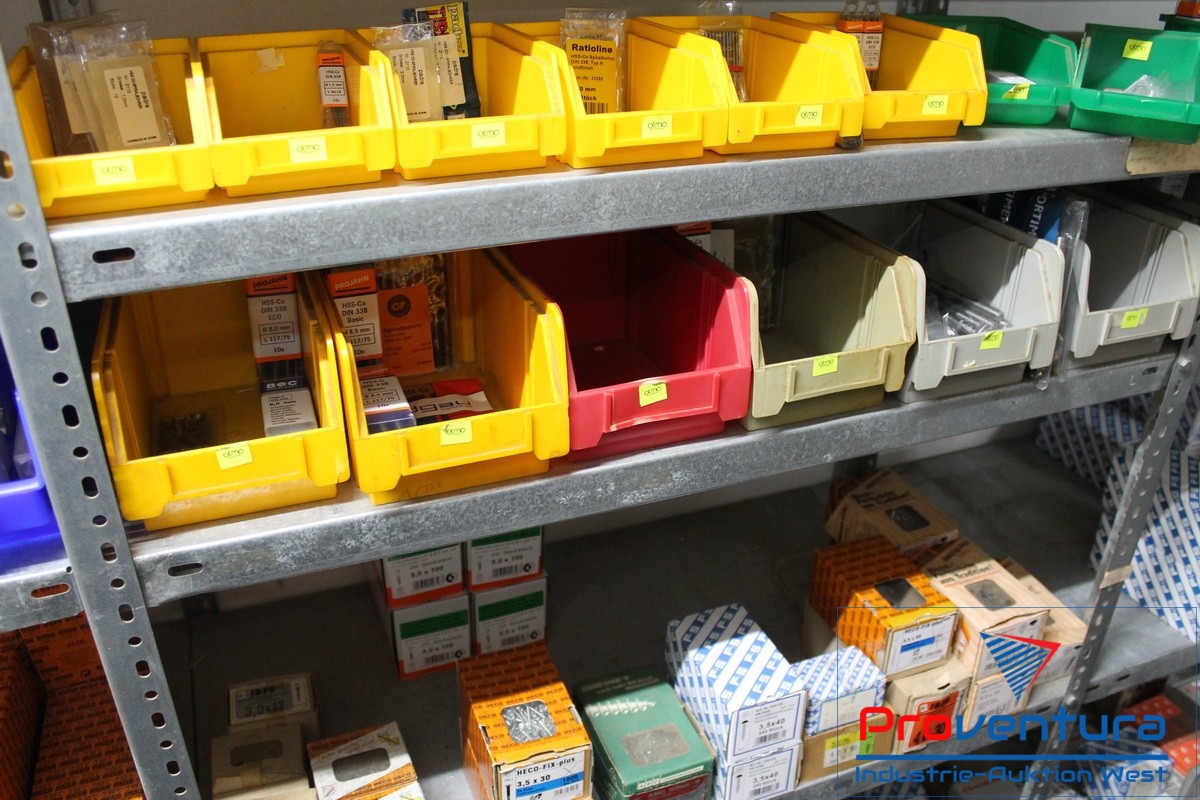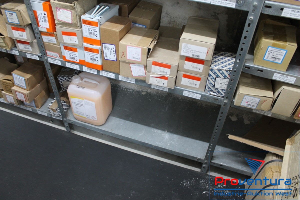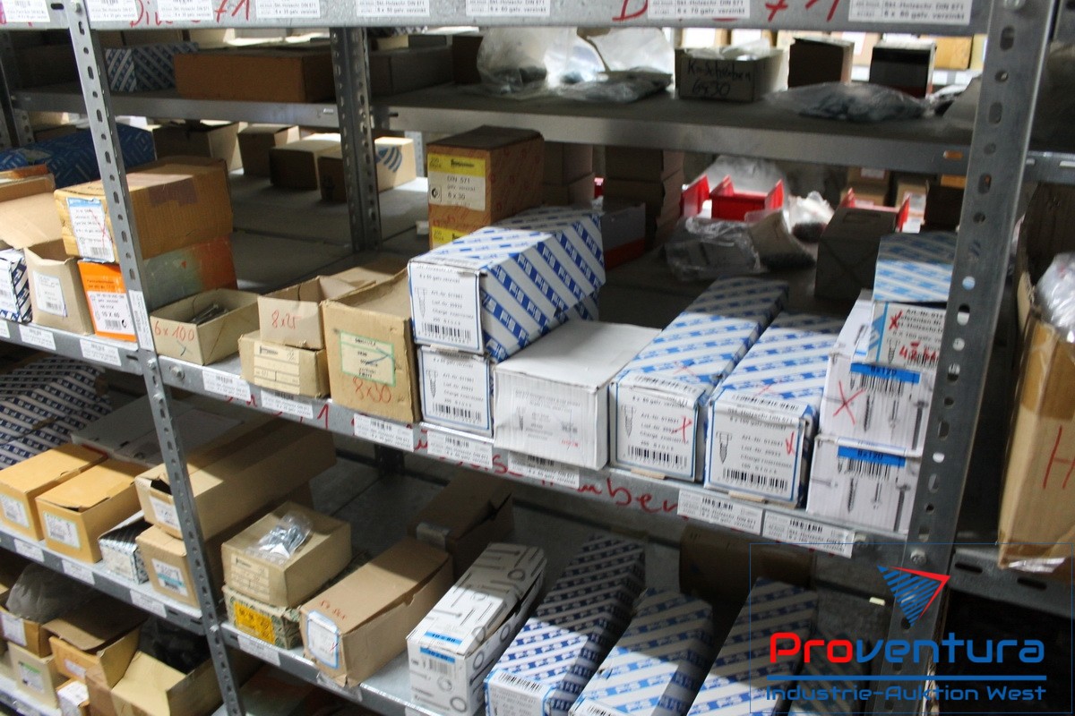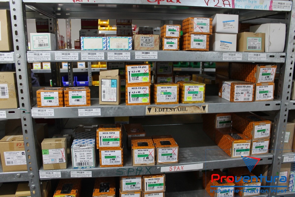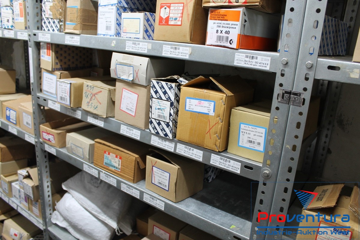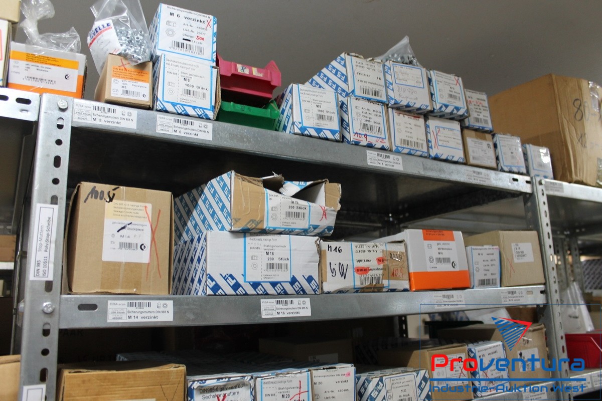 Warenbestände, lagernd in 49 Regalen, Schweißdraht, Bohrer, Sägeblätter, Werkzeug, Wasserwagen, Ketten, Spanngurte, Drahtbürsten, Stecknüsse, Feilen, Imbusschlüssel, Meißel, Metallwinkel, div. Lochwinkel, Winkelverbinder, Muttern, Sicherungsmuttern, Gewindestangen, Blechschrauben, Unterlegscheiben, Federringe, Schrauben, teilw, Edelstahl, Dübel FISCHER und UPAT, Nägel, Trennscheiben, Schleifbänder, Handschuhe in div. Ausführungen und Größen, Kabelbinder, Gehörschutz, Schellen, 120 l Frostschutzmittel, Einschlagmuttern, Bauschaum, Lecksuchspray, Pistolenschaum, Schmiermittel, Markierungsspray, Schraubensicherung, Bohr- und Schneidöl, Silikon, Kriechöl, Bremsenreiniger, Maurerschnur, teilw. in Sortimentskästen, Toilettenpapier, Werbemittel, Umfang siehe Fotos und Video, die als PDF hinterlegte Inventurliste zeigt nur die Art der Artikel, Vollständigkeit kann nicht gewährleistet werden. Kunde muss pünktlich zur Abholung erscheinen um das Regal auszuräumen.