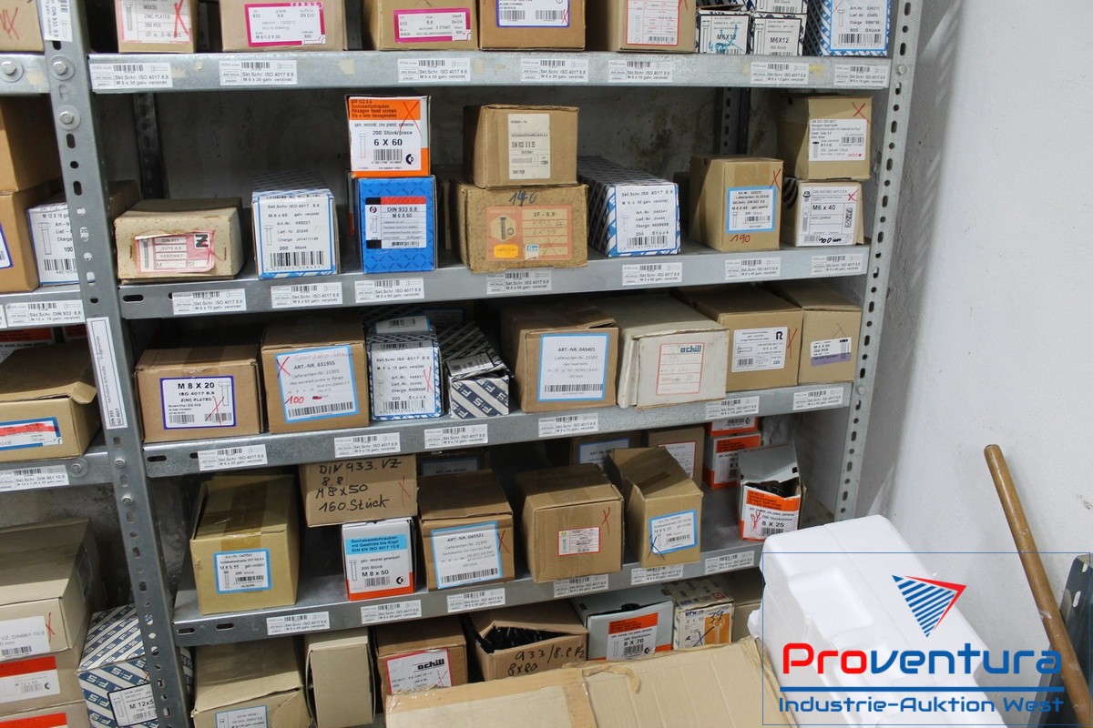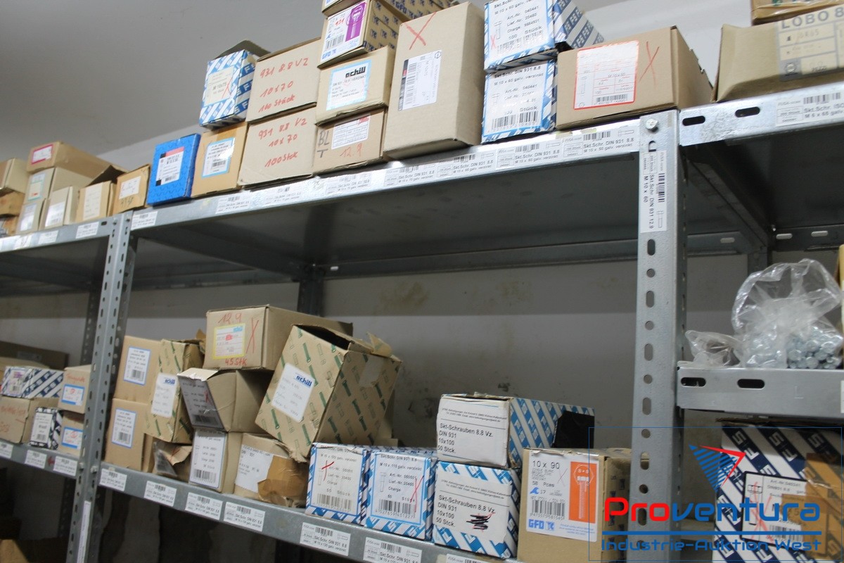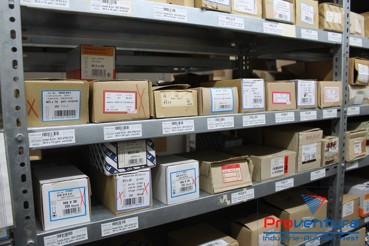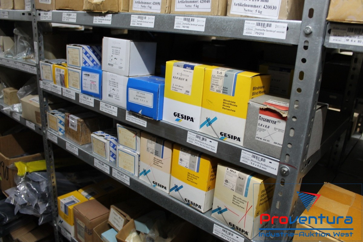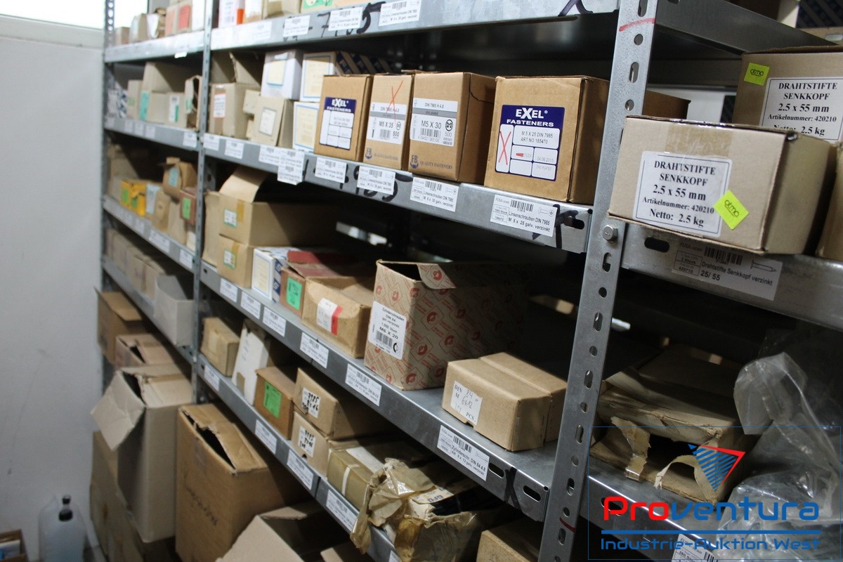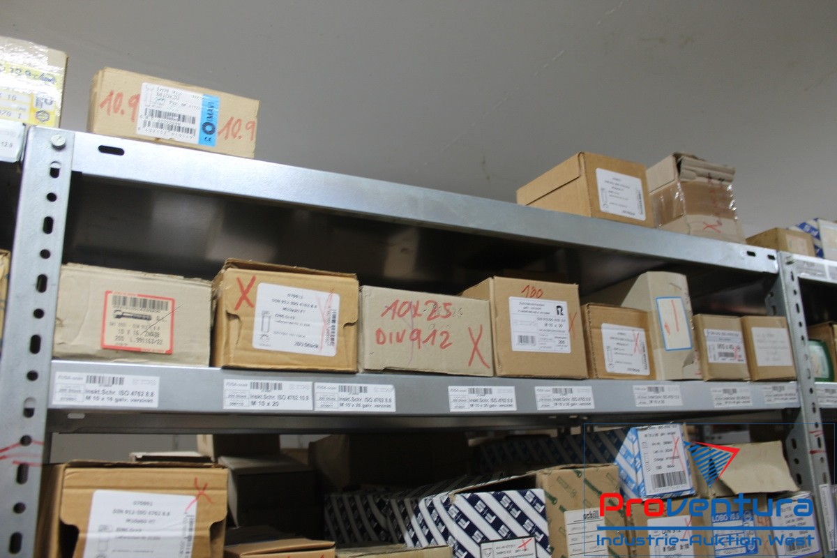 Warenbestände, lagernd in 49 Regalen, Schweißdraht, Bohrer, Sägeblätter, Werkzeug, Wasserwagen, Ketten, Spanngurte, Drahtbürsten, Stecknüsse, Feilen, Imbusschlüssel, Meißel, Metallwinkel, div. Lochwinkel, Winkelverbinder, Muttern, Sicherungsmuttern, Gewindestangen, Blechschrauben, Unterlegscheiben, Federringe, Schrauben, teilw, Edelstahl, Dübel FISCHER und UPAT, Nägel, Trennscheiben, Schleifbänder, Handschuhe in div. Ausführungen und Größen, Kabelbinder, Gehörschutz, Schellen, 120 l Frostschutzmittel, Einschlagmuttern, Bauschaum, Lecksuchspray, Pistolenschaum, Schmiermittel, Markierungsspray, Schraubensicherung, Bohr- und Schneidöl, Silikon, Kriechöl, Bremsenreiniger, Maurerschnur, teilw. in Sortimentskästen, Toilettenpapier, Werbemittel, Umfang siehe Fotos und Video, die als PDF hinterlegte Inventurliste zeigt nur die Art der Artikel, Vollständigkeit kann nicht gewährleistet werden. Kunde muss pünktlich zur Abholung erscheinen um das Regal auszuräumen.