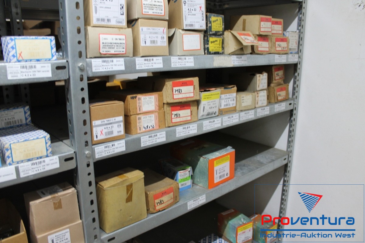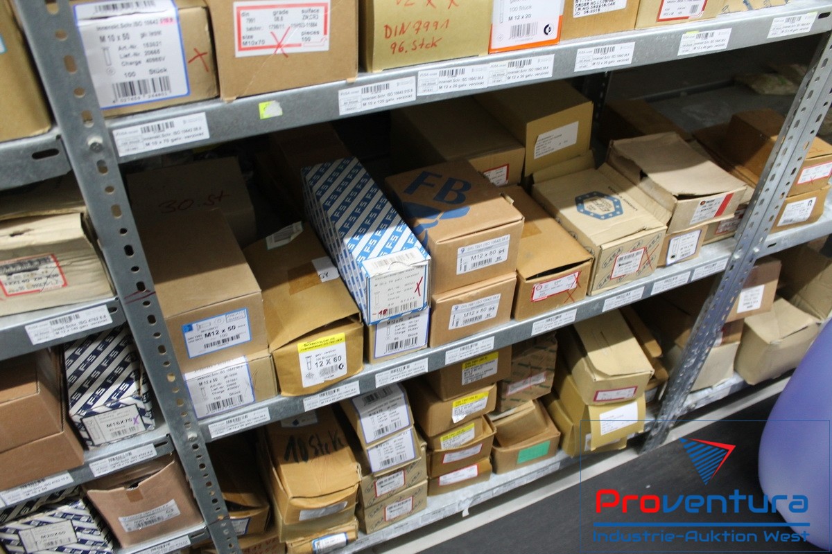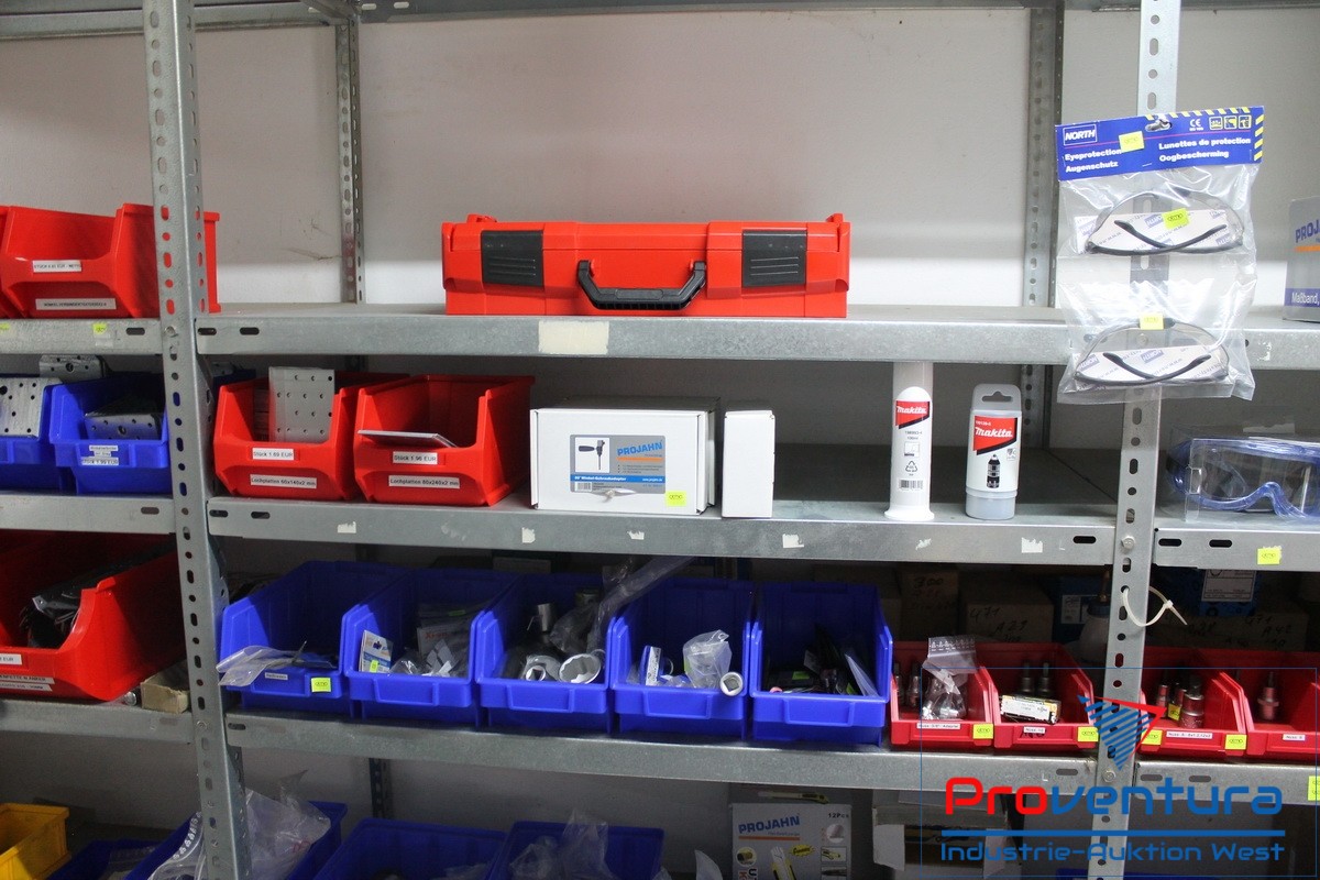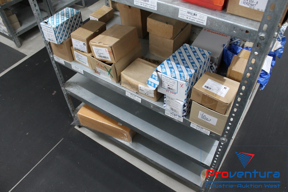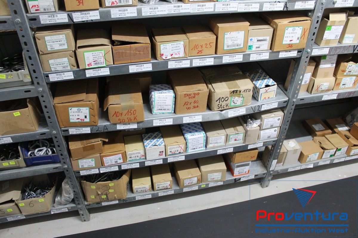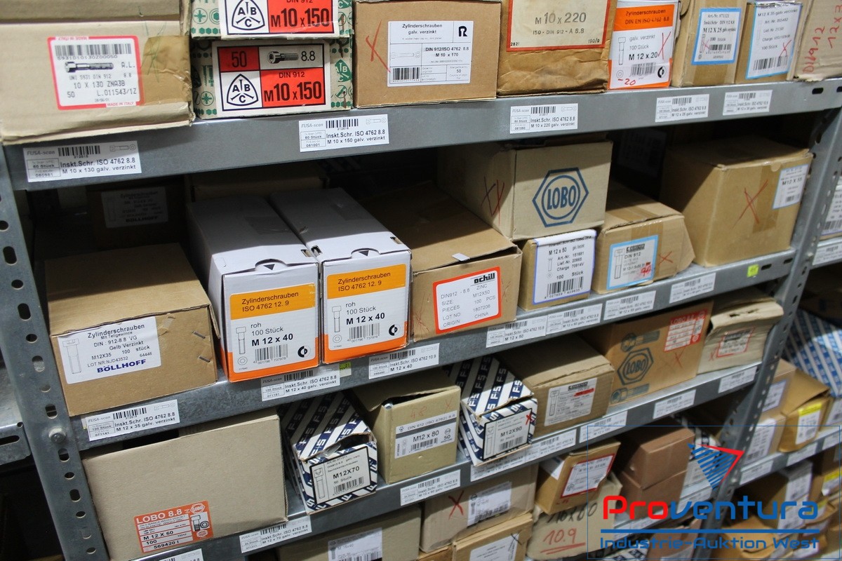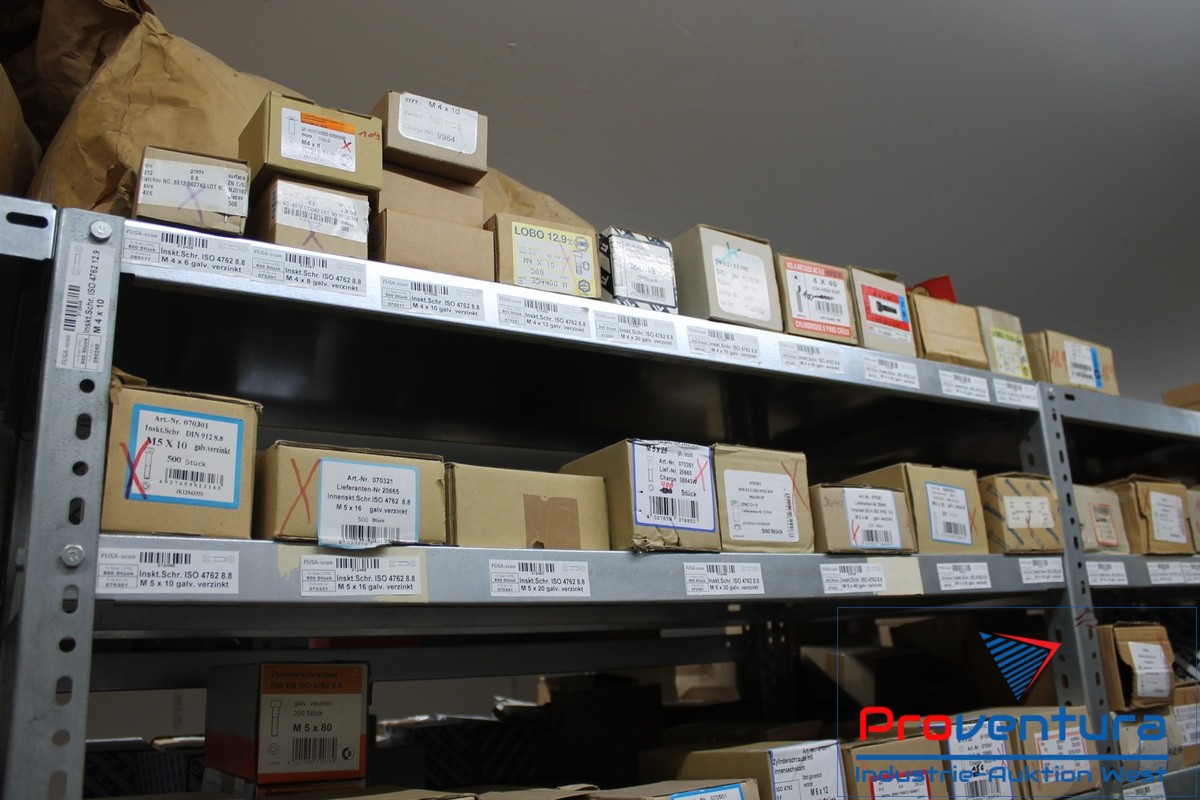 Warenbestände, lagernd in 49 Regalen, Schweißdraht, Bohrer, Sägeblätter, Werkzeug, Wasserwagen, Ketten, Spanngurte, Drahtbürsten, Stecknüsse, Feilen, Imbusschlüssel, Meißel, Metallwinkel, div. Lochwinkel, Winkelverbinder, Muttern, Sicherungsmuttern, Gewindestangen, Blechschrauben, Unterlegscheiben, Federringe, Schrauben, teilw, Edelstahl, Dübel FISCHER und UPAT, Nägel, Trennscheiben, Schleifbänder, Handschuhe in div. Ausführungen und Größen, Kabelbinder, Gehörschutz, Schellen, 120 l Frostschutzmittel, Einschlagmuttern, Bauschaum, Lecksuchspray, Pistolenschaum, Schmiermittel, Markierungsspray, Schraubensicherung, Bohr- und Schneidöl, Silikon, Kriechöl, Bremsenreiniger, Maurerschnur, teilw. in Sortimentskästen, Toilettenpapier, Werbemittel, Umfang siehe Fotos und Video, die als PDF hinterlegte Inventurliste zeigt nur die Art der Artikel, Vollständigkeit kann nicht gewährleistet werden. Kunde muss pünktlich zur Abholung erscheinen um das Regal auszuräumen.