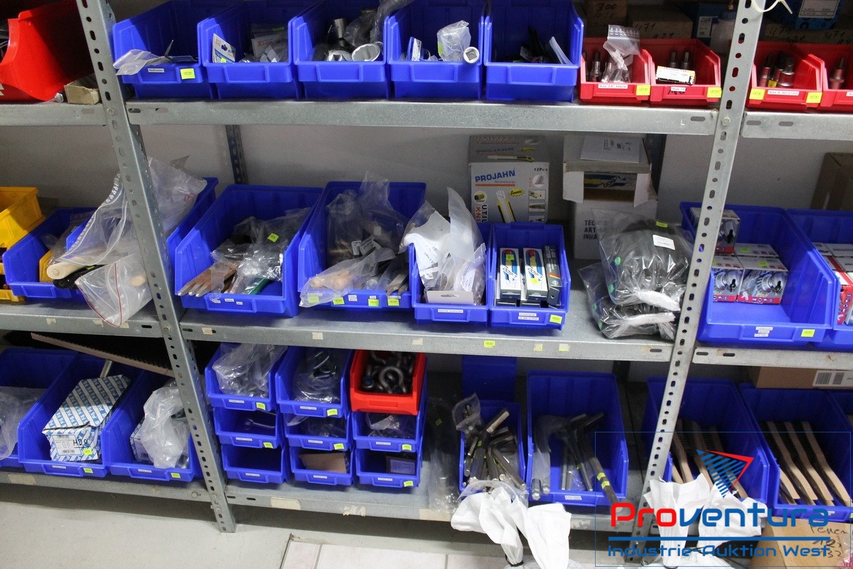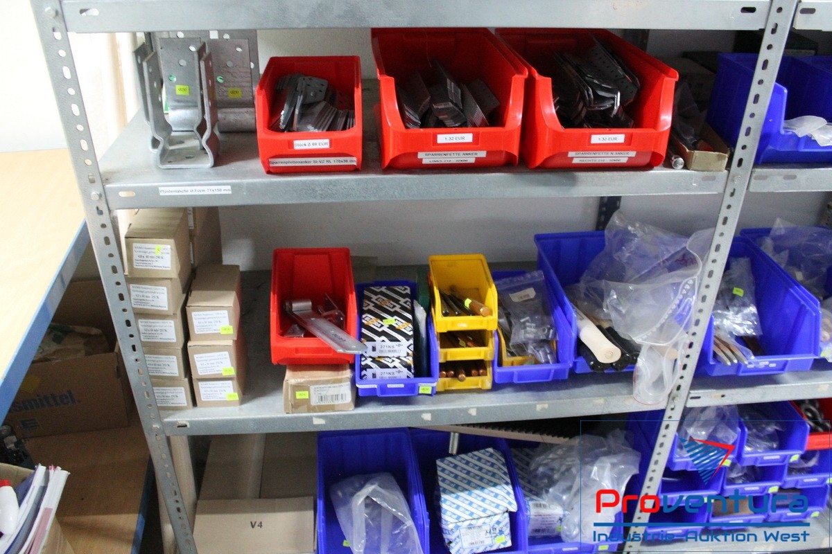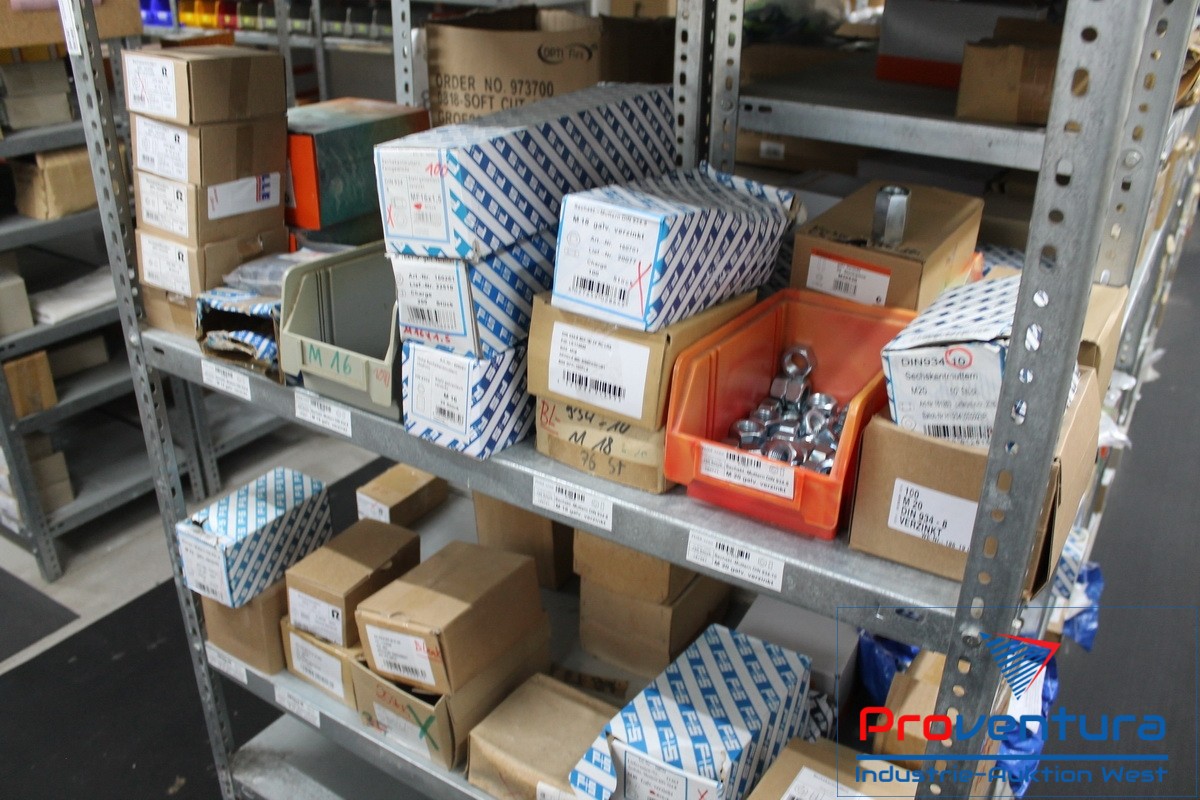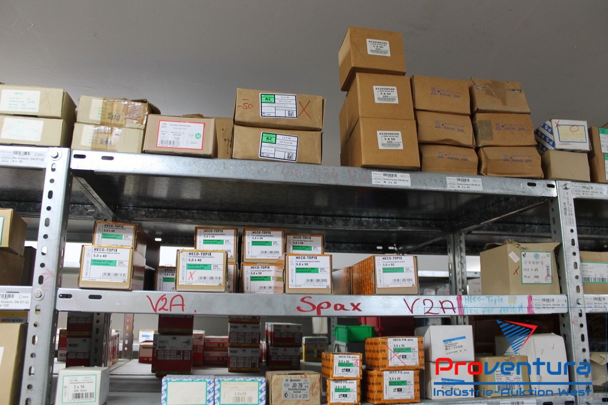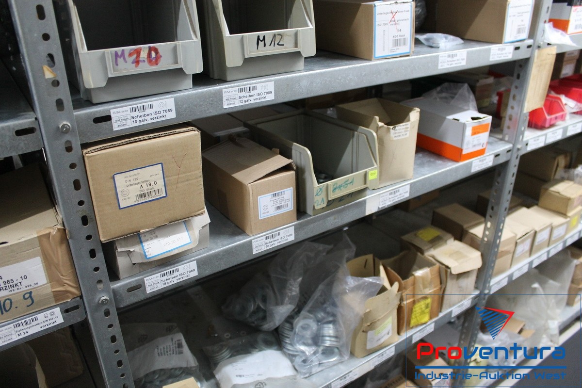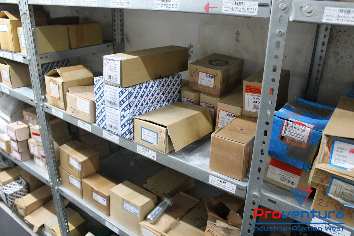 Warenbestände, lagernd in 49 Regalen, Schweißdraht, Bohrer, Sägeblätter, Werkzeug, Wasserwagen, Ketten, Spanngurte, Drahtbürsten, Stecknüsse, Feilen, Imbusschlüssel, Meißel, Metallwinkel, div. Lochwinkel, Winkelverbinder, Muttern, Sicherungsmuttern, Gewindestangen, Blechschrauben, Unterlegscheiben, Federringe, Schrauben, teilw, Edelstahl, Dübel FISCHER und UPAT, Nägel, Trennscheiben, Schleifbänder, Handschuhe in div. Ausführungen und Größen, Kabelbinder, Gehörschutz, Schellen, 120 l Frostschutzmittel, Einschlagmuttern, Bauschaum, Lecksuchspray, Pistolenschaum, Schmiermittel, Markierungsspray, Schraubensicherung, Bohr- und Schneidöl, Silikon, Kriechöl, Bremsenreiniger, Maurerschnur, teilw. in Sortimentskästen, Toilettenpapier, Werbemittel, Umfang siehe Fotos und Video, die als PDF hinterlegte Inventurliste zeigt nur die Art der Artikel, Vollständigkeit kann nicht gewährleistet werden. Kunde muss pünktlich zur Abholung erscheinen um das Regal auszuräumen.