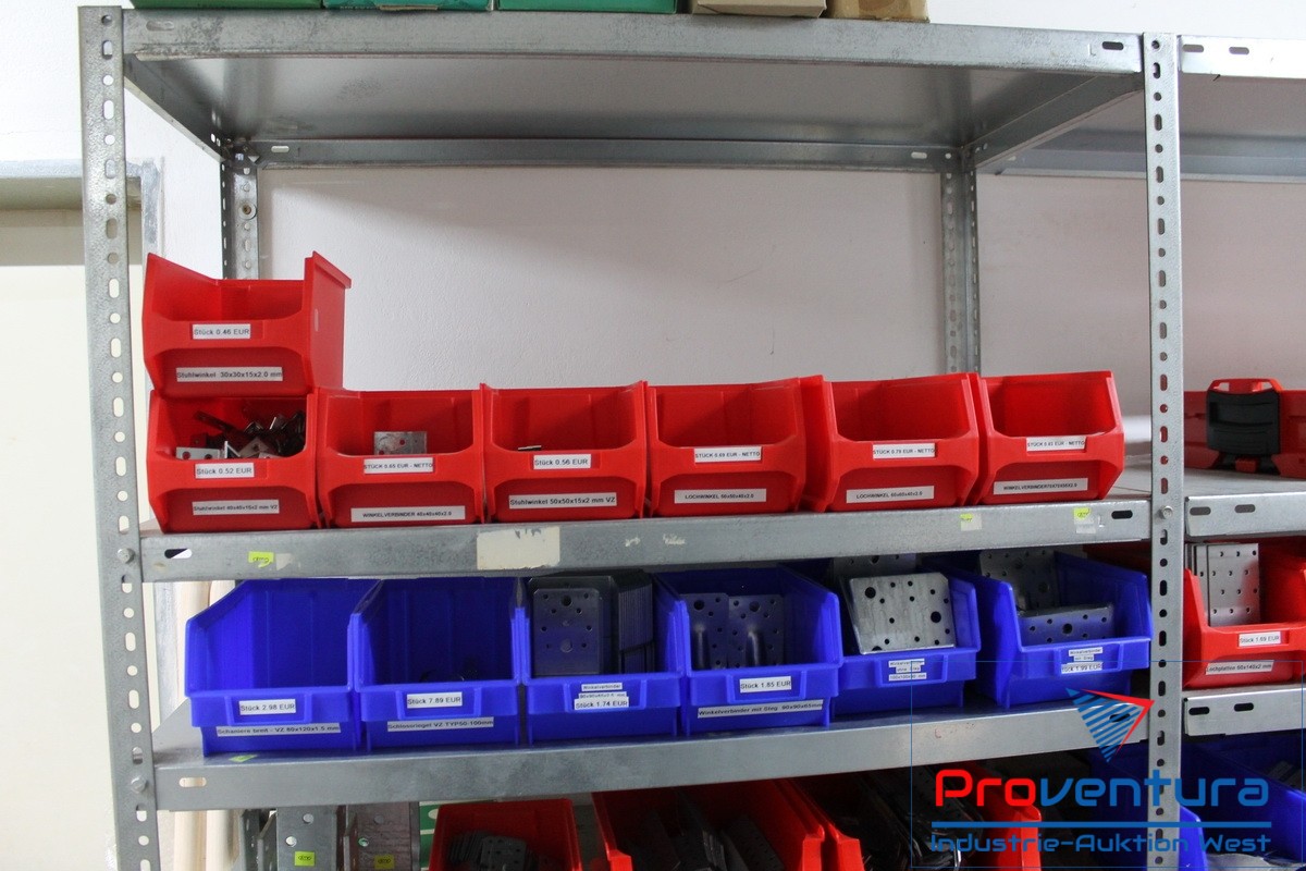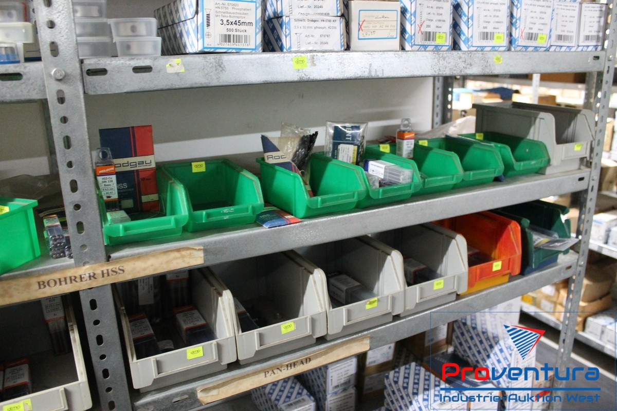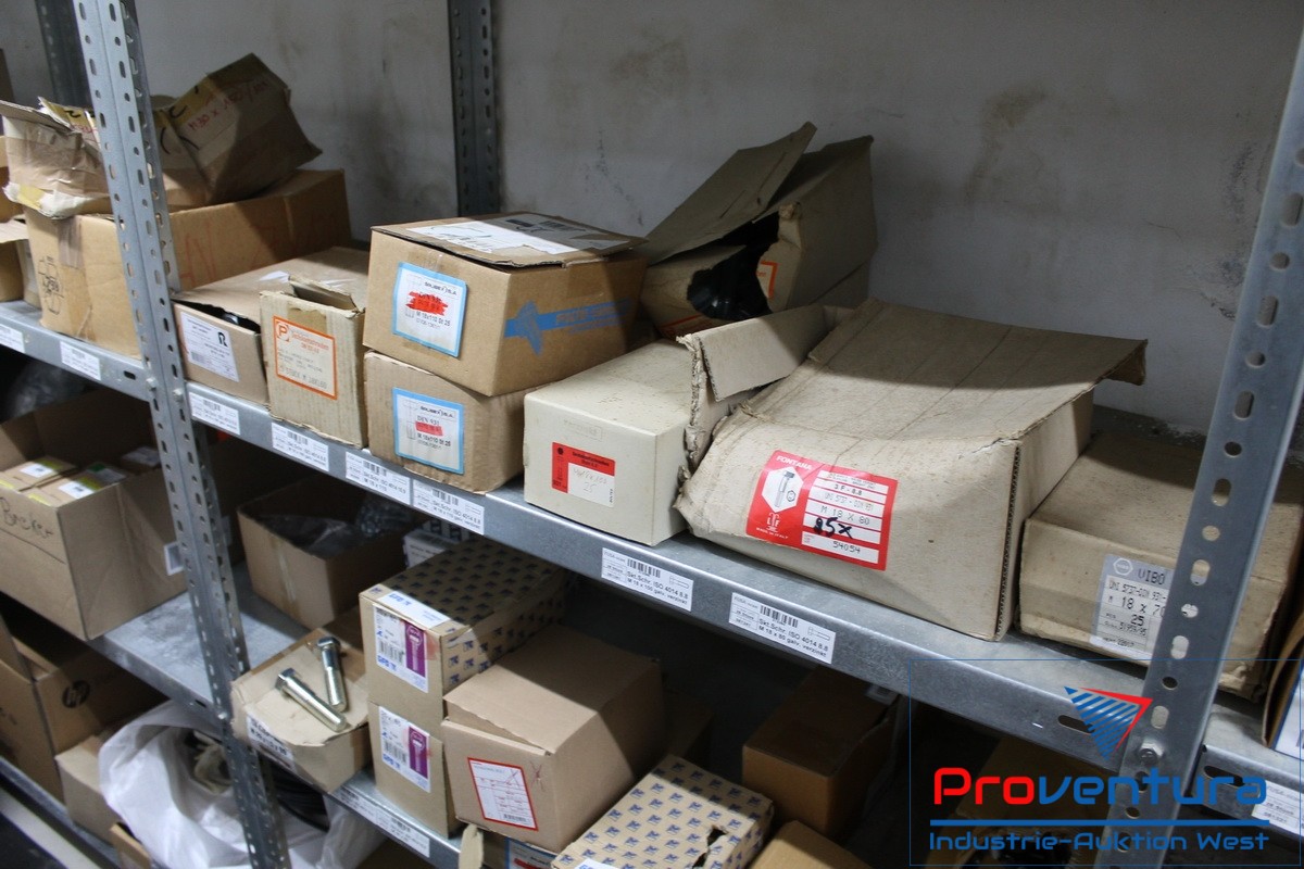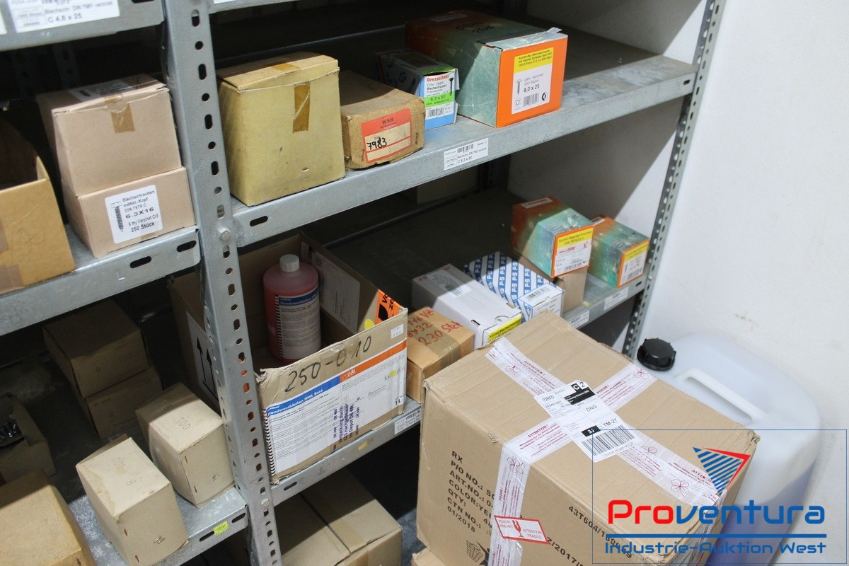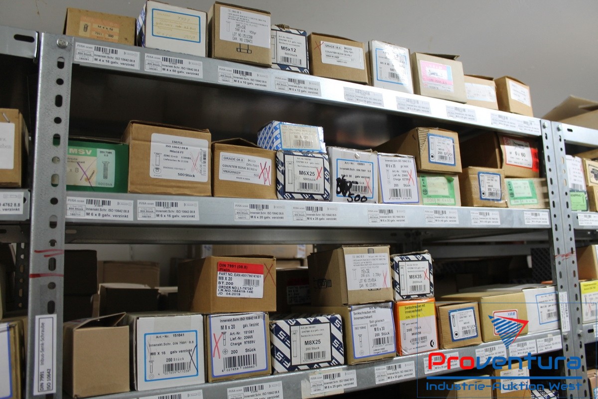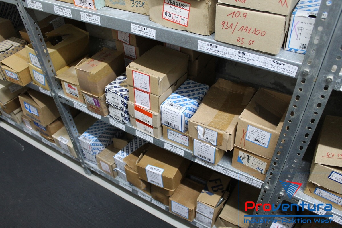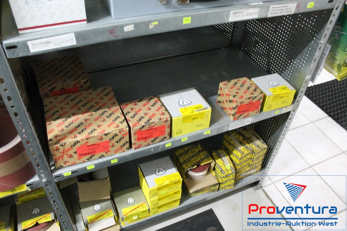 Warenbestände, lagernd in 49 Regalen, Schweißdraht, Bohrer, Sägeblätter, Werkzeug, Wasserwagen, Ketten, Spanngurte, Drahtbürsten, Stecknüsse, Feilen, Imbusschlüssel, Meißel, Metallwinkel, div. Lochwinkel, Winkelverbinder, Muttern, Sicherungsmuttern, Gewindestangen, Blechschrauben, Unterlegscheiben, Federringe, Schrauben, teilw, Edelstahl, Dübel FISCHER und UPAT, Nägel, Trennscheiben, Schleifbänder, Handschuhe in div. Ausführungen und Größen, Kabelbinder, Gehörschutz, Schellen, 120 l Frostschutzmittel, Einschlagmuttern, Bauschaum, Lecksuchspray, Pistolenschaum, Schmiermittel, Markierungsspray, Schraubensicherung, Bohr- und Schneidöl, Silikon, Kriechöl, Bremsenreiniger, Maurerschnur, teilw. in Sortimentskästen, Toilettenpapier, Werbemittel, Umfang siehe Fotos und Video, die als PDF hinterlegte Inventurliste zeigt nur die Art der Artikel, Vollständigkeit kann nicht gewährleistet werden. Kunde muss pünktlich zur Abholung erscheinen um das Regal auszuräumen.