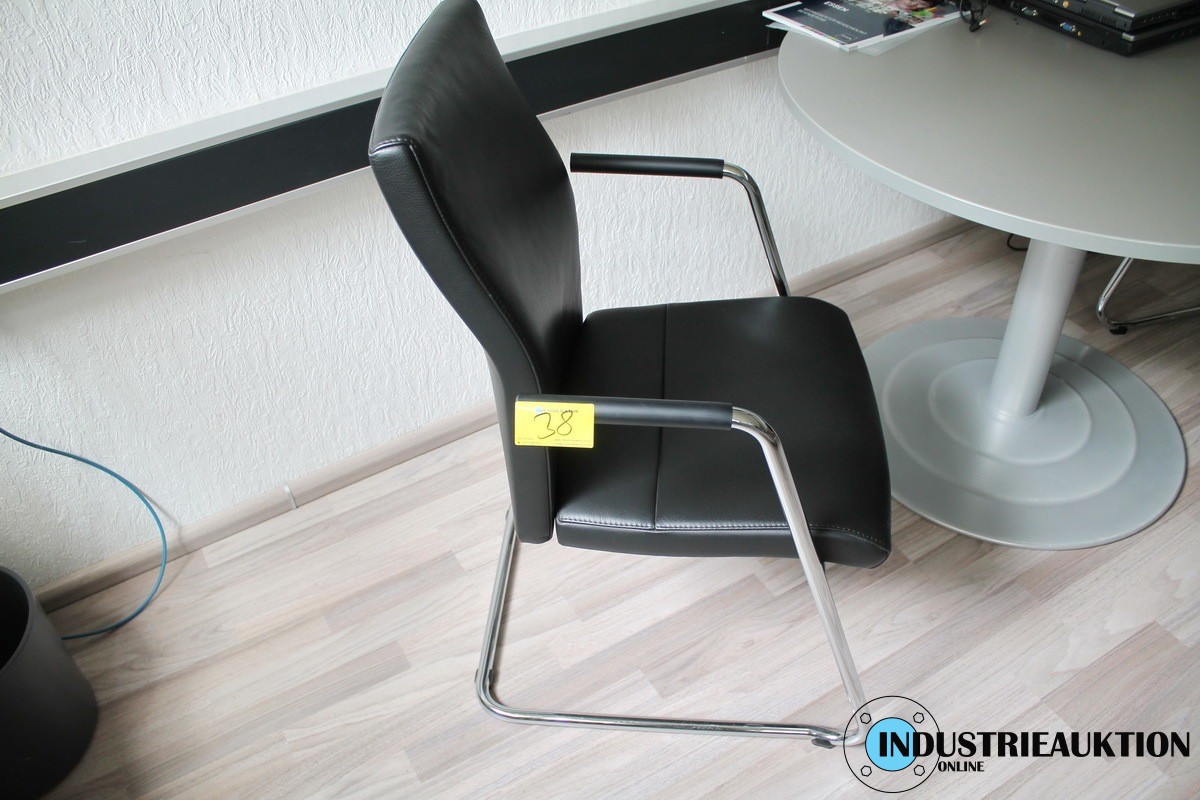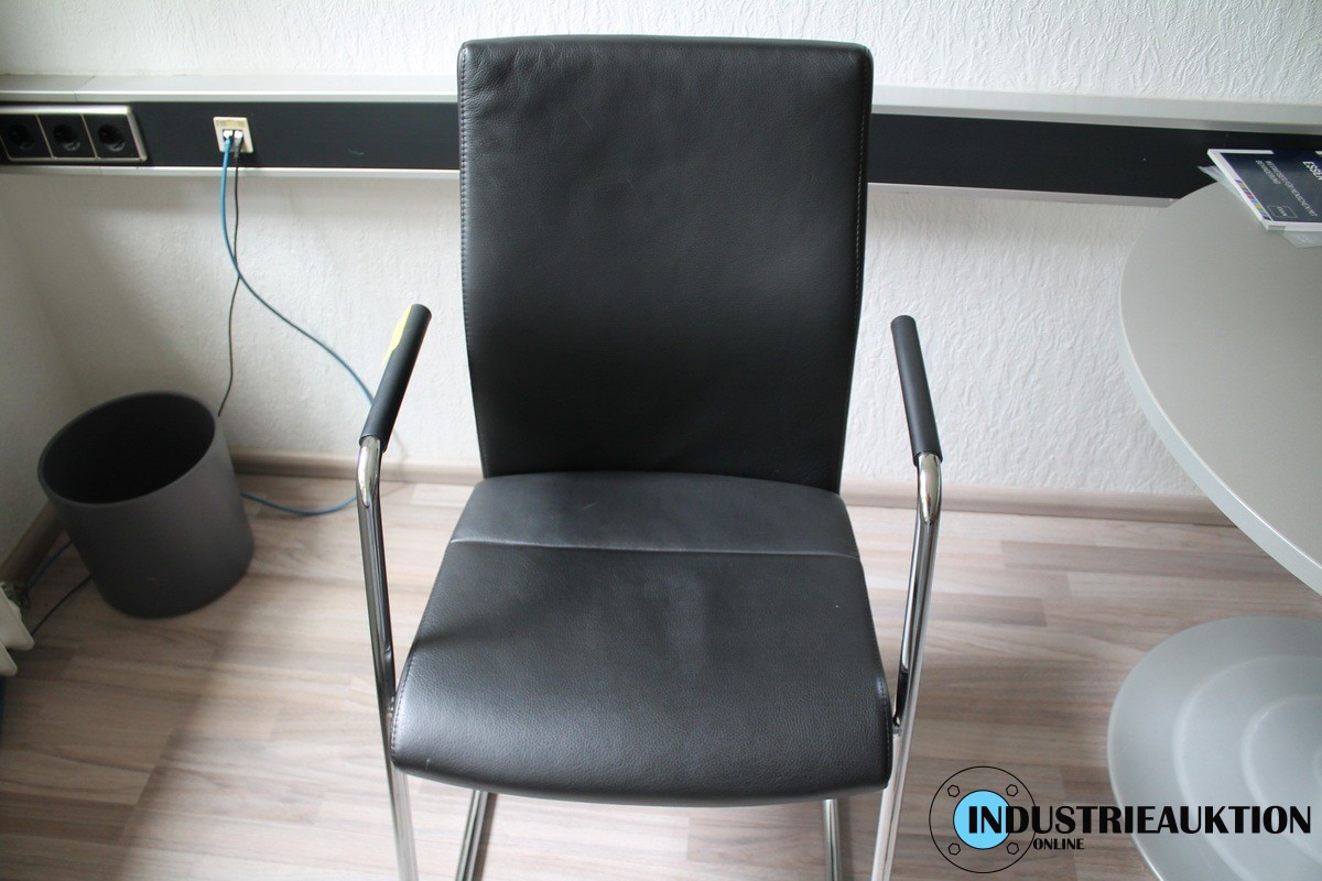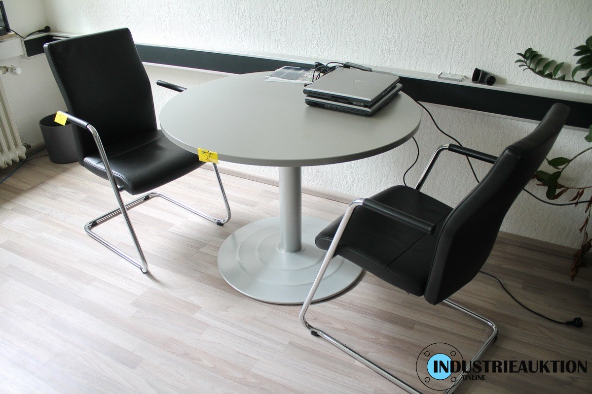 Besuchertisch, grau, rund Durchmesser ca. 100 cm dazu Besucherstühle ZÜCO, Freischwinger Leder schwarz, 3 St.