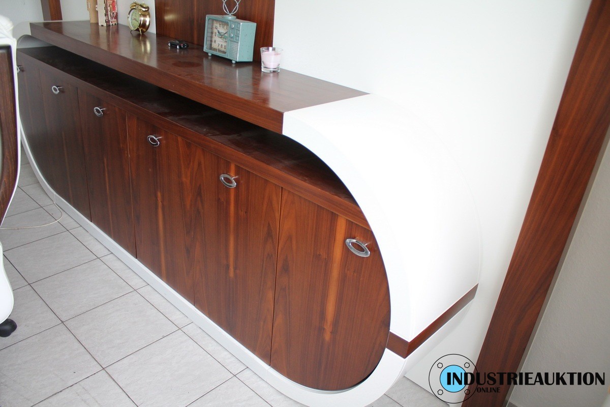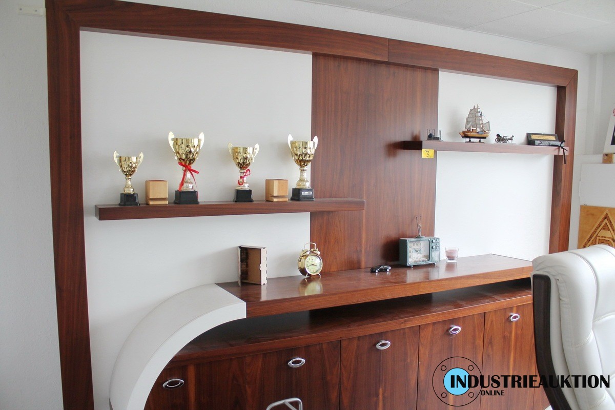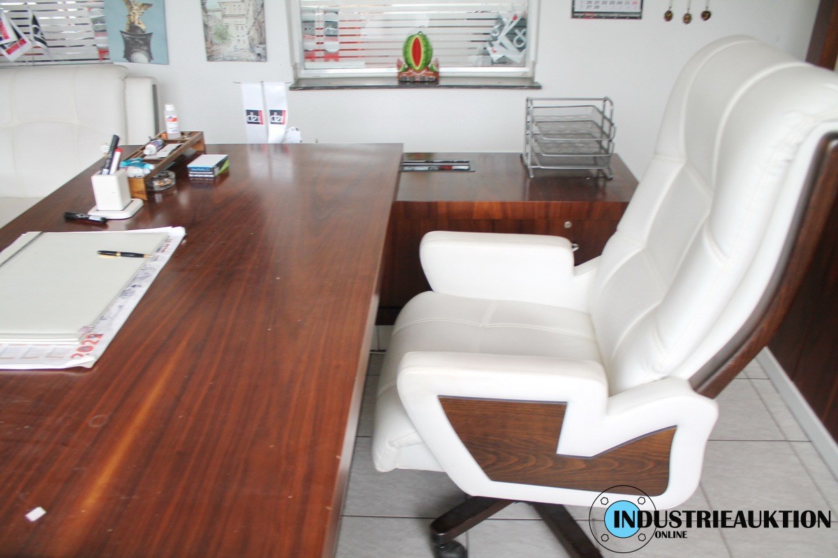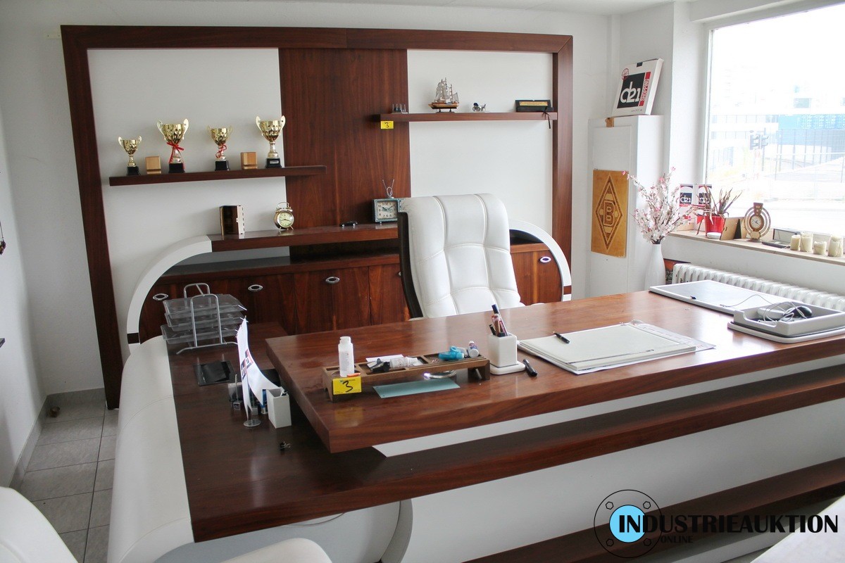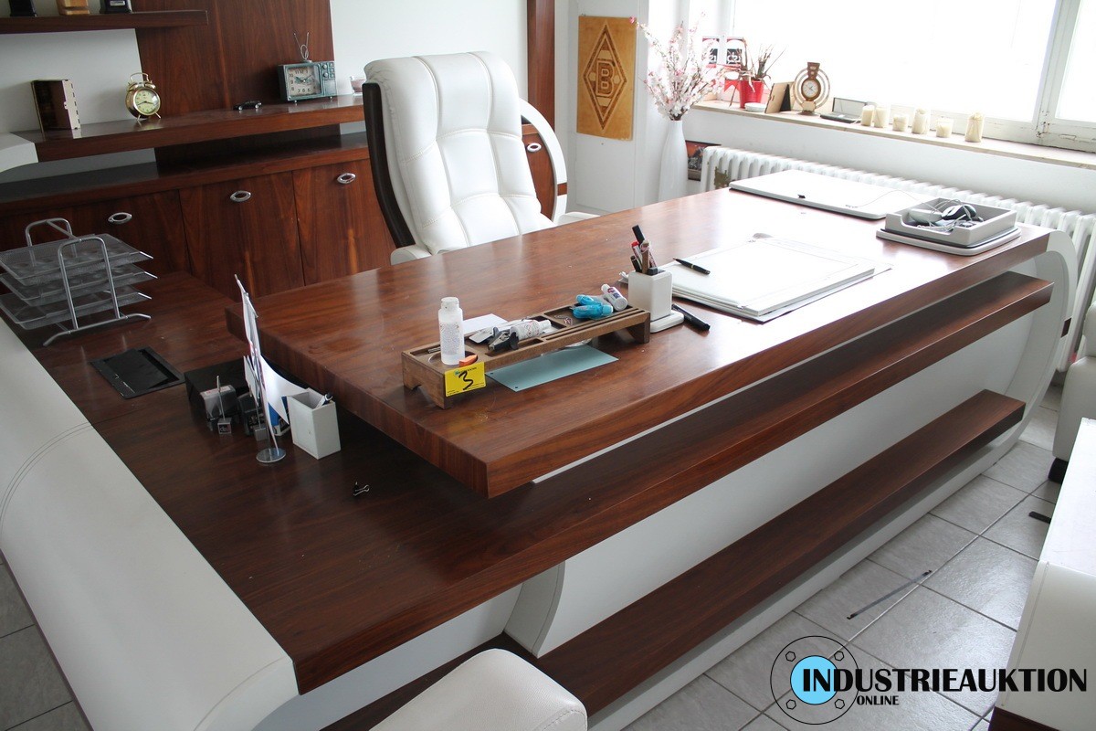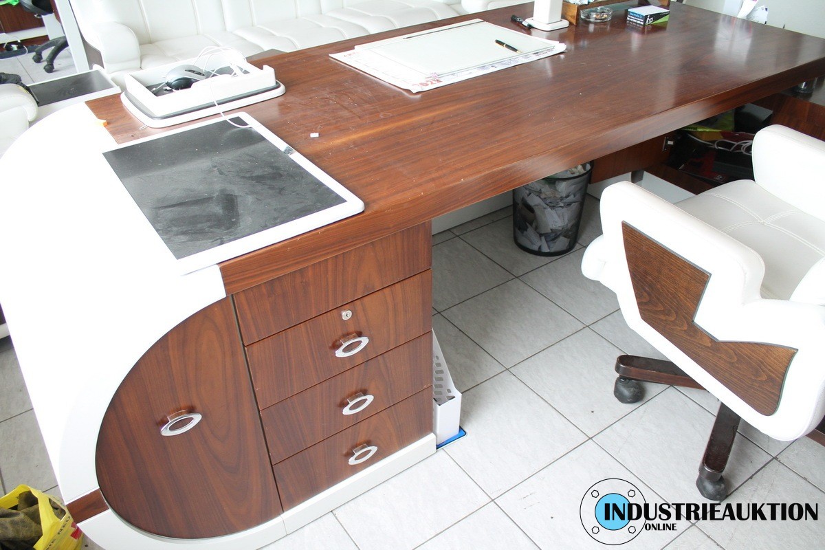 Chefschreibtisch, weiß-Palisander, abgewinkelt, Wandvertäfelung mit Sideboard, ca. 300x200 cm,