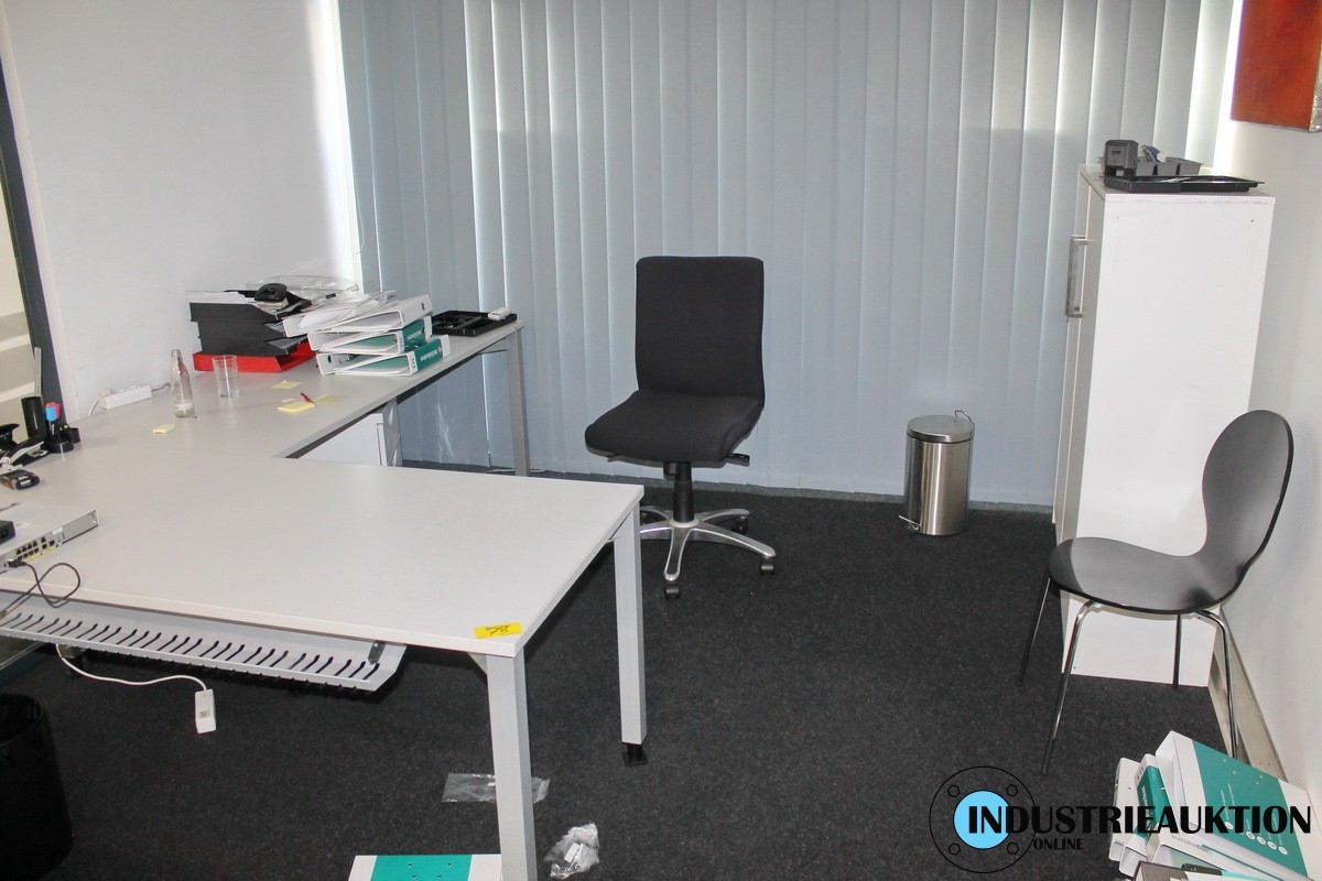 Rauminhalt: Schreibtisch-Winkelkombination, Aktenschrank, Schubladencontainer, Besucherstuhl, Drehstuhl