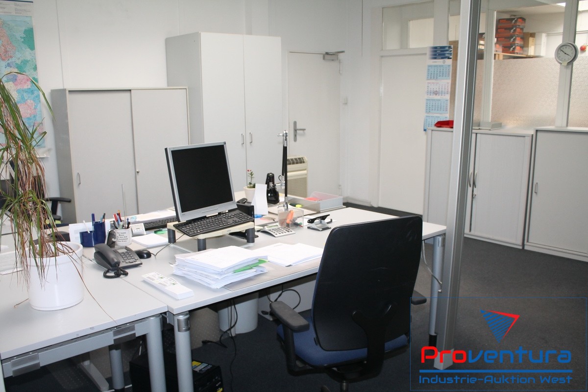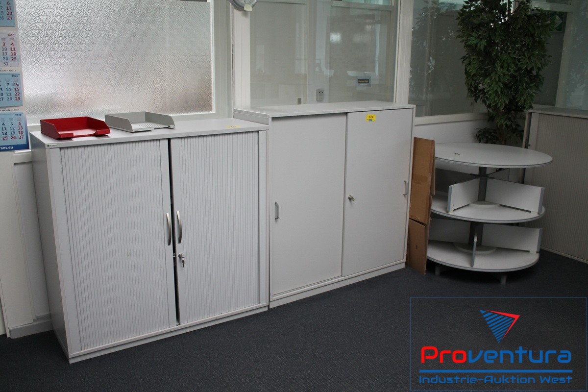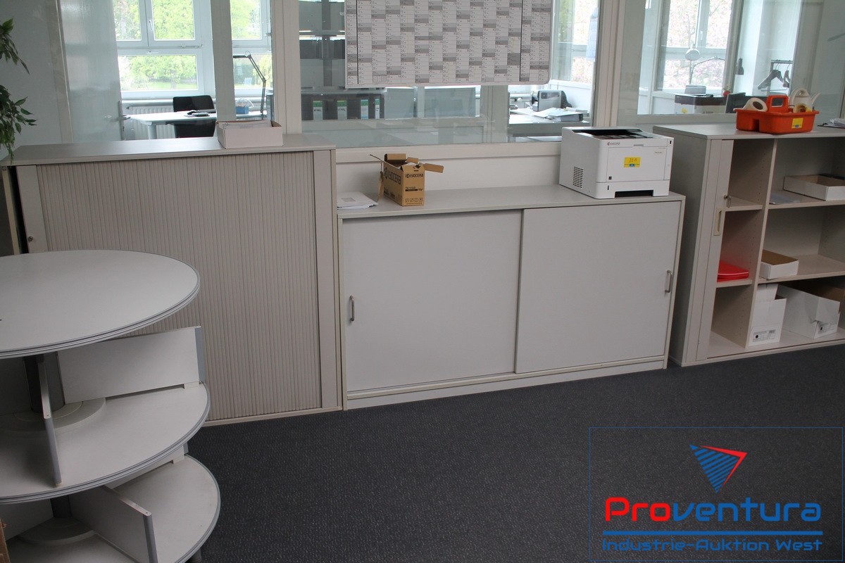Restrauminhalt, 4 Bürotische, unterschiedliche Größen, 7 Büroschränke, 1 Aktenkarussell, 2 Drehstühle
