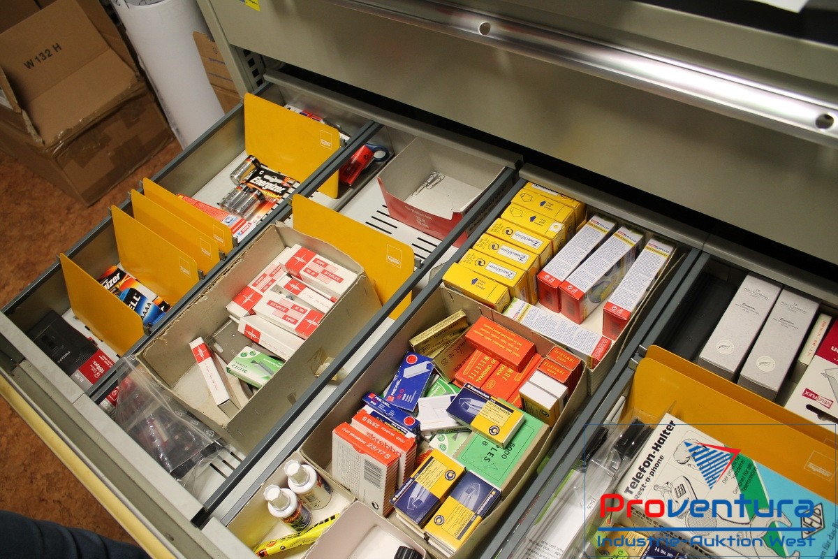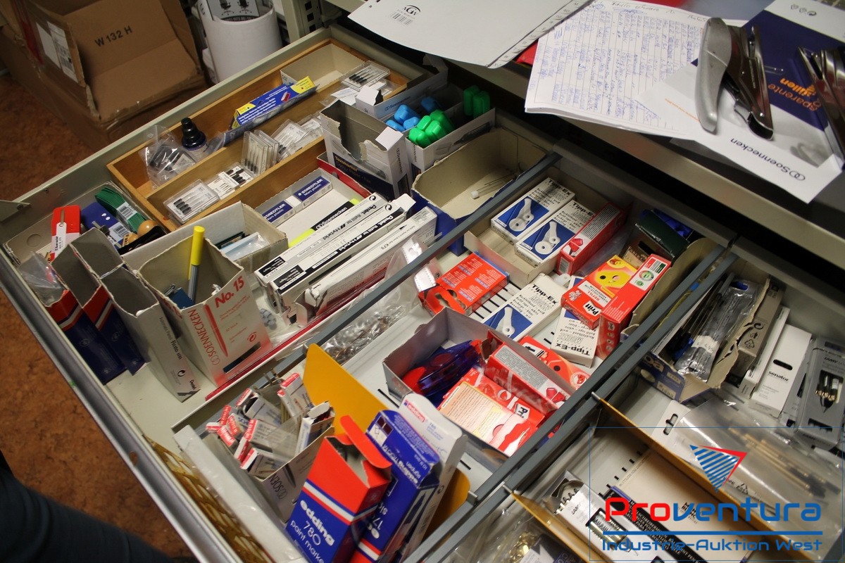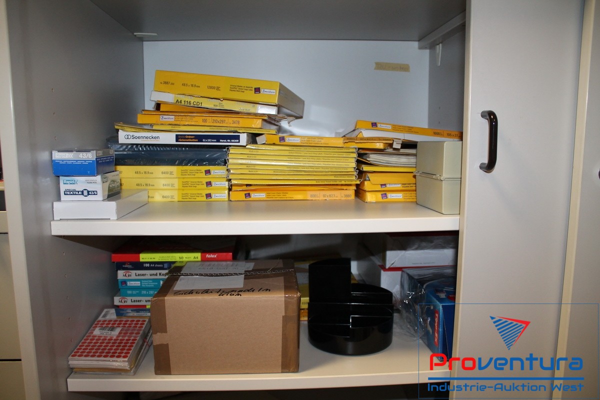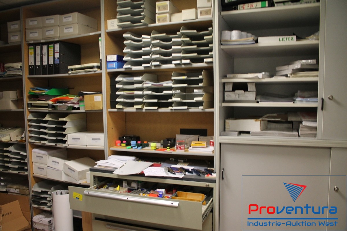 Restrauminhalt, verschiedene Regale und Schränke, Inhalt Papiervorräte, Büro-Utensilien, 2 Schreibtische