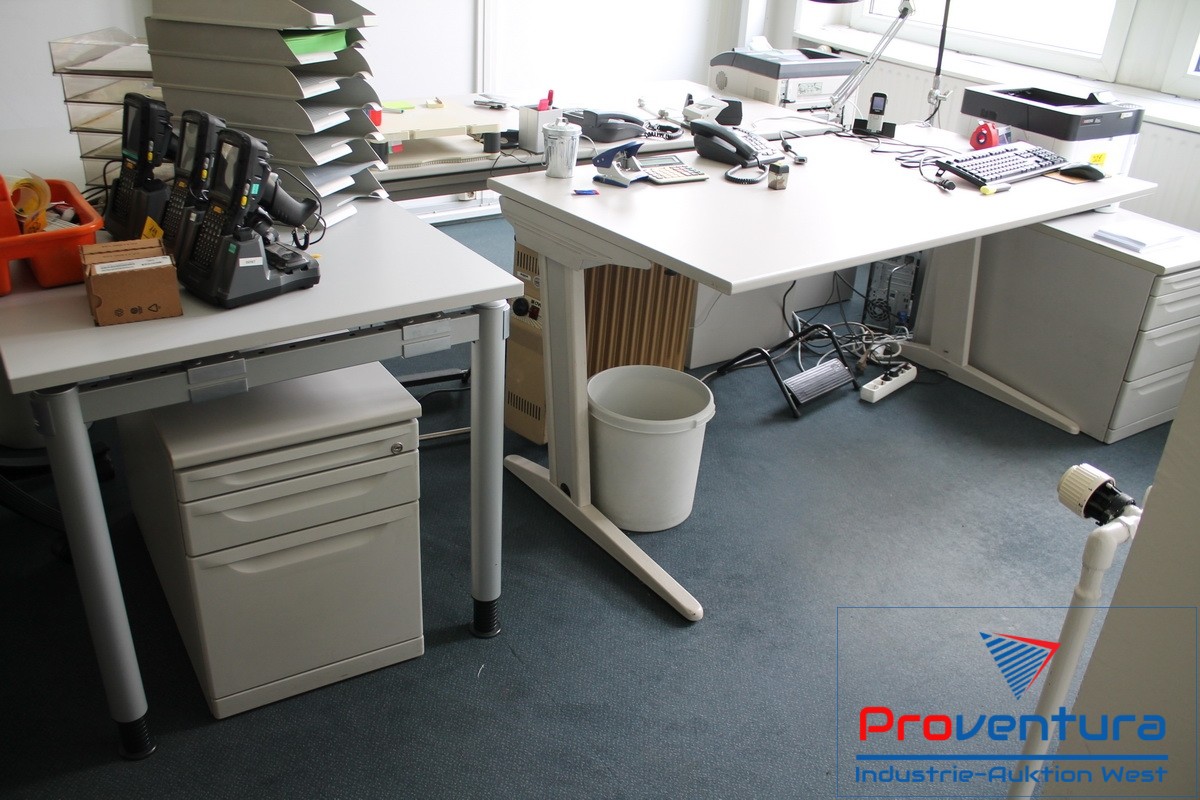 Restrauminhalt, 3 Bürotische, unterschiedlicher Art, mit Schreibtischcontainern, Büroregale, 1 Büroschrank