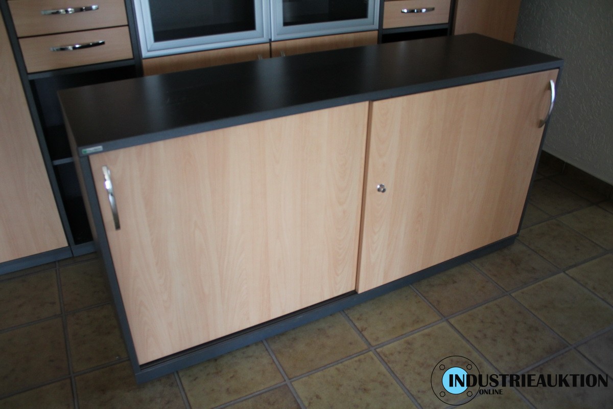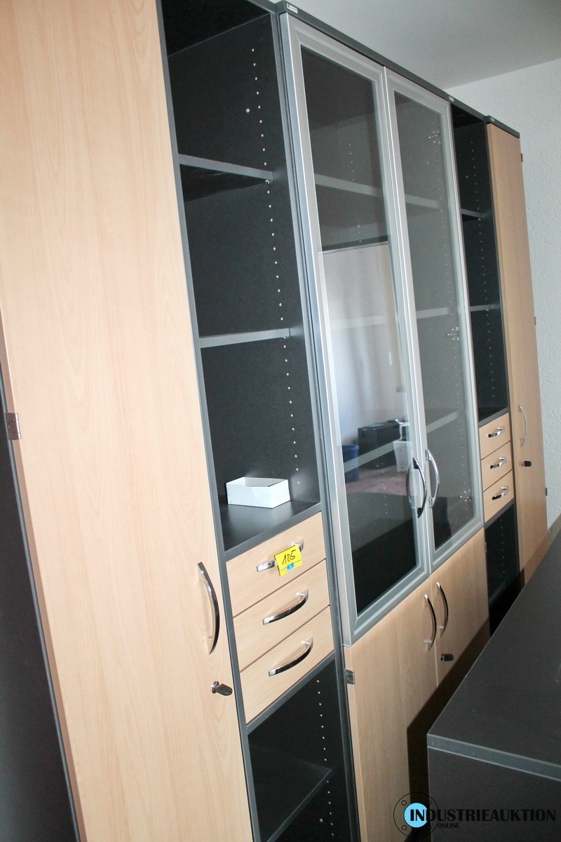 Schrankwand PALMBERG, anthrazit, Fronten buchefarbig, bzw. silber abgesetzt, mit Vitrinenelement, ca. 250x230 cm, Sidebord dazu passend