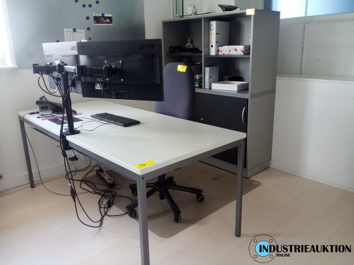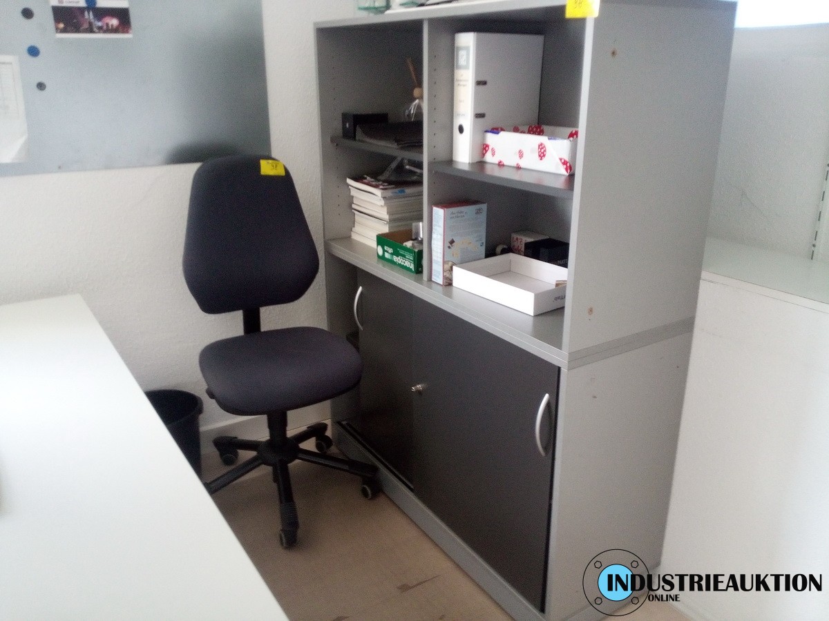 Schreibtisch, ca. 80x200 cm, grau, Drehstuhl blau, Büroschrank ca. 120x160 cm grau/anthrazit