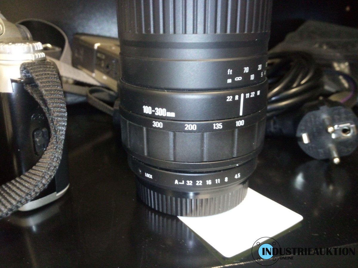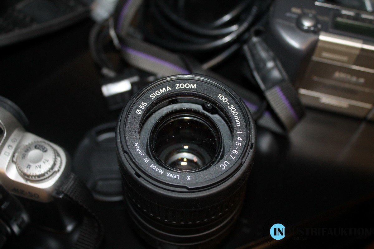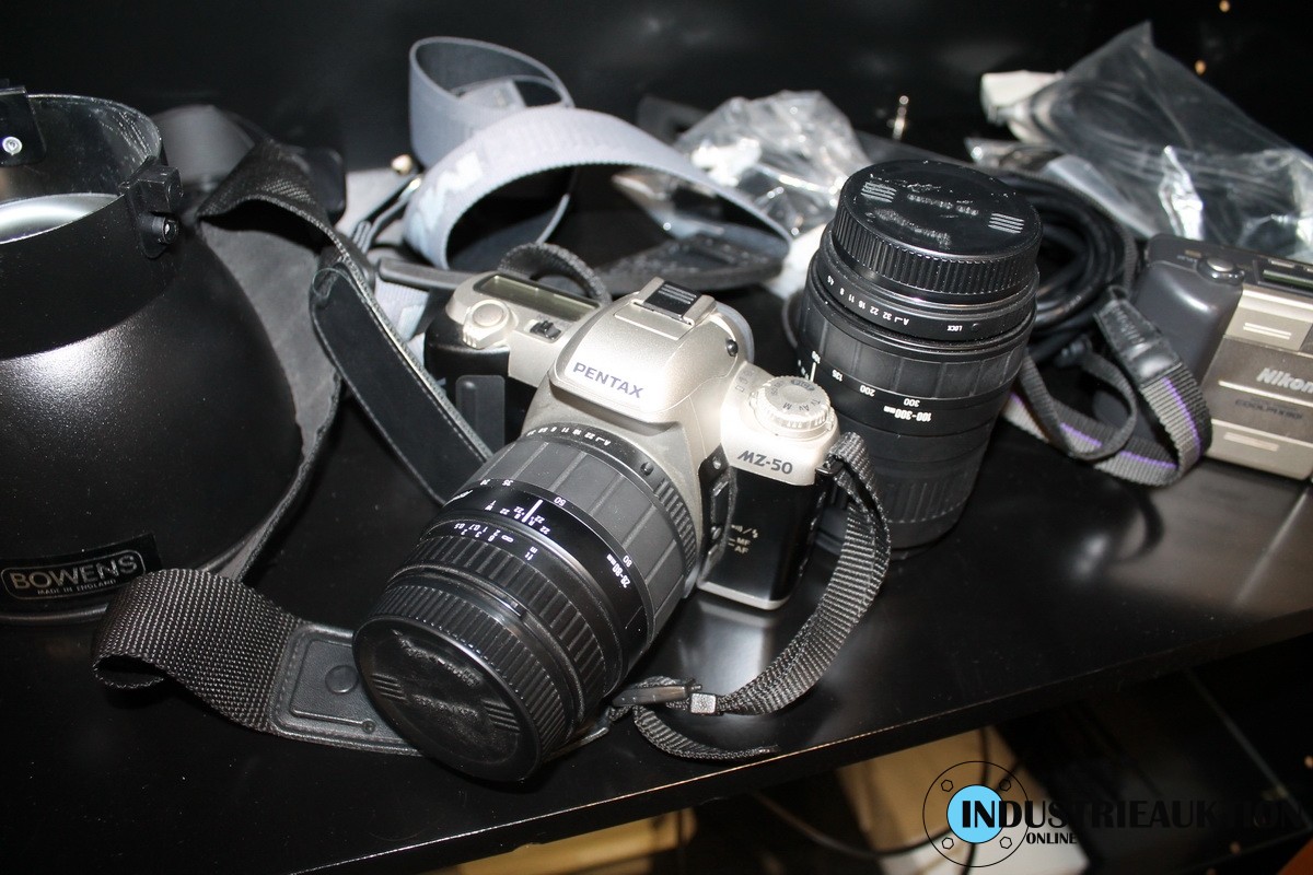 Vitrinenschrank mit Fotozubehör, ält. Kamera PENTAX, Objektiv, leere Kartons