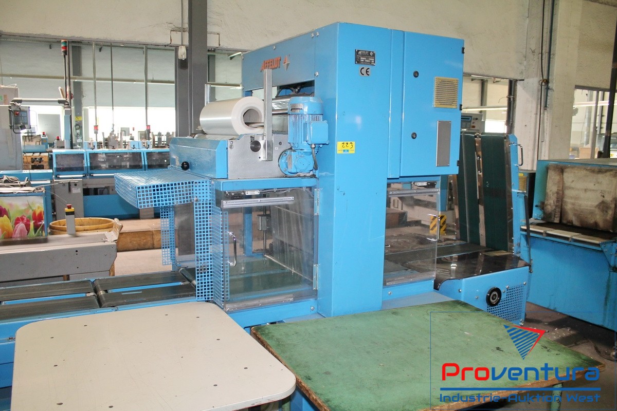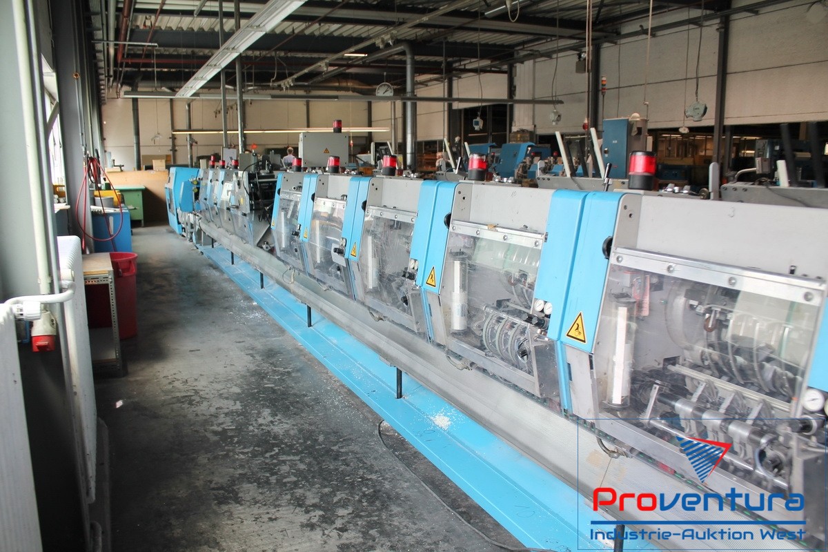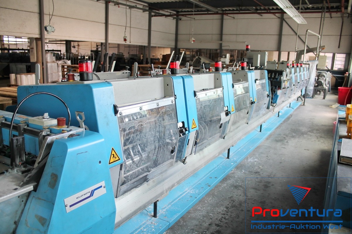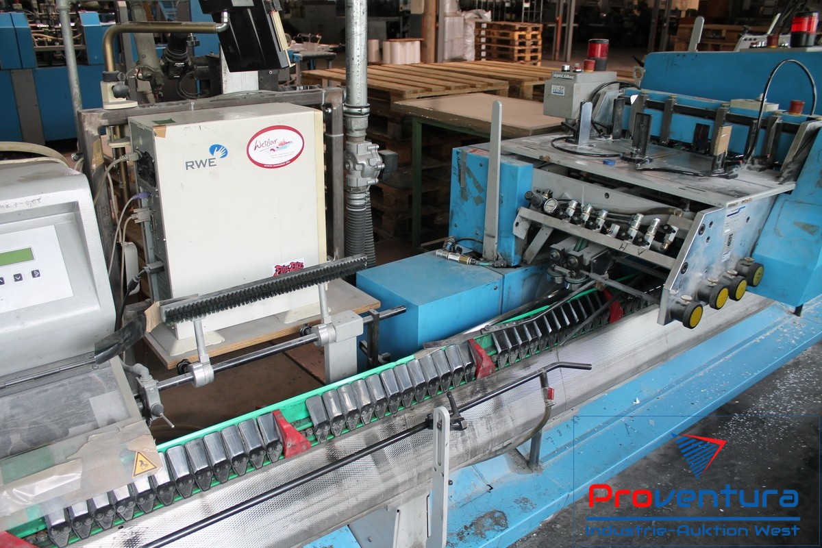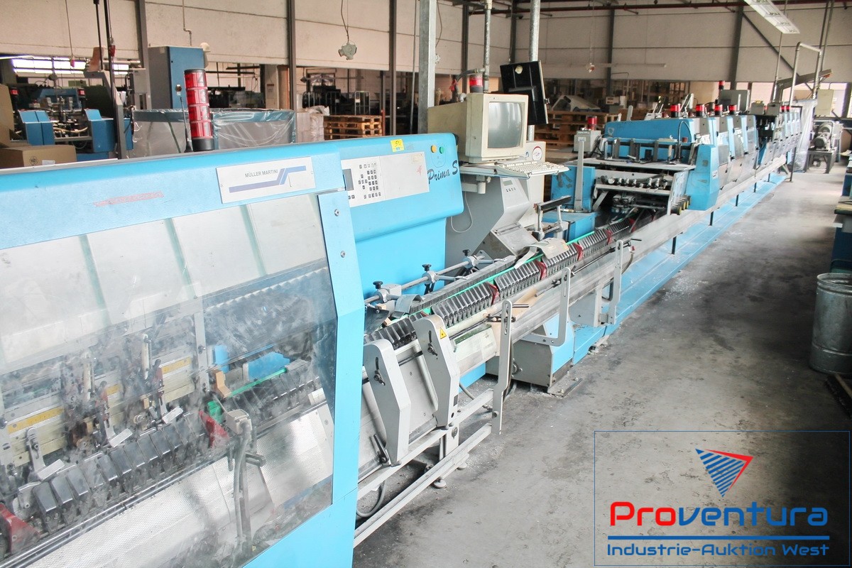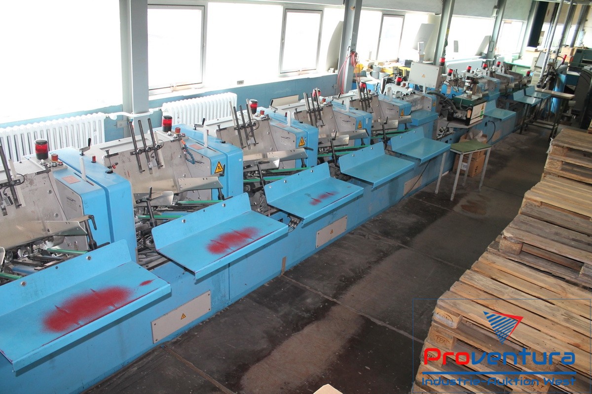 Sammelhefter MÜLLER MARTINI Prima S; Bj. 01, mit 12 Anlegeplätzen, 8 Stehendanlegern, 2 Liegendanlegern für CD/Postkarten, 2-fach, Mobilkran zum wechseln der Anleger,Umschlagfalzanleger, Hefteinheit, Wendestation, Dreischneider, Kreuzleger MÜLLER MARTINI Rapido, 4-Stationen-Beilegemaschine ONYX 6287, Adressiermaschine BUHRS, Kreuzleger MÜLLER MARTINI Rapido, Verpackungsstation AFFELDT TT56, mit Zählwerk für PLZ-abhängiges abstapeln, Schrupftunnel AFFELDT