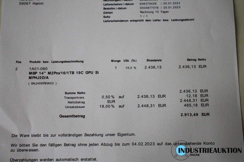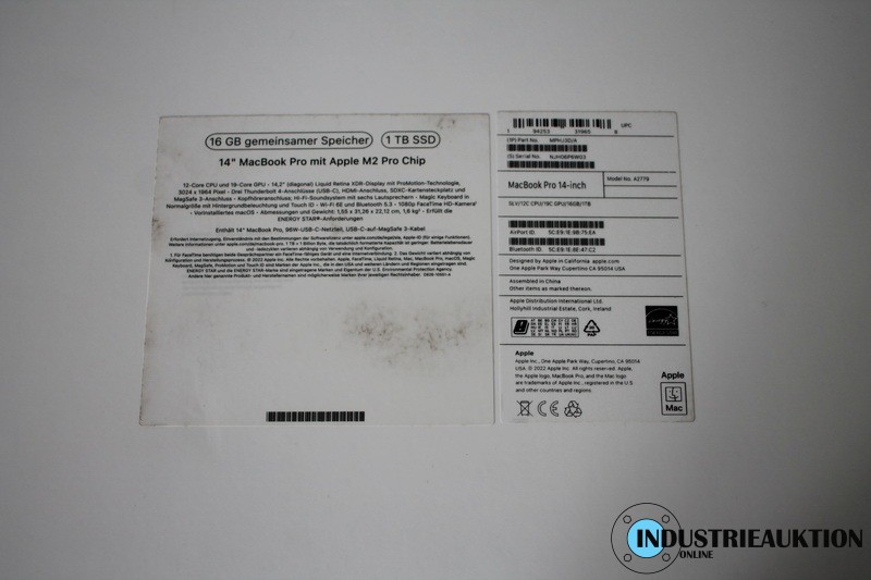 Laptop APPLE MacBook Pro M2, 14", 12 Core, 16 GB RAM, 1 TB SSD, Liquid Retina XDR-Display, S/N NJH06P6W03, Batteriekapazität 98 %, 3x Thunderbold 4, HiFi-Soundsystem mit 6 Lautsprechern, Netzteil, angeschafft 01/23, NP ca. € 2.900, in OVP