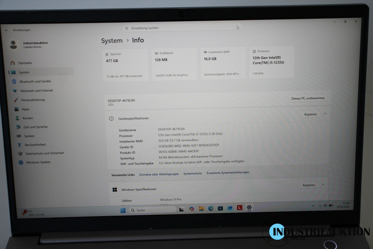 Laptop LENOVO ThinkBook 15 G4 IAP; 15.6", Mod. 11/22, i5-1235U 12. Gen., 1.3 GHz, 16 GB RAM, 500 GB SSD, Win 11 Pro, USB-C Dockingstation