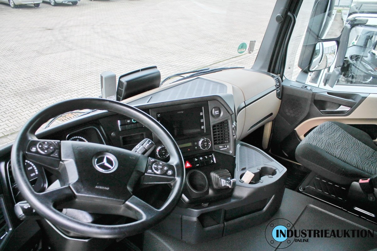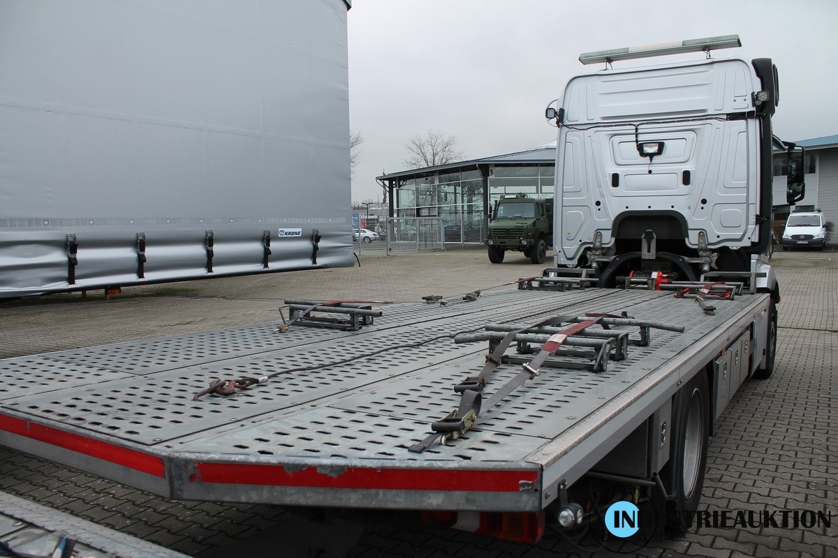 LKW MERCEDES-BENZ ACTROS 1836L Fahrzeugtransporter, FG-Nr. WDB96300410373405, EZ. 07/19, zul. GG 18.000 kg, abgel. km-Stand 461.189, EURO6, HU 08/23, SP 02/23, 10.877 cm³, 265kW, Silber, Automatik, ausgerüstet mit Standklimaanlage, Doppelbett, eingebautem Kühlschrank, Abstandwarner, Spurassistent, Navigation, Klimaautomatik, MF-Lenkrad, Sitzhz., Lichtbalken, Fahrzeugaufbau MERSCH Dorylus XL, Seilwinde VIME