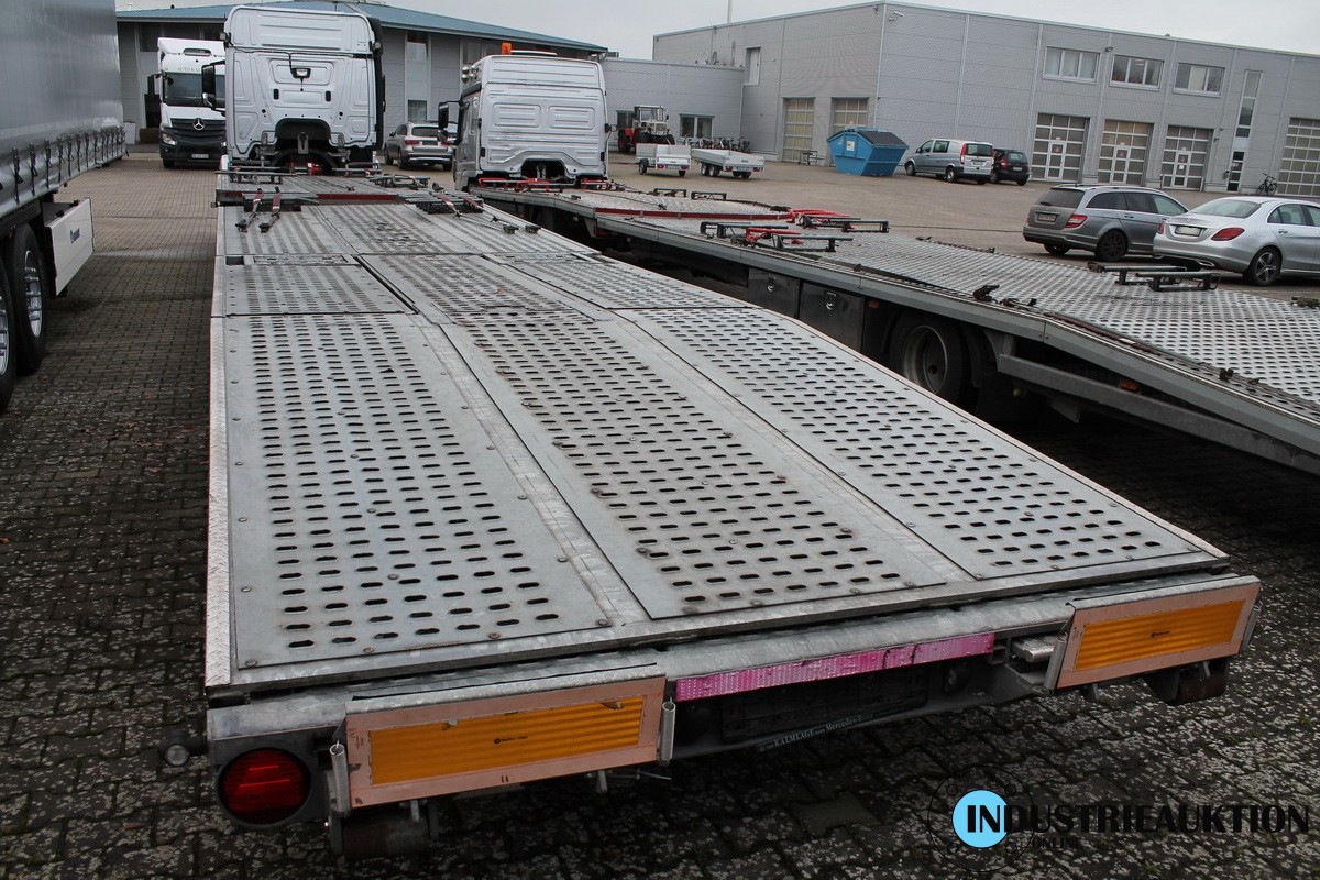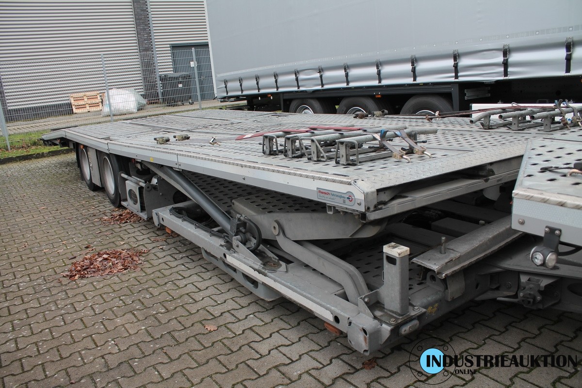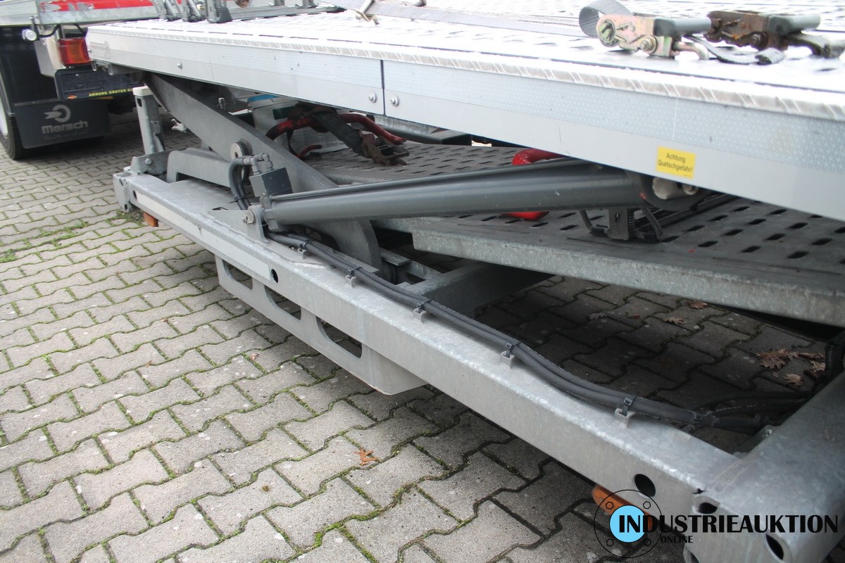 mit LKW-Anhänger MERSCH Formica, Fahrzeugtransporter, FG-Nr. W090F0218KEM40776, EZ 07/19, zul. GG 20.000kg, HU 08/23, ausfahrbar, mit Stapelvorrichtung, verstärkte Achsen für Landmaschinentransport, passend in Verbindung mit Pos. 3 für 4 Ford Custom, Länge 1