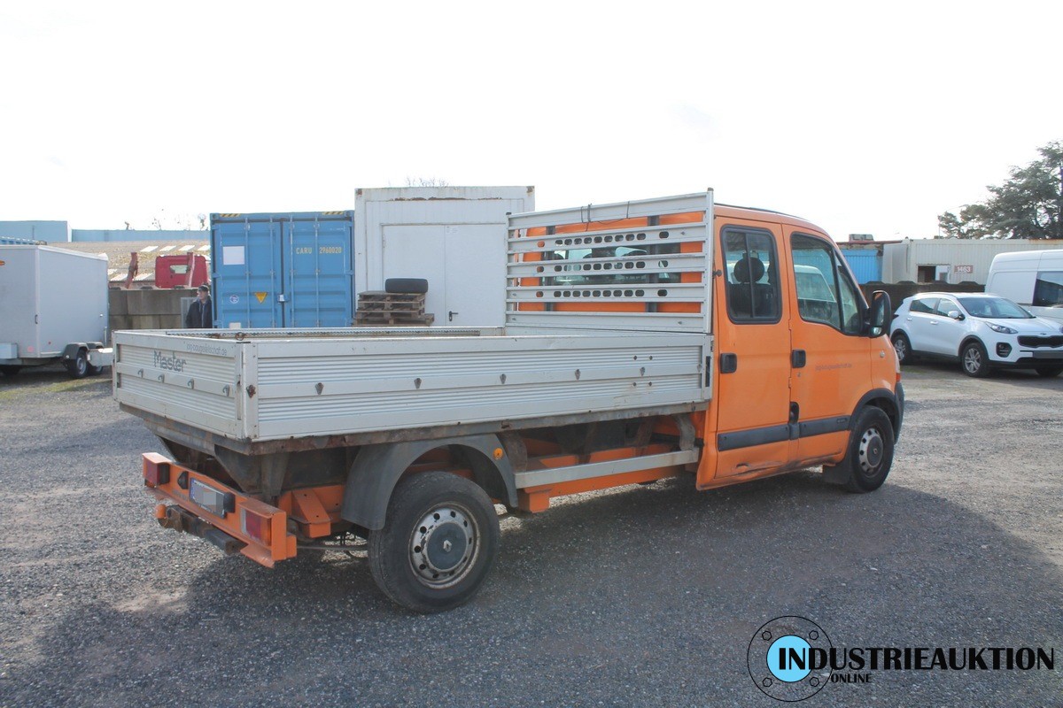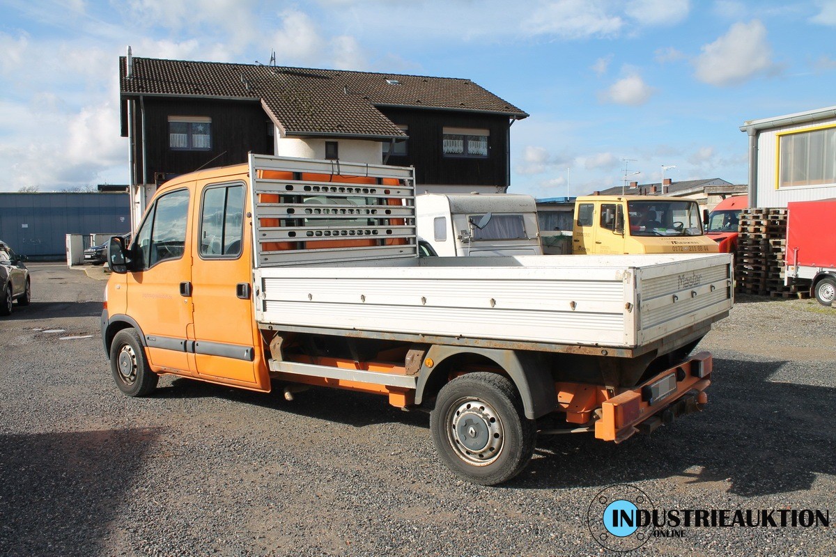 LKW RENAULT Master; Doka Pritsche, FG-Nr. VF1HDCAK641 281460, EZ 04/09, abgel. Km-Stand 231.486, HU abgelaufen, Diesel, 2.464 cm³, 107 kW, zul GG 3,5 to, Schl.-Nr. 3333/AMN, Fahrtenschreiber, Klima, AHK, Baustellenfahrzeug, div. Rostschäden an der Pritsche, Beulen, Radio ohne Funktion(Code), Fahrbereit, ggfls,. Batterie leer
