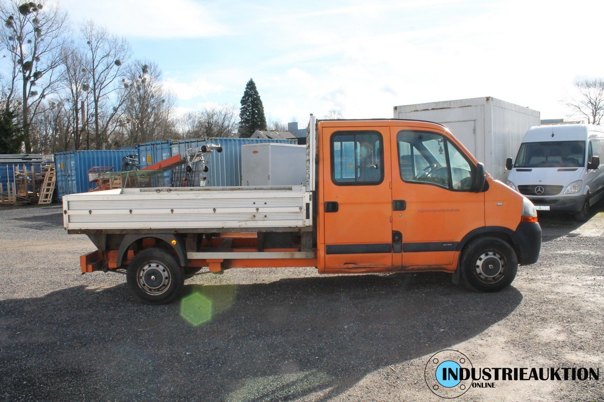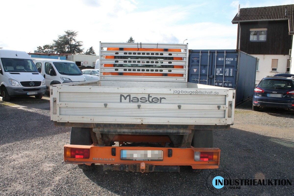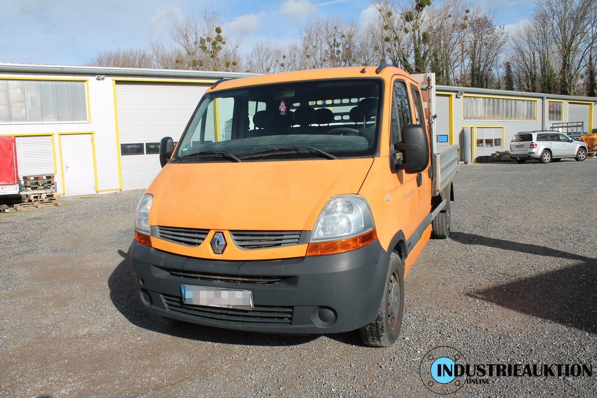 LKW RENAULT Master; Doka Pritsche, FG-Nr. VF1HDCAK641 281460, EZ 04/09, abgel. Km-Stand 231.486, HU abgelaufen, Diesel, 2.464 cm³, 107 kW, zul GG 3,5 to, Schl.-Nr. 3333/AMN, Fahrtenschreiber, Klima, AHK, Baustellenfahrzeug, div. Rostschäden an der Pritsche, Beulen, Radio ohne Funktion(Code), Fahrbereit, ggfls,. Batterie leer
