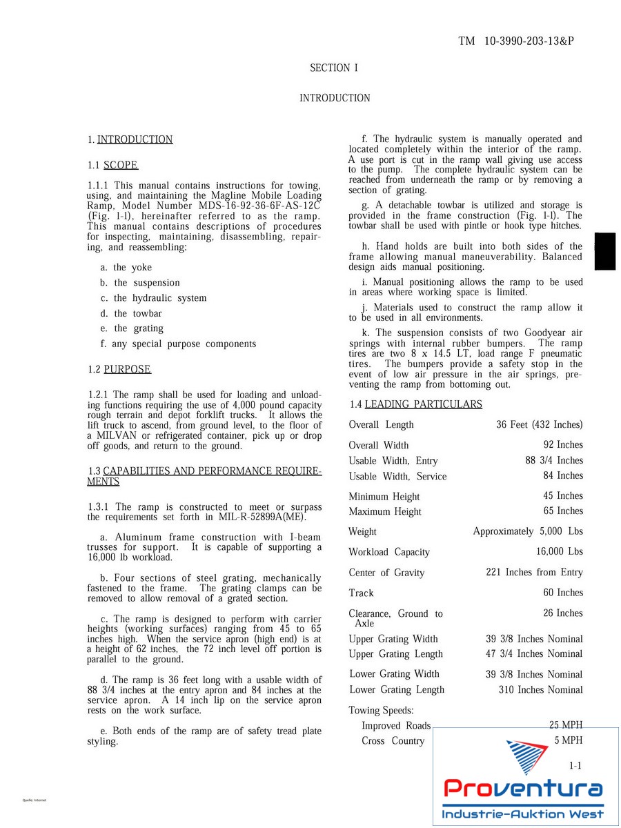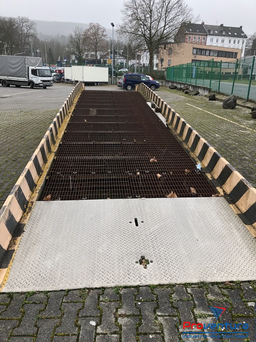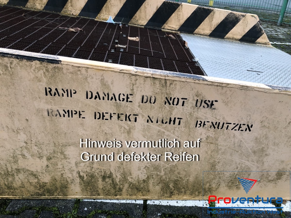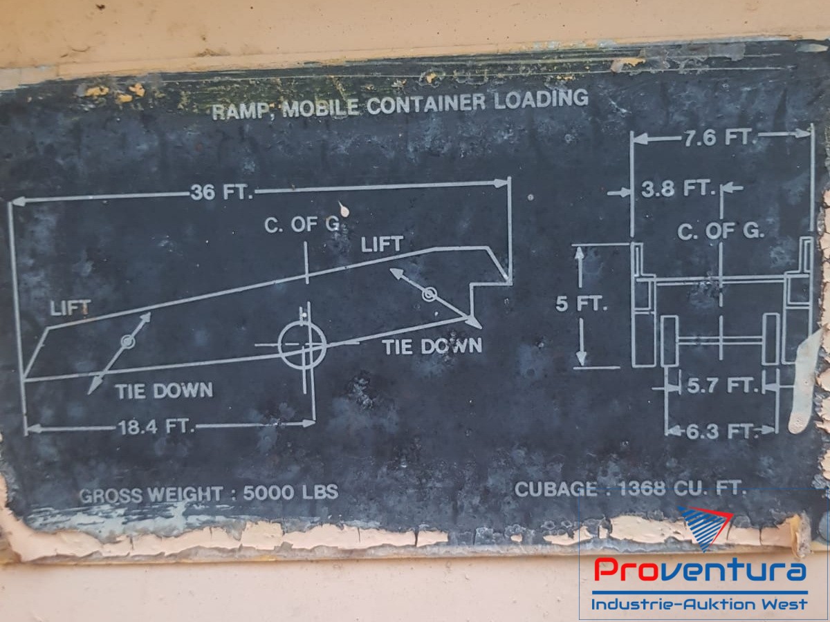 | Mobile Container-Verladerampe MAGLINE MDS-16-92-36-6F-AS-12C, Alu-Rahmenkonstruktion, Länge ca. 11 m, Breite über alles ca. 2.3 m, nutzbare Breite ca. 2.1 m, Höhe ca. 115 - 165 cm, Tragkraft ca. 7.2 t, Gewicht ca. 2.3 t, Schwerpunkt ca. 5.6 m vom Eingang, Reifen evtl. defekt, umfangreiche Infos siehe PDF |