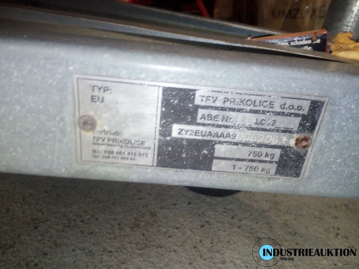 PKW-Anhänger TPV, Plane + Spriegel, FG-Nr.ZY2EUAAAA90062063, EZ 08/10, zul. GG 750 kg, HU 11/24, gebrauchter Zustand