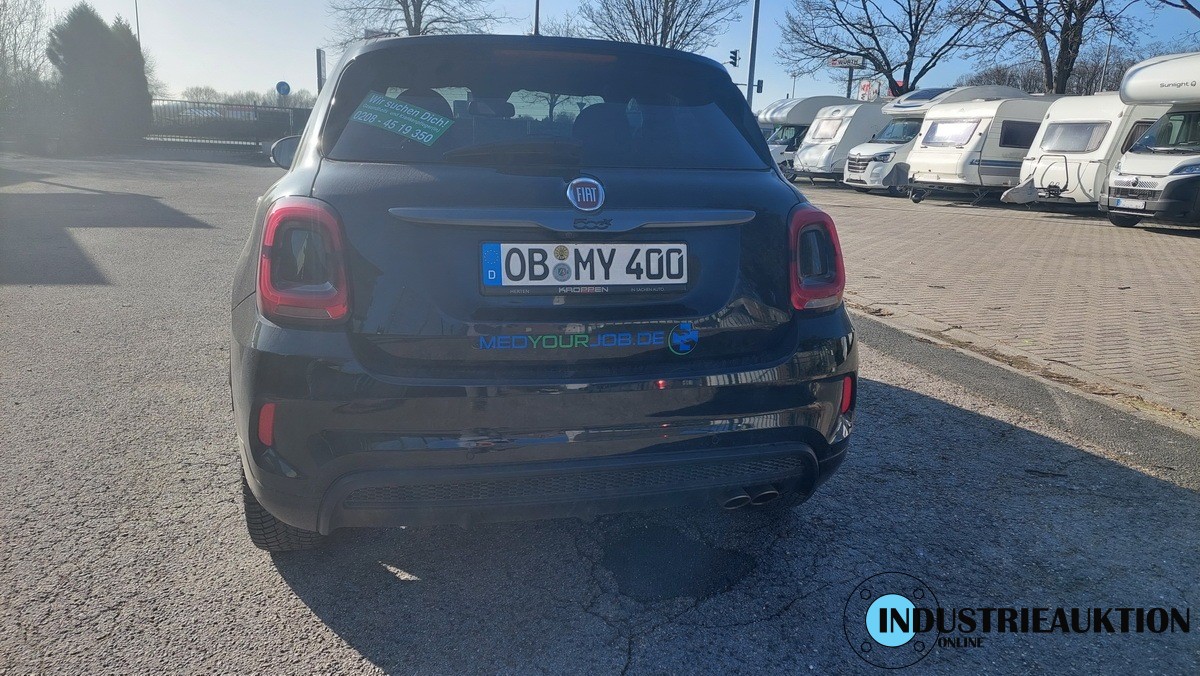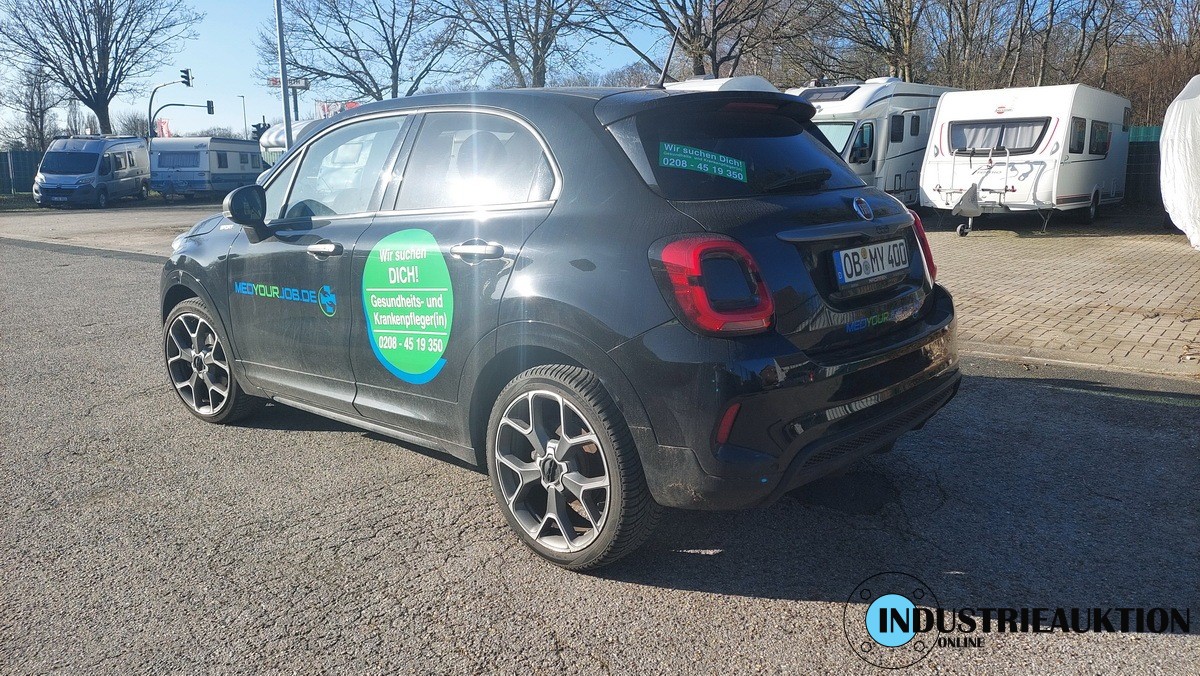 PKW FIAT 500X Sport 1.3 (334), amtl. Kennz. OB-MY 400, EZ 06/22, FG-Nr. ZFANF2C12MP971235, km-Stand abgel. 63.791, Benzin, EURO6, 1332 cm³, 110 kW, Schwarz, Winter-Paket, X-Tech Paket, Automatik, Klima, Sitzhz., Navi, Bluetooth, Tempomat, 19" Räder, vorne beschädigt, Kratzer, Gebrauchsspuren, Felgen mit Bordsteinschäden, - ZBII bei der Bank