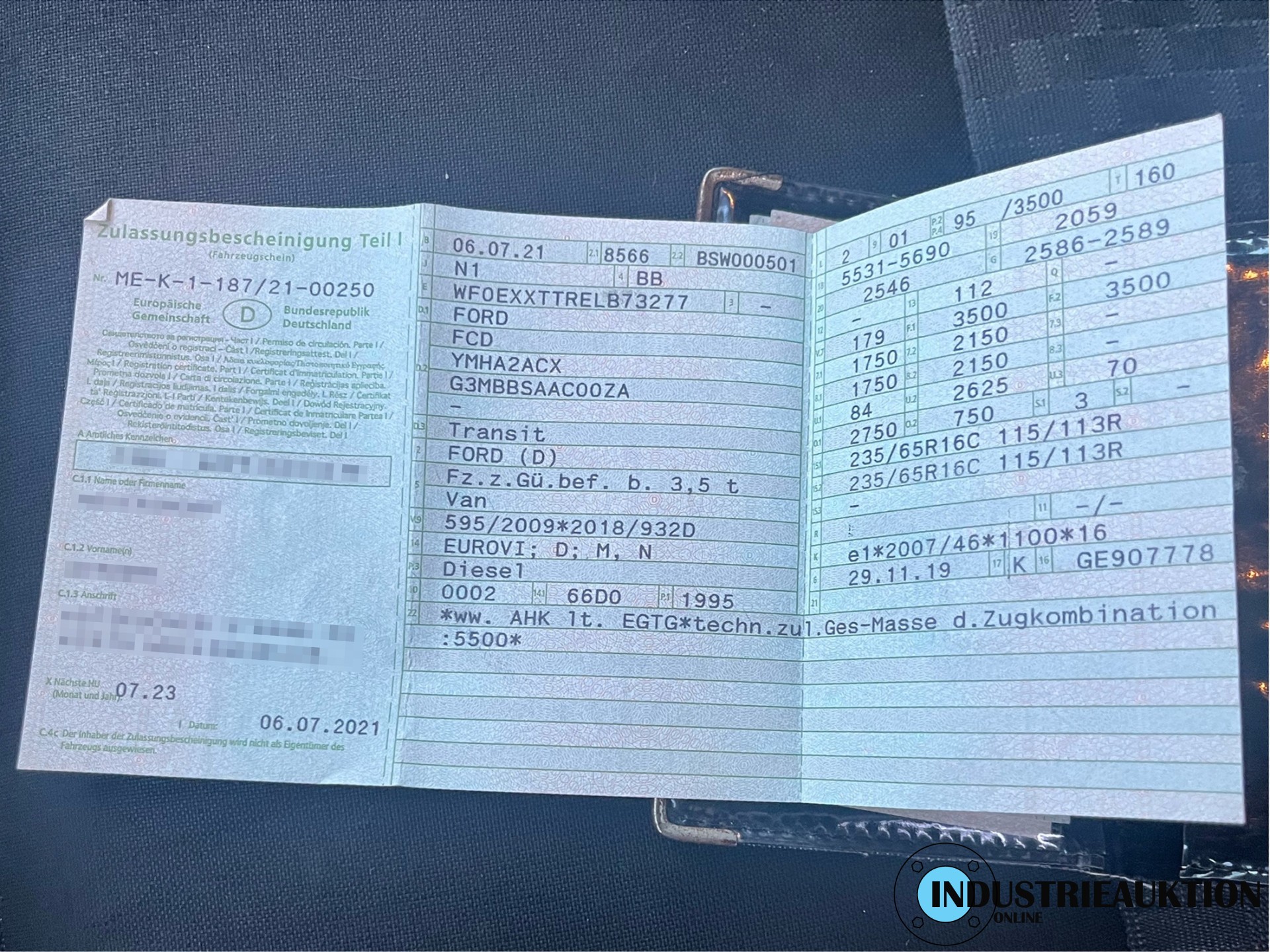 VAN FORD Transit 350, Isolierkasten, FG-Nr. WF0EXXTTRELB73277, EZ 07/21, abgel. Km-Stand ca, 59.300, zul. GG 3500kg, Diesel, EURO6, 1995cm³, 95 kW, HU 07/27, Klima, AHK, 2 Schiebetüren, CONNY COOLER Frischdienst-Ausbau, guter Zustand