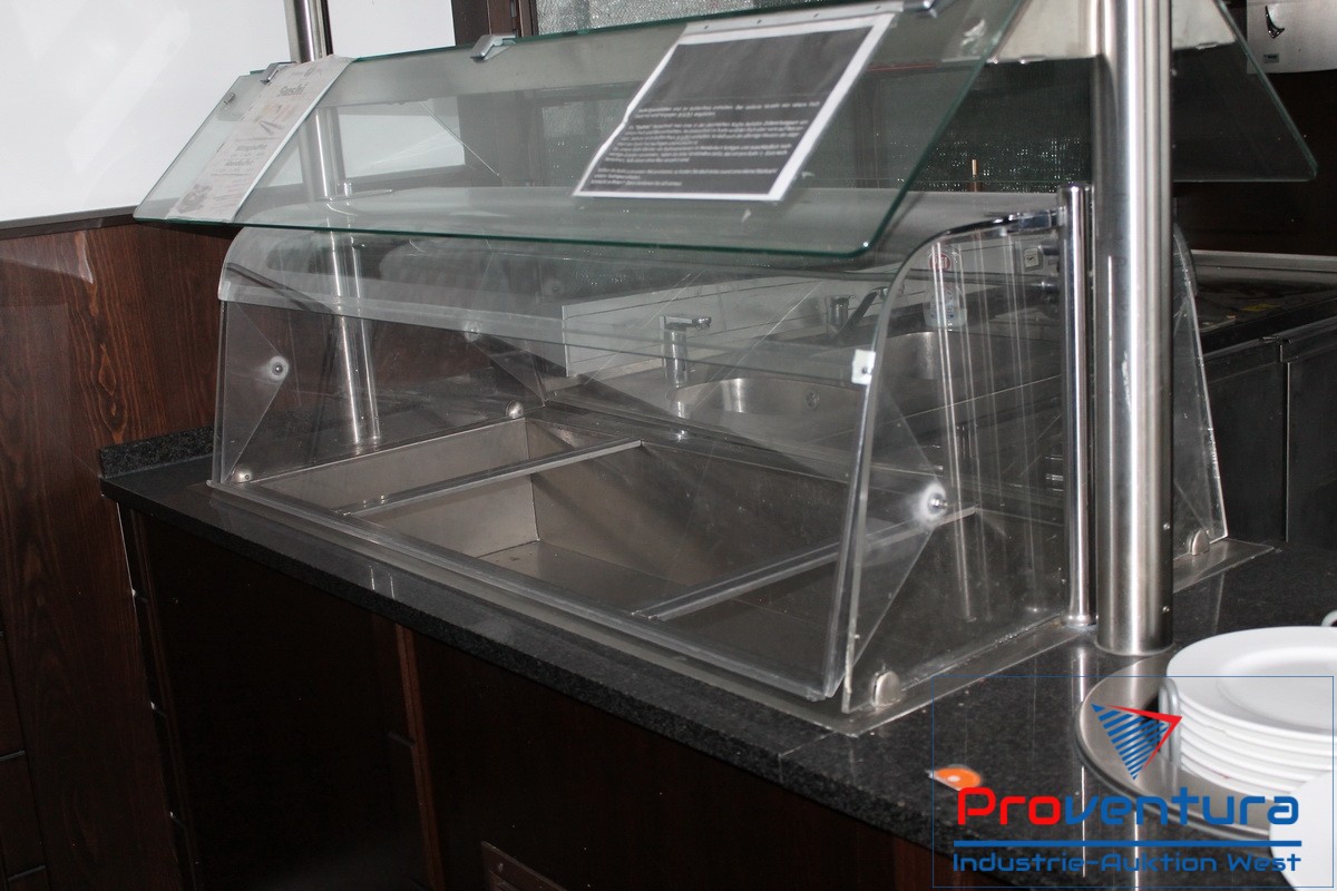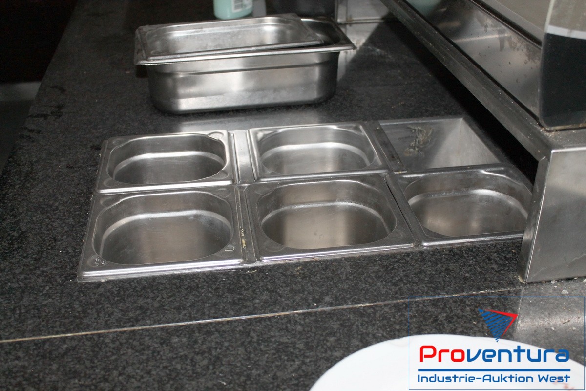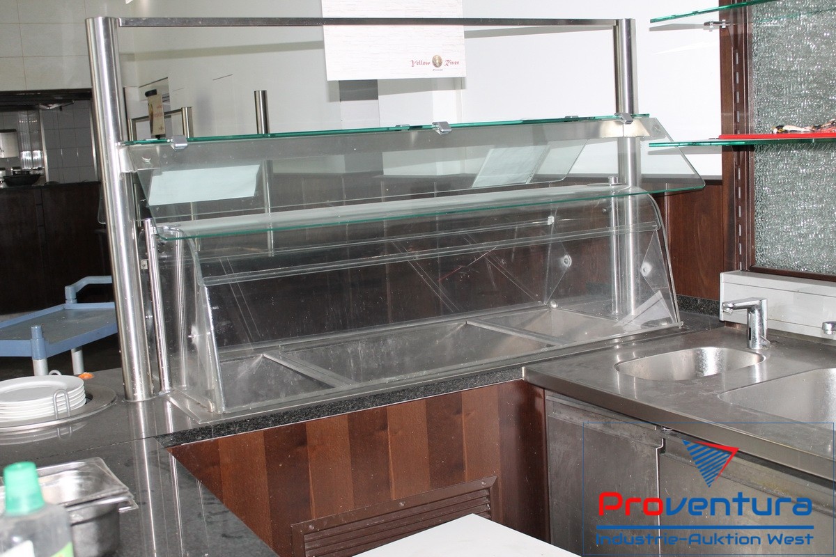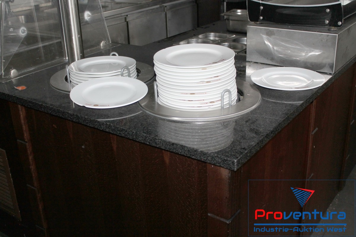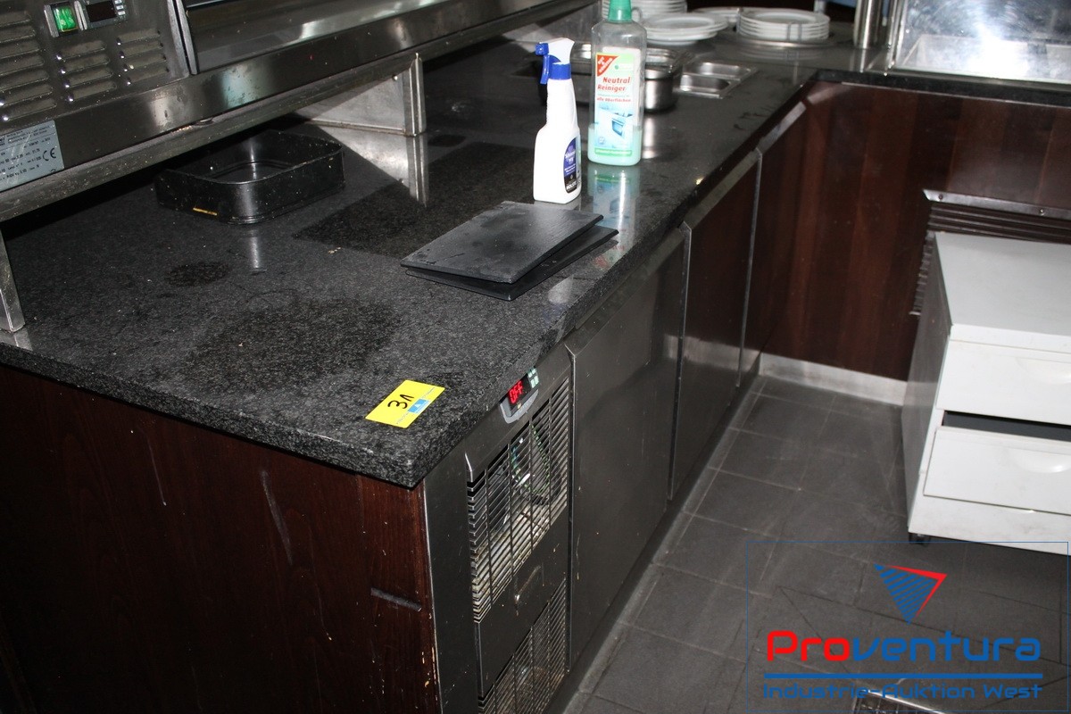 Thekenelement L-Form, ca. 260x260 cm Tisch-Tiefe ca. 90 cm und 75 cm, mit Kühltisch 3-türig, integr. Kühlung, Einsatz GN 1/1, beidseitig benutzbare Bain Marie 4x GN 1/1 mit Plexiglashaube, schwarze Steinplatte, Tellerwärmer 2 Schächte, Holzvertäfelung