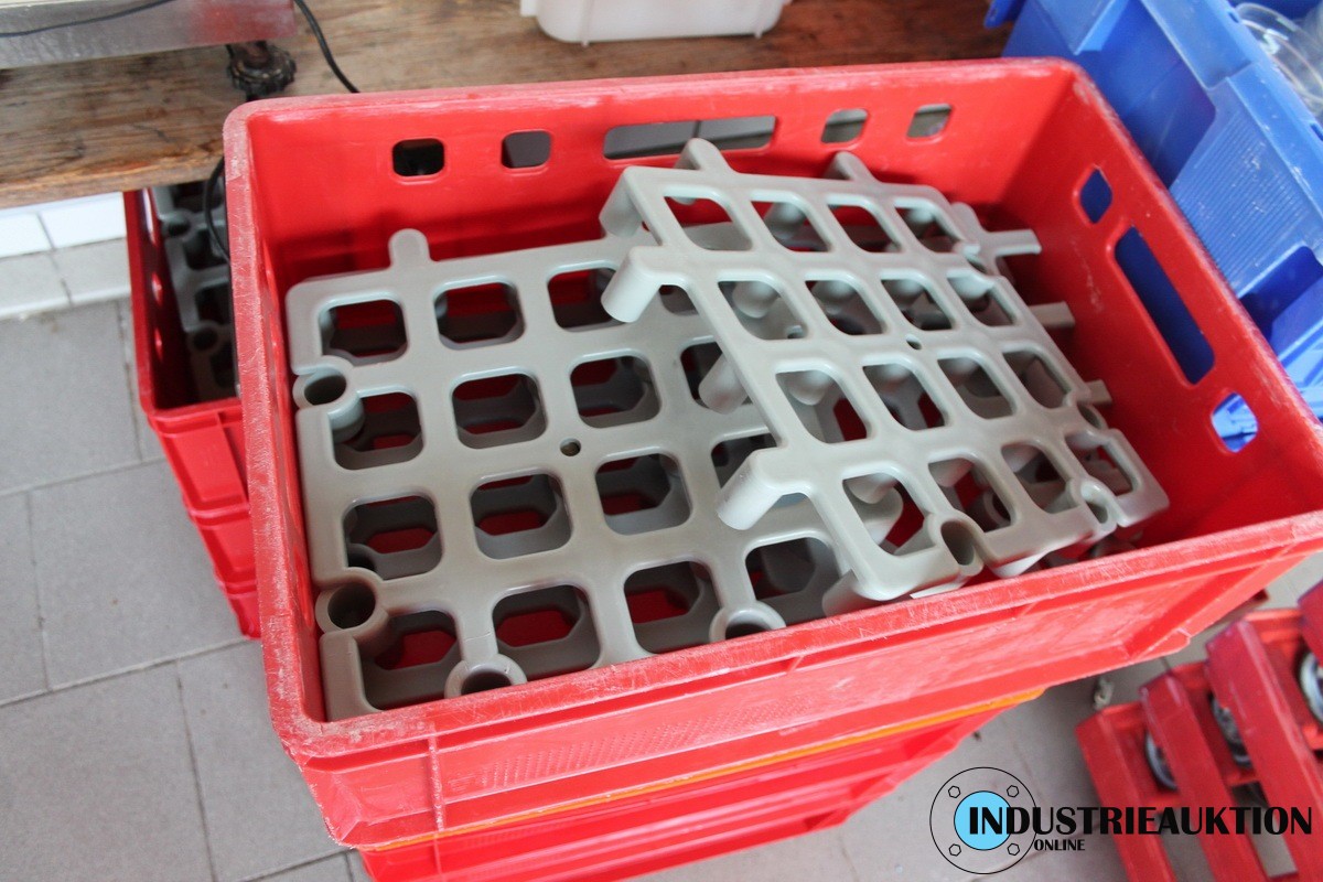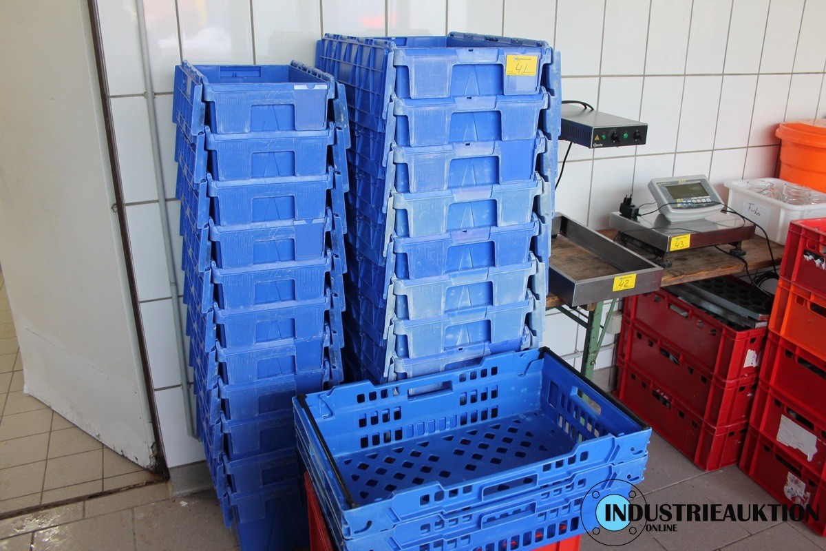 Transportbehälter mit Klappdeckel, ca. 25 St., unterschiedliche Größen, 7 St. mobile Untergestelle, 5 St. Transportboxen mit Abstandsuntersetzern für Umluftkühlschränke