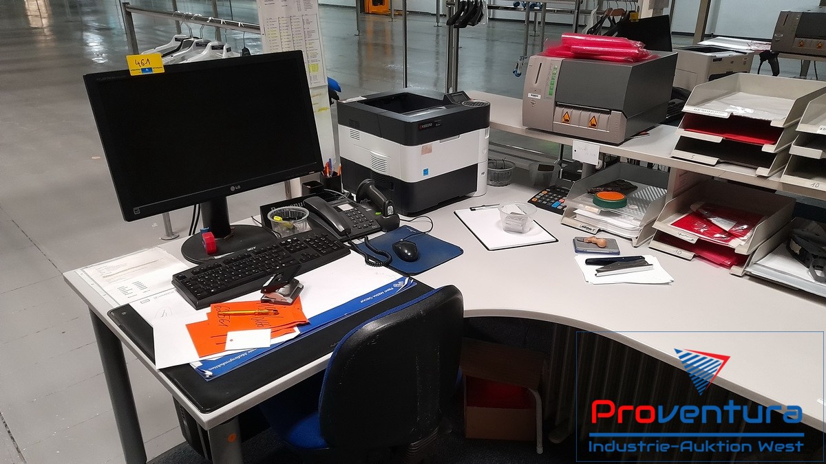 Versandplatz, bestehend aus PC HP, Core i3-Prozessor, 24"-Monitor, Laserdrucker KYOCERA P3055DN, Etikettendrucker BIZERBA, Schreibtisch, Drehstuhl