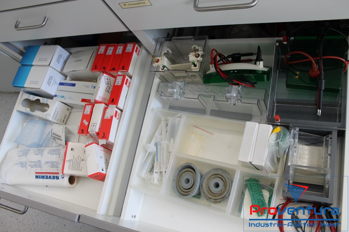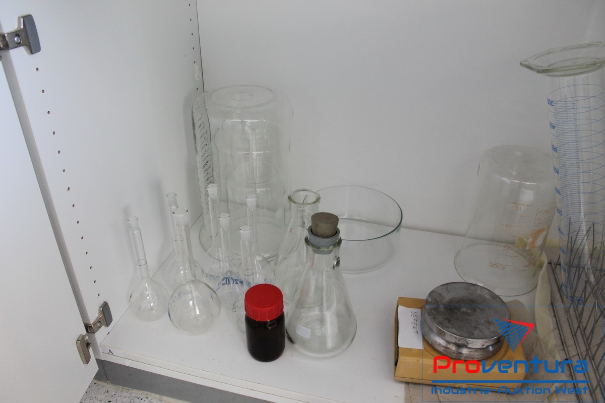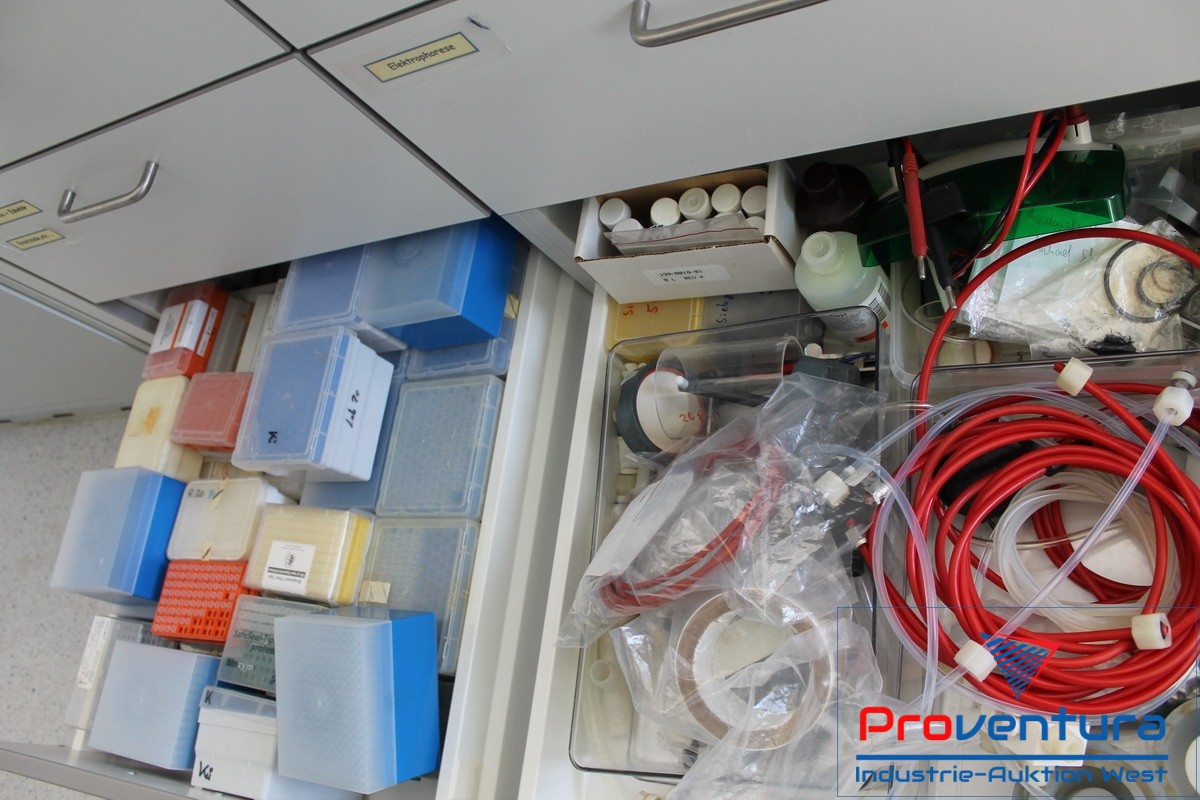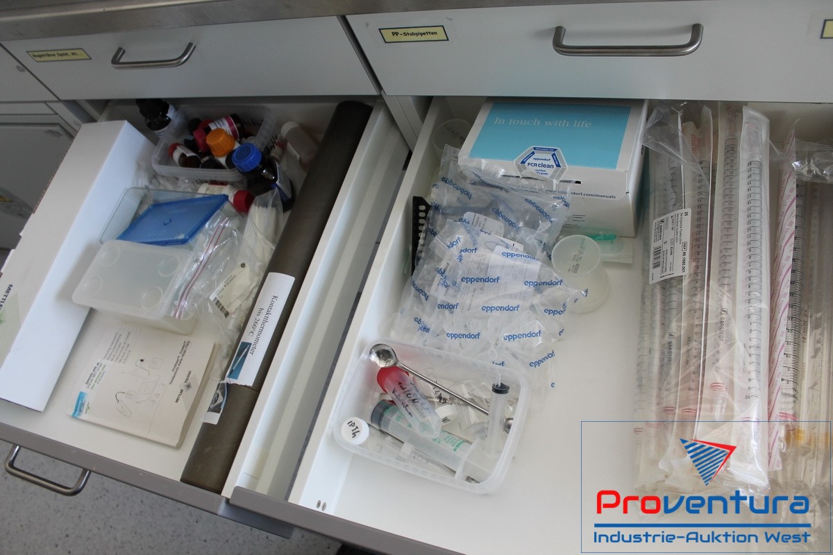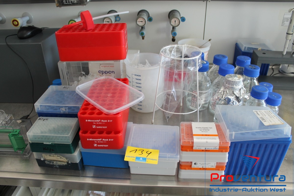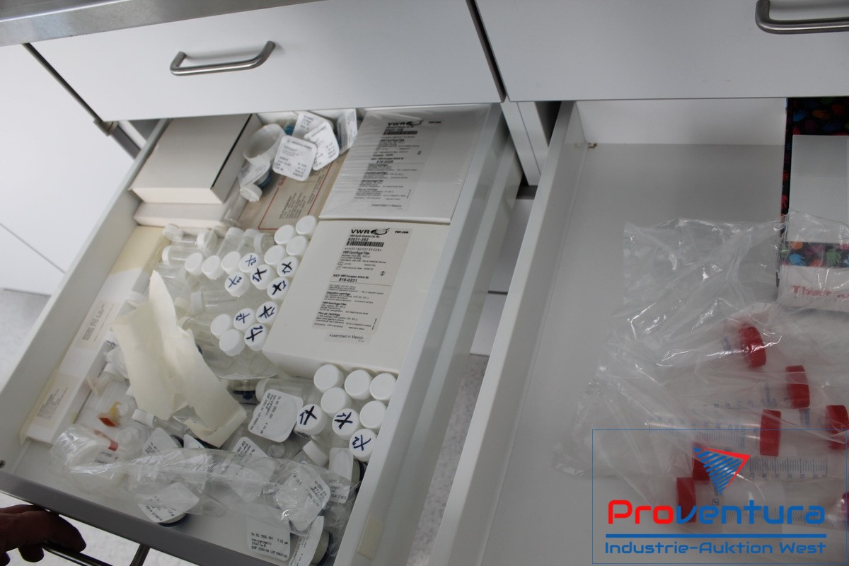 Laborausstattung, Glasflaschen, Monovetten, Erlenmeyerkolben, Mikropipetten, siehe Fotos