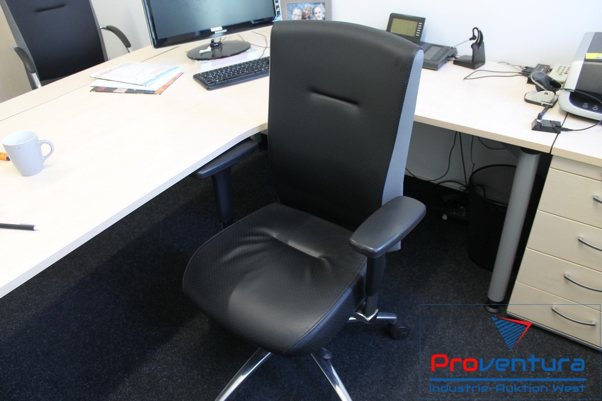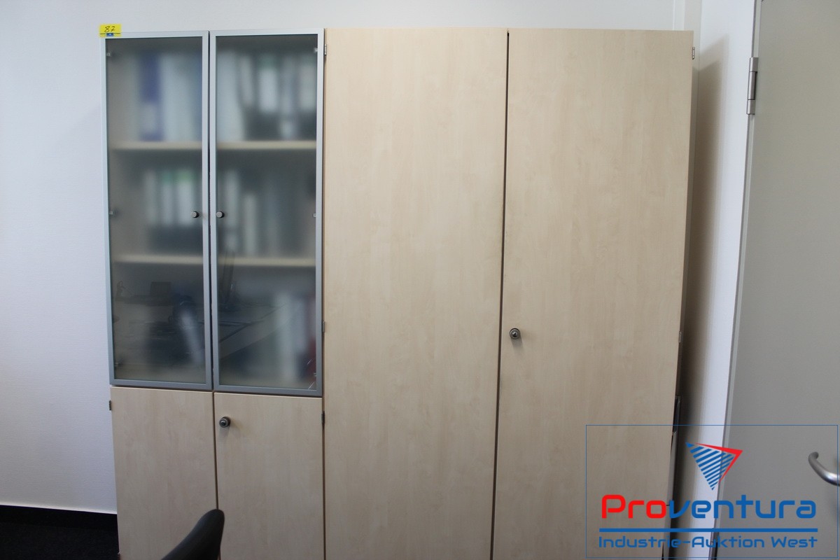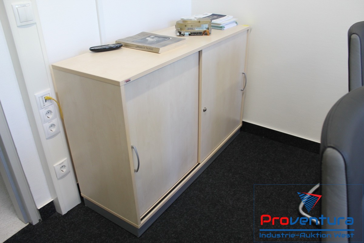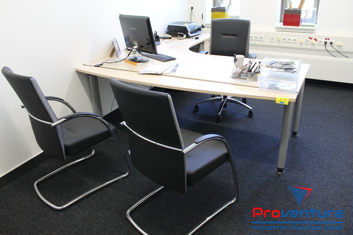 Mobiliar, Anschaffung 08, Schreibtischwinkel mit Schubladencontainer, 2 Schiebetüren-Sideboards, ca. 2,5 lfm Aktenschrank, Bürodrehsessel, 2 Besucherstühle