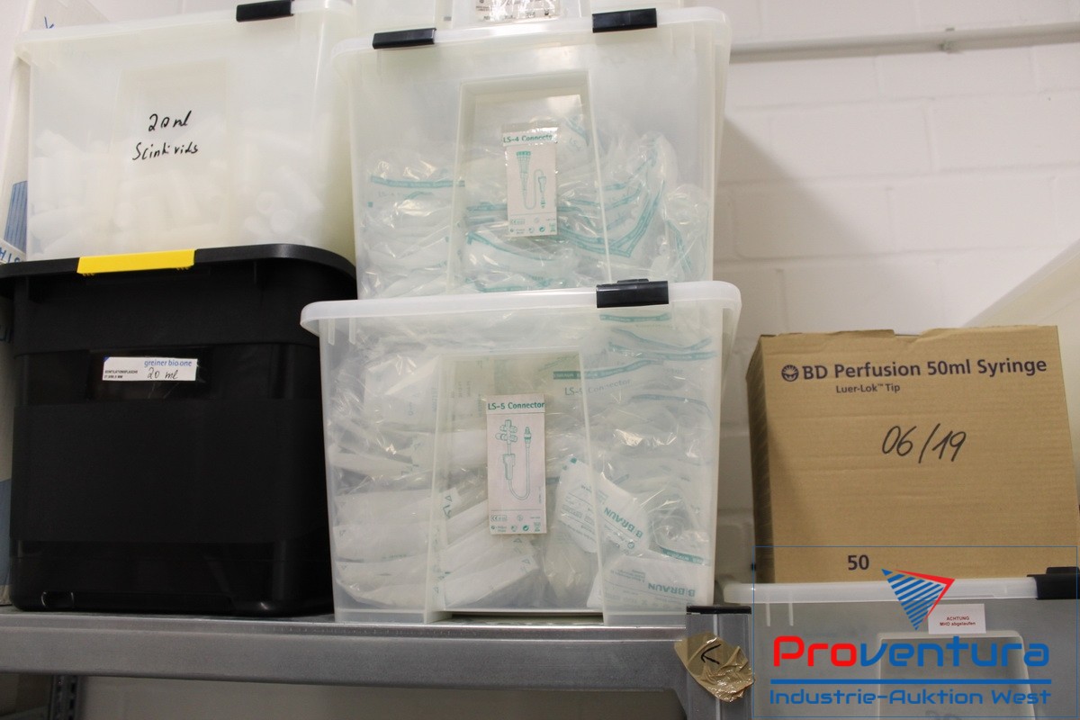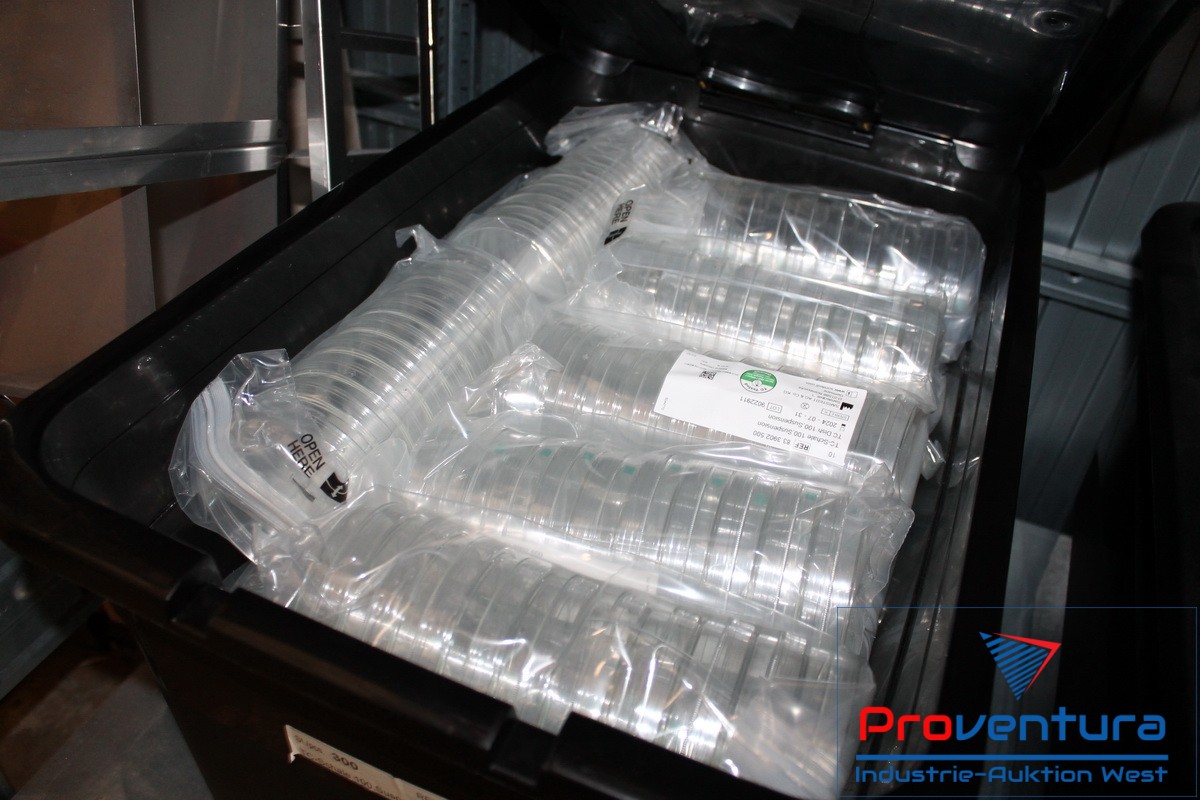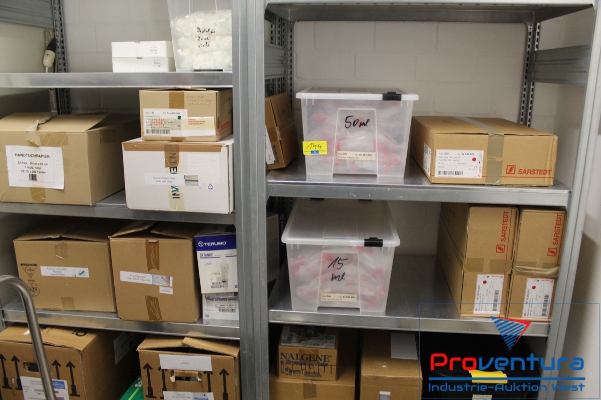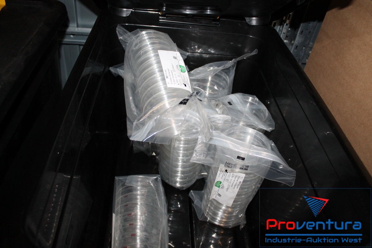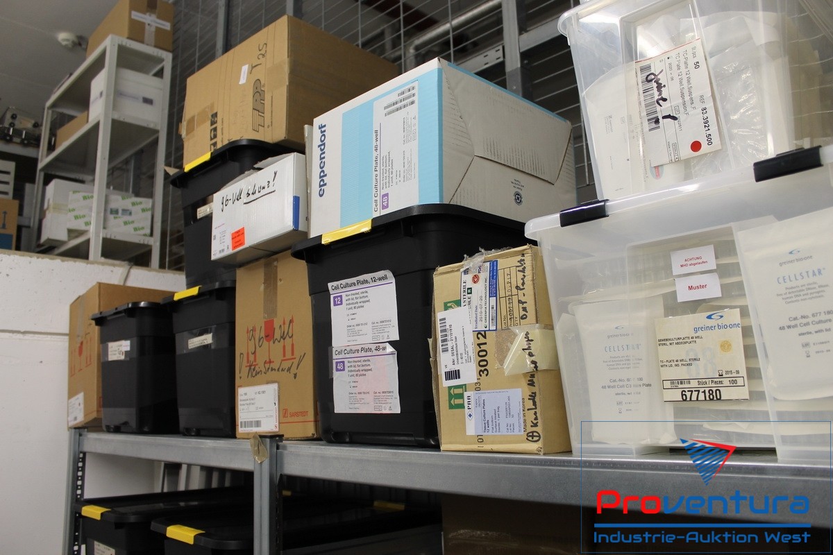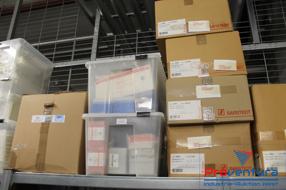 Verbrauchsmaterial, ca. 40 Kunststoff-Transportboxen mit Deckel, ca. 50 Kartons, unterschiedl. Inhalte, Kunststoffflaschen, Mikrotestplatten, Zellkulturplatten, Reagiergefäße, Röhren, Eindruckstopfen, Reagenz- und Zentrifugenröhren, Pipettenspitzen, Reagiergefäße, TC-Platten, Kanülen, Kombitips, siehe Fotos